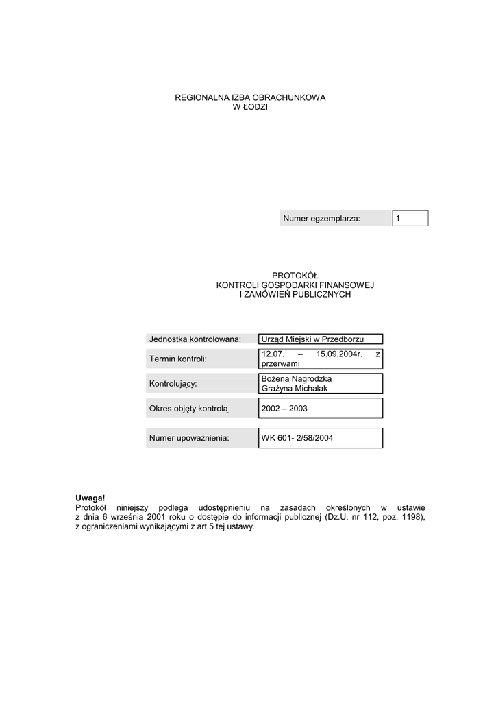 REGIONALNA IZBA OBRACHUNKOWA W ŁODZI Numer egzemplarza: 1 PROTOKÓŁ KONTROLI GOSPODARKI FINANSOWEJ I ZAMÓWIEŃ PUBLICZNYCH Jednostka kontrolowana: Urząd Miejski w Przedborzu Termin kontroli: 12.07. – przerwami Kontrolujący: BoŜena Nagrodzka GraŜyna Michalak Okres objęty kontrolą 2002 – 2003 Numer upowaŜnienia: WK 601- 2/58/2004 15.09.2004r. z Uwaga! Protokół niniejszy podlega udostępnieniu na zasadach określonych w ustawie z dnia 6 września 2001 roku o dostępie do informacji publicznej (Dz.U. nr 112, poz. 1198), z ograniczeniami wynikającymi z art.5 tej ustawy. PROTOKÓŁ Z KONTROLI KOMPLEKSOWEJ PRZEPROWADZONEJ W GMINIE PRZEDBÓRZ Regionalna Izba Obrachunkowa w Łodzi, ul. Zamenhofa 10 90-431 Łódź, tel. 42-6366896, fax 6367424 I. INFORMACJE WSTĘPNE DANE O JEDNOSTCE Gmina Przedbórz połoŜona jest w powiecie radomszczańskim, w województwie łódzkim i obejmuje obszar o powierzchni 18,994 ha, w tym: -miasto 613 ha -wioski 18.381 ha Gmina podzielona jest na 28 sołectw, a zamieszkuje ją 8.163 mieszkańców w tym: - kobiet 4.083 - męŜczyzn 4.080 Bezrobocie w gminie Przedbórz na dzień 30.06.2004 wynosiło ogółem 1009 osób zarejestrowanych w Powiatowym Urzędzie Pracy w Radomsku w tym: kobiet 532, absolwentów 51, z prawem do zasiłku 144, ze zwolnieniem dotyczącym zakładu pracy 51, bezrobotni w wieku 18-44 lat 591, bezrobotni pozostający bez pracy powyŜej 12 m-cy 591 Dane identyfikacyjne Gminy Przedbórz NIP 772-11-08-808 REGON 000529060 ADRES 97- 570 Przedbórz ul. Mostowa 29 pow. radomszczański II. USTALENIA OGÓLNE 1. KIEROWNICTWO JEDNOSTKI Przewodniczący rady gminy Funkcje przewodniczącego Rady Miejskiej w Przedborzu w okresie objętym kontrolą pełnili: Pani Hanna Szczepańska- Gaj – wybrana z datą 29 października 1998 r.(Uchwała nr I/1/98 Rady Miejskiej w Przedborzu), Pan Ryszard Bielecki – wybrany z datą 18 listopada 2002 r. (Uchwała nr I/01/02 Rady Miejskiej w Przedborzu). Wójt, burmistrz, prezydent i ich zastępcy Członkowie Zarządu Miejskiego w Przedborzu wybrani zostali z datą 12 listopada 1998 r. ( Uchwała nr III/5/98 Rady Miejskiej w Przedborzu): Pan Władysław Obarzanek, Pan Andrzej Podlasiński, Pan Marian Adamczyk. Funkcję Burmistrza w okresie objętym kontrolą pełni Pan Wojciech Ślusarczyk wybrany na stanowisko Uchwałą nr I/3/98 Rady Miejskiej w Przedborzu z datą 29 października 1998r. oraz _____________________________________________________ 2 PROTOKÓŁ Z KONTROLI KOMPLEKSOWEJ PRZEPROWADZONEJ W GMINIE PRZEDBÓRZ Regionalna Izba Obrachunkowa w Łodzi, ul. Zamenhofa 10 90-431 Łódź, tel. 42-6366896, fax 6367424 stosownie do art. 22 ustawy z dnia 20 czerwca 2002 r. o bezpośrednim wyborze wójta, burmistrza i prezydenta miasta, ( Dz.U. Nr 113, poz. 984 i Nr 127, poz. 1089) wybrany z datą 10 listopada 2002 r. (zaświadczenie Miejskiej Komisji Wyborczej w Przedborzu). Funkcję zastępcy burmistrza w okresie objętym kontrolą pełnili: Pan Jarosław Chudy wybrany Uchwałą Nr III/4/98 Rady Miejskiej w Przedborzu z datą 12 listopada 1998 r. Pan Witold Sobolewski powołany od dnia 1 stycznia 2003 zarządzeniem Nr 12/2002 Burmistrza Miasta Przedborza z datą 23 grudnia 2002 r. Skarbnik Gminy Skarbnikiem Gminy i Miasta Przedbórz jest od dnia 29 czerwca 1990 r. Pani Alicja Grochola powołana na to stanowisko Uchwałą Rady Miejskiej Nr III/11/90 z datą 29 czerwca 1990 r. Sekretarz Gminy Funkcje Sekretarza Miasta Przedborza pełnili: Pan Józef Krawczyk ( Uchwała Rady Miejskiej w Przedborzu Nr V/19/98 z datą 9 grudnia 1998 r.), Pani Maria Szwed ( Uchwała Nr I/04/02 Rady Miejskiej w Przedborzu z datą 18 listopada 2002r.) 2. GMINNE JEDNOSTKI ORGANIZACYJNE I PRAWNOORGANIZACYJNE FORMY ICH DZIAŁALNOŚCI W celu wykonywania zadań Rada Miejska w Przedborzu działając z upowaŜnienia określonego w art. 18 ust. 1 pkt 9h ustawy o samorządzie gminnym (Dz. U. Nr.142, poz. 1551 z późniejszymi zmianami) powołała jednostki organizacyjne, a mianowicie: Samodzielny Publiczny Zakład Opieki Zdrowotnej w Przedborzu (Uchwała Nr IV/16/98 Rady Miejskiej w Przedborzu z data 18 listopada 1998 r. w sprawie przekształcenia Samorządowego Zespołu Ochrony Zdrowia w Przedborzu w Samodzielny Publiczny Zakład Opieki Zdrowotnej). Cele i zadania Samodzielnego Publicznego Zakładu Opieki Zdrowotnej są określone w Statucie zatwierdzonym Uchwałą Nr XVII/104/04 Rady Miejskiej w Przedborzu z datą 23 marca 2004 r.(wcześniej obowiązujący Statut nadany Uchwałą Nr XXVIII/278/02 z datą 22 marca 2002 r.). Miejska Biblioteka Publiczna im. Marii Konopnickiej w Przedborzu, która działa w oparciu o statut nadany przez Radę Miejską w Przedborzu Uchwałą Nr XVIII/139/00 z datą 30 marca 2000 r. i Uchwałą Nr XVII/105 /04 z datą 23 marca 2004 r. Biblioteka jest finansowana z budŜetu miasta i gminy z dochodów własnych i innych źródeł, w szczególności z darowizn. Podstawą gospodarki finansowej Biblioteki jest roczny plan jej działania zatwierdzony przez Dyrektora z zachowaniem wysokości dotacji ustalonej przez Radę Miejską w Przedborzu. Miejski Dom Kultury w Przedborzu działa w oparciu o Statut nadany przez Radę Miejską w Przedborzu Uchwałą Nr XVII/106/04 z datą 23 marca 2004 r.( wcześniej obowiązywał Statut nadany uchwałą Nr XVIII/137/2000 Rady Miejskiej w Przedborzu z datą 30 marca 2000 r.). MDK prowadzi gospodarkę finansową na zasadach określonych w Ustawie z dnia 25 października 1991 r. o organizowaniu i prowadzeniu działalności kulturalnej (Dz. U. z 2001r. , Nr 13, poz. 123 z póz. zm.). Podstawą gospodarki finansowej MDK jest plan roczny działalności zatwierdzony przez dyrektora z zachowaniem wysokości ustalonych przez Radę Miejską w Przedborzu. _____________________________________________________ 3 PROTOKÓŁ Z KONTROLI KOMPLEKSOWEJ PRZEPROWADZONEJ W GMINIE PRZEDBÓRZ Regionalna Izba Obrachunkowa w Łodzi, ul. Zamenhofa 10 90-431 Łódź, tel. 42-6366896, fax 6367424 Dyrektor MDK sporz