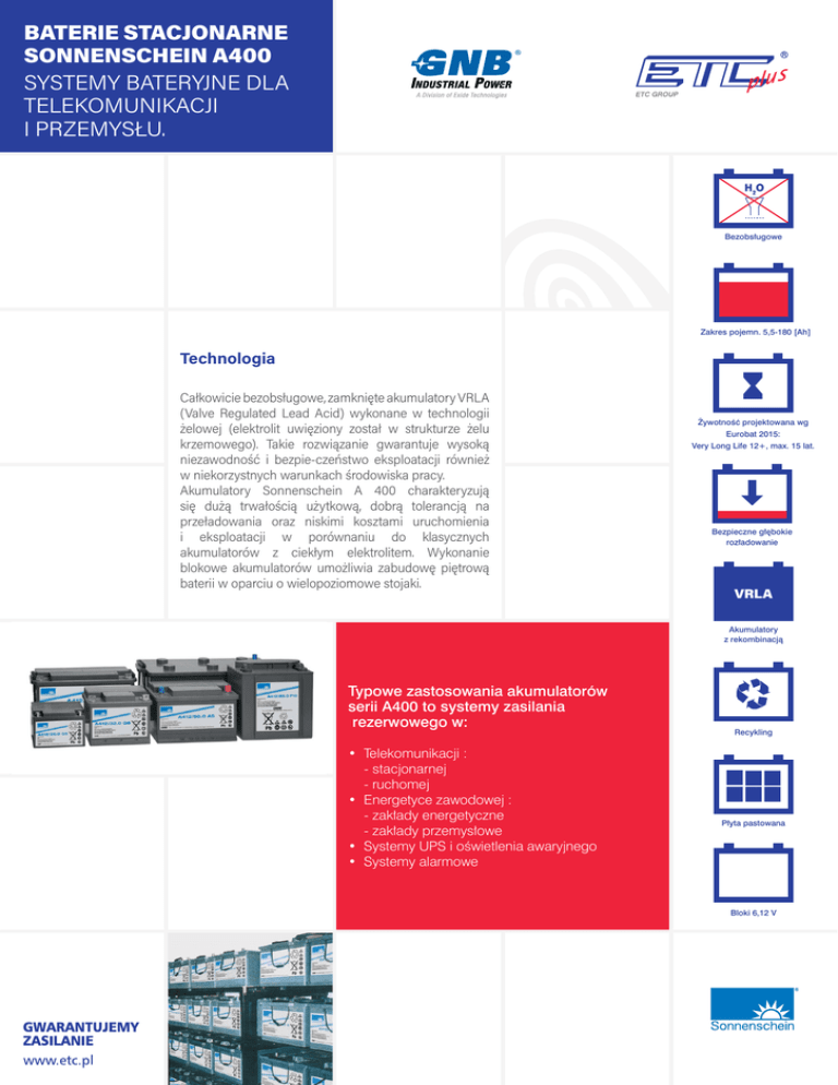 BATERIE STACJONARNE SONNENSCHEIN A400 SYSTEMY BATERYJNE DLA TELEKOMUNIKACJI I PRZEMYSŁU. Bezobsługowe Zakres pojemn. 5,5-180 [Ah] Technologia Całkowicie bezobsługowe, zamknięte akumulatory VRLA (Valve Regulated Lead Acid) wykonane w technologii żelowej (elektrolit uwięziony został w strukturze żelu krzemowego). Takie rozwiązanie gwarantuje wysoką niezawodność i bezpie-czeństwo eksploatacji również w niekorzystnych warunkach środowiska pracy. Akumulatory Sonnenschein A 400 charakteryzują się dużą trwałością użytkową, dobrą tolerancją na przeładowania oraz niskimi kosztami uruchomienia i eksploatacji w porównaniu do klasycznych akumulatorów z ciekłym elektrolitem. Wykonanie blokowe akumulatorów umożliwia zabudowę piętrową baterii w oparciu o wielopoziomowe stojaki. Żywotność projektowana wg Eurobat 2015: Very Long Life 12+, max. 15 lat. Bezpieczne głębokie rozładowanie VRLA Akumulatory z rekombinacją Typowe zastosowania akumulatorów serii A400 to systemy zasilania rezerwowego w: • Telekomunikacji : - stacjonarnej - ruchomej • Energetyce zawodowej : - zakłady energetyczne - zakłady przemysłowe • Systemy UPS i oświetlenia awaryjnego • Systemy alarmowe Recykling Płyta pastowana Bloki 6,12 V BATERIE STACJONARNE SONNENSCHEIN A400 SYSTEMY BATERYJNE DLA TELEKOMUNIKACJI I PRZEMYSŁU. A400 - Specyfikacja: • Wyjątkowy magazyn energii o długim okresie eksploatacji. • Całkowicie bezobsługowe (brak dolewania wody) przez cały okres eksploatacji. • Wieloletnie doświadczenie produkcyjne Exide, Sonnenschein • Zakres pojemności: 5,5 –180 Ah. • Żywotność projektowana wg Eurobat 2015: Very Long Life 12+, max. 15 lat. • Pastowana płyta ze stopem wapniowym • Ekstremalnie niskie gazowanie dzięki wewnętrznej rekombinacji gazów. • Skrajnie niskie samorozładowanie: - po 2 latach składowania (przy 20˚C) - nie ma potrzeby doładowania. • Krótki czas ładowania • Bezpieczne głębokie rozładowanie zgodnie z normą DIN 43539 T5. • Bezproblemowy transport gotowych do pracy bloków. Akumulatory Sonnenschein A 400 mogą być bezpiecznie transportowane powietrzem, koleją lub drogą. (wg.IATA, DGR clause A 67) • Recykling: Akumulatory ołowiowe są wartościowym surowcem. Przetwarzanie powtórnie akumulatorów A 400 przekracza 90%. • Zgodność z normą europejską EN60896-21/22 oraz BS 6290-4. Konstrukcja yy Płyty: pastowane ze stopem wapniowym yy optymalizowane dla zwiększenia odporności na korozję yy Separator: Mikroporowaty dla elektrycznej separacji płyt, optymalizowany dla osiągnięcia minimalnej rezystancji yy Obudowa: do 12 Ah -ABS, od 5,5 Ah do 180 Ah -polipropylen (PP). yy Bieguny: typu A-pol lub śrubowe dla osiągnięcia yy maksymalnego bezpieczeństwa montażu i eksplo-atacji. yy Zawory: bezpieczne, konstruowane w celu wypuszczania nadmiaru gazów z akumulatorów. 100% produkowanych zaworów jest sprawdzanych w toku produkcji. GNB® Industrial Power jest częścią Exide Technologies® odpowiedzialną za rozwój, produkcję i logistykę akumulatorów przemysłowych. Szczegóły znajdą Państwo na stronie korporacyjnej www.exide.com BATERIE STACJONARNE SONNENSCHEIN A400 SYSTEMY BATERYJNE DLA TELEKOMUNIKACJI I PRZEMYSŁU. Typ Napięcie znamion. [V] Poj. znamion. C10 [Ah] Prąd rozładowania I10 [A] Max. obc.*) [A] Max. 5 s prąd rozładowania [A] Waga [kg] Długość [mm] Szer. [mm] Wys. do pokrywy [mm] Max. wys. [mm] Rodzaj wyprowadz. A 406/165,0 A 6 165,0 16,50 770 2600 28,0 246,0 190,0 254,0 275,0 A (DIN) A 412/5,5 SR 12 5,5 0,55 80 300 2,5 152,0 65,0 94,5 98,4 S 6,3 A 412/8,5 SR 12 8,5 0,85 80 300 3,6 152,0 98,0 94,5 98,4 S 6,3 A 412/12,0 SR 12 12,0 1,20 100 350 5,6 181,0 76,0 152,0 156,4 S 6,3 A 412/20,0 G5 12 20,0 2,00 200 800 7,7 176,0 167,0 126,0 126,0 M 5 mm A 412/32,0 G6 12 32,0 3,20 400 1500 13,6 210,0 175,0 175,0 175,0 M 6 mm A 412/50,0 A 12 50,0 5,00 440 1500 18,5 278,0 175,0 190,0 190,0 S 4,8 A 412/50,0 G6 12 50,0 5,00 440 1500 18,5 278,0 175,0 190,0 190,0 M 6 mm A 412/65,0 G6 12 65,0 6,50 440 1500 23,0 353,0 175,0 190,0 190,0 M 6 mm A412/85 F10 12 85,0 8,50 770 2600 32,0 204,0 244,0 250,0 276,0 F M10 A 412/90,0 A 12 90,0 9,00 770 2600 33,0 284,0 267,0 208,0 230,0 A (DIN) A 412/100,0 A 12 100,0 10,0 770 2600 36,5 513,0 189,0 195,0 223,0 A (DIN) A 412/120,0 A 12 120,0 12,0 770 2600 45,5 513,0 223,0 195,0 223,0 A (DIN) A 412/180,0 A 12 180,0 18,0 770 2600 64,0 518,0 274,0 216,0 242,0 A (DIN) *) Tylko przy prawidłowym połączeniu. Wymagania dotyczące składowania, transportu oraz eksploatacji akumulatorów znajdują się w instrukcji eksploatacji akumulatorów A400 Szczegółowe dane techniczne są dostępne pod adresem : [email protected] Sonnenschein A400 Zakres pojemności C10 do 1,80V 5,5 – 180 [Ah] Trwałość projektowana wg Eurobat 2015 Very Long Life 12+, max. 15 lat. Trwałość w cyklach [zg.IEC] 600 Samorozładowanie na dzień < 0,05 [%] Napięcie ładowania buforowego przy 20˚C 2,27 [V/ogniwo] Napięcie ładowania dla pracy cyklicznej przy 20˚C 2,3 [V/ogniwo] PROJEKTOWANIE INSTALACJE REMONTY I MODERNIZACJA PRZEGLĄDY UTYLIZACJA SERWIS ETC plus sp. z o.o. ul. Drukarska 14 27-400 Ostrowiec Świętokrzyski tel. +48 41 26 36 811 fax:+48 41 26 54 443 kom.+48 604 49 79 92 e-mail:[email protected]
