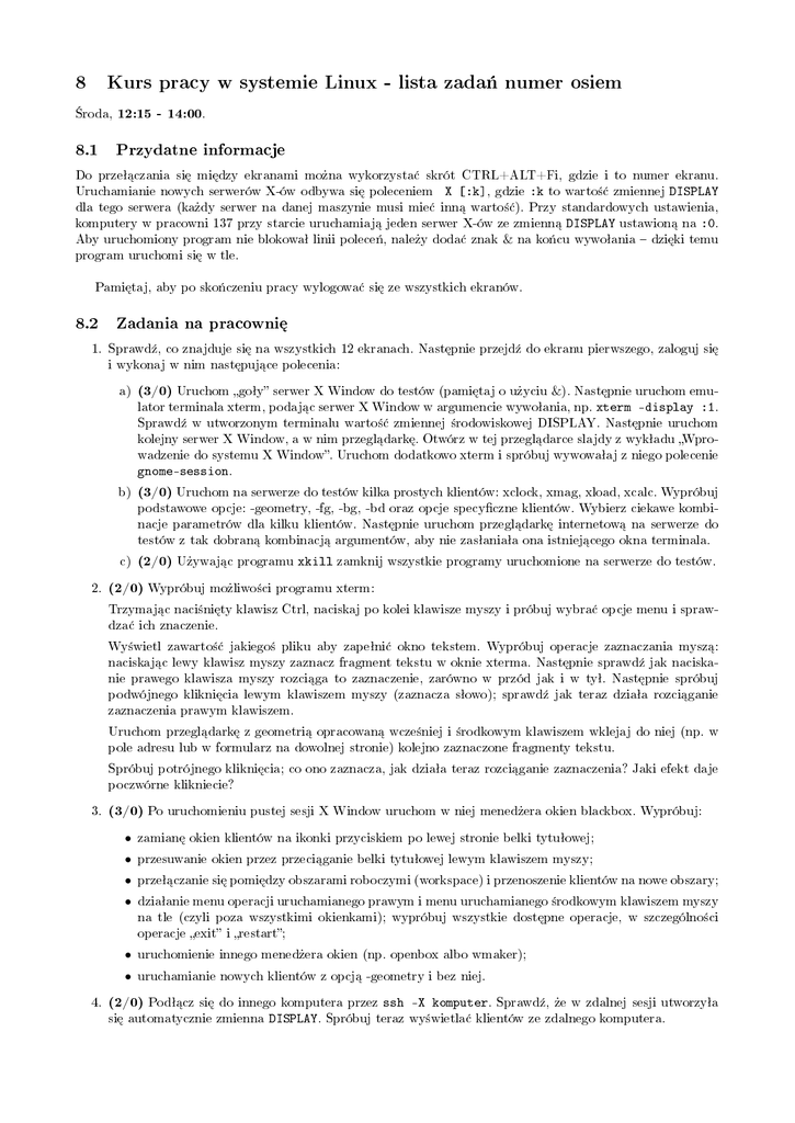 8 Kurs pracy w systemie Linux - lista zada« numer osiem roda, 12:15 - 14:00. 8.1 Przydatne informacje Do przeª¡czania si¦ mi¦dzy ekranami mo»na wykorzysta¢ skrót CTRL+ALT+Fi, gdzie i to numer ekranu. Uruchamianie nowych serwerów X-ów odbywa si¦ poleceniem X [:k], gdzie :k to warto±¢ zmiennej DISPLAY dla tego serwera (ka»dy serwer na danej maszynie musi mie¢ inn¡ warto±¢). Przy standardowych ustawienia, komputery w pracowni 137 przy starcie uruchamiaj¡ jeden serwer X-ów ze zmienn¡ Aby uruchomiony program nie blokowaª linii polece«, nale»y doda¢ znak & DISPLAY ustawion¡ na :0. na ko«cu wywoªania dzi¦ki temu program uruchomi si¦ w tle. Pami¦taj, aby po sko«czeniu pracy wylogowa¢ si¦ ze wszystkich ekranów. 8.2 Zadania na pracowni¦ 1. Sprawd¹, co znajduje si¦ na wszystkich 12 ekranach. Nast¦pnie przejd¹ do ekranu pierwszego, zaloguj si¦ i wykonaj w nim nast¦puj¡ce polecenia: a) (3/0) Uruchom goªy serwer X Window do testów (pami¦taj o u»yciu &). Nast¦pnie uruchom emuxterm -display :1. lator terminala xterm, podaj¡c serwer X Window w argumencie wywoªania, np. Sprawd¹ w utworzonym terminalu warto±¢ zmiennej ±rodowiskowej DISPLAY. Nast¦pnie uruchom kolejny serwer X Window, a w nim przegl¡dark¦. Otwórz w tej przegl¡darce slajdy z wykªadu Wprowadzenie do systemu X Window. Uruchom dodatkowo xterm i spróbuj wywowaªaj z niego polecenie gnome-session. b) (3/0) Uruchom na serwerze do testów kilka prostych klientów: xclock, xmag, xload, xcalc. Wypróbuj podstawowe opcje: -geometry, -fg, -bg, -bd oraz opcje specyczne klientów. Wybierz ciekawe kombinacje parametrów dla kilku klientów. Nast¦pnie uruchom przegl¡dark¦ internetow¡ na serwerze do testów z tak dobran¡ kombinacj¡ argumentów, aby nie zasªaniaªa ona istniej¡cego okna terminala. c) 2. (2/0) (2/0) U»ywaj¡c programu xkill zamknij wszystkie programy uruchomione na serwerze do testów. Wypróbuj mo»liwo±ci programu xterm: Trzymaj¡c naci±ni¦ty klawisz Ctrl, naciskaj po kolei klawisze myszy i próbuj wybra¢ opcje menu i sprawdza¢ ich znaczenie. Wy±wietl zawarto±¢ jakiego± pliku aby zapeªni¢ okno tekstem. Wypróbuj operacje zaznaczania mysz¡: naciskaj¡c lewy klawisz myszy zaznacz fragment tekstu w oknie xterma. Nast¦pnie sprawd¹ jak naciskanie prawego klawisza myszy rozci¡ga to zaznaczenie, zarówno w przód jak i w tyª. Nast¦pnie spróbuj podwójnego klikni¦cia lewym klawiszem myszy (zaznacza sªowo); sprawd¹ jak teraz dziaªa rozci¡ganie zaznaczenia prawym klawiszem. Uruchom przegl¡dark¦ z geometri¡ opracowan¡ wcze±niej i ±rodkowym klawiszem wklejaj do niej (np. w pole adresu lub w formularz na dowolnej stronie) kolejno zaznaczone fragmenty tekstu. Spróbuj potrójnego klikni¦cia; co ono zaznacza, jak dziaªa teraz rozci¡ganie zaznaczenia? Jaki efekt daje poczwórne klikniecie? 3. (3/0) Po uruchomieniu pustej sesji X Window uruchom w niej mened»era okien blackbox. Wypróbuj: • zamian¦ okien klientów na ikonki przyciskiem po lewej stronie belki tytuªowej; • przesuwanie okien przez przeci¡ganie belki tytuªowej lewym klawiszem myszy; • przeª¡czanie si¦ pomi¦dzy obszarami roboczymi (workspace) i przenoszenie klientów na nowe obszary; • dziaªanie menu operacji uruchamianego prawym i menu uruchamianego ±rodkowym klawiszem myszy na tle (czyli poza wszystkimi okienkami); wypróbuj wszystkie dost¦pne operacje, w szczególno±ci operacje exit i restart; 4. • uruchomienie innego mened»era okien (np. openbox albo wmaker); • uruchamianie nowych klientów z opcj¡ -geometry i bez niej. (2/0) Podª¡cz si¦ do innego komputera przez si¦ automatycznie zmienna DISPLAY. ssh -X komputer. Sprawd¹, »e w zdalnej sesji utworzyªa Spróbuj teraz wy±wietla¢ klientów ze zdalnego komputera. 8.3 Zadania, które mo»na w caªo±ci zrobi¢ w domu UWAGA: Rozwi¡zanie poni»szych zada« polega na napisaniu krótkiego sprawozdania z realizacji tre±ci polecenia (u»yte komendy, reakcja ±rodowiska itp.) i wysªaniu go na adres [email protected]. Utworzone skrypty powinny by¢ w osobnych zaª¡cznikach. Zadania nale»y wysªa¢ najpó¹niej 24 XII. 5. (1/0) Za pomoc¡ programu xwd utwórz obraz z zestawem okien na monitorze. Przekonwertuj obraz do formatu PNG (np. man convert), a nast¦pnie doª¡cz go do sprawozdania. 6. (4/0) Na stronie http://en.wikibooks.org/wiki/List_of_hello_world_programs mo»na znale¹¢ pro- ste programy napisane w wielu j¦zykach programowania. Wybierz 5 programów napisanych w znanych j¦zykach (np. Python, Haskell, PHP, Java, C++, Erlang, Ada) i opisz, co trzeba zrobi¢, aby je uruchomi¢ pod Linuksem. Które z nich potrasz uruchomi¢ bez kompilacji? 7. (4/0) Tabelk¦ w pliku tekstowym mo»na zapisa¢ w nast¦puj¡cy sposób: Nagªówek1 Nagªówek2 ... NagªówekK el_11 el_12 ... el_1K el_21 el_22 ... el_2K Napisz skrypt awk, który dostaje tak¡ tabelk¦ na wej±ciu i wypisuje sformatowan¡ tabelk¦ w HTML-u. Mo»esz zaªo»y¢, »e w ka»dym wierszu jest taka sama liczba elementów. 8. (4/0) Napisz skrypt sªu»¡cy do sprawdzania w ka»dy wtorek, dla wskazanego zestawu logów systemowych, czy nie przekraczaj¡ one okre±lonej dªugo±ci (MAXCHARS znaków), a je±li tak to skracaj¡cy je do ostatnich TRUNCLINES linijek. Ze wzgl¦du na mo»liwo±¢ zgaszenia systemu na nieokre±lony czas skrypt powinien, przed rozpocz¦ciem pracy, zaprogramowa¢ swoje nast¦pne wywoªanie komend¡ at. Nie mo»na u»ywa¢ crona! 9. (4/0) Napisz skrypt czy-juz-sa-wyniki, który u»ywaj¡c polece« wget, sleep, diff i by¢ mo»e innych co ustalon¡ liczb¦ sekund b¦dzie ±ci¡gaª stron¦ podan¡ jako parametr z internetu, porównywaª z pobran¡ wcze±niej kopi¡ i, je±li s¡ ró»nice, powiadamiaª o tym u»ytkownika (np. przez odtworzenie d¹wi¦ku i uruchomienie jakiego± programu lub wysªanie maila na podany adres). 10. (2/0) Rozszerz skrypt z poprzedniego zadania o nast¦puj¡c¡ funkcj¦: Program mo»e przyj¡¢ dodatkowy par
