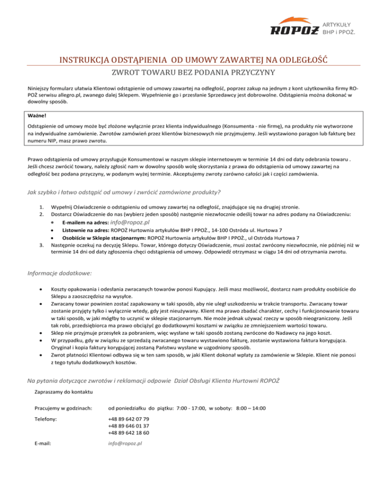 ARTYKUŁY BHP i PPOŻ. INSTRUKCJA ODSTĄPIENIA OD UMOWY ZAWARTEJ NA ODLEGŁOŚĆ ZWROT TOWARU BEZ PODANIA PRZYCZYNY Niniejszy formularz ułatwia Klientowi odstąpienie od umowy zawartej na odległość, poprzez zakup na jednym z kont użytkownika firmy ROPOŻ serwisu allegro.pl, zwanego dalej Sklepem. Wypełnienie go i przesłanie Sprzedawcy jest dobrowolne. Odstąpienia można dokonać w dowolny sposób. Ważne! Odstąpienie od umowy może być złożone wyłącznie przez klienta indywidualnego (Konsumenta - nie firmę), na produkty nie wytworzone na indywidualne zamówienie. Zwrotów zamówień przez klientów biznesowych nie przyjmujemy. Jeśli wystawiono paragon lub fakturę bez numeru NIP, masz prawo zwrotu. Prawo odstąpienia od umowy przysługuje Konsumentowi w naszym sklepie internetowym w terminie 14 dni od daty odebrania towaru . Jeśli chcesz zwrócić towary, należy zgłosić nam w dowolny sposób wolę skorzystania z prawa do odstąpienia od umowy zawartej na odległość bez podana przyczyny, w podanym wyżej terminie. Akceptujemy zwroty zarówno całości jak i części zamówienia. Jak szybko i łatwo odstąpić od umowy i zwrócić zamówione produkty? 1. 2. Wypełnij Oświadczenie o odstąpieniu od umowy zawartej na odległość, znajdujące się na drugiej stronie. Dostarcz Oświadczenie do nas (wybierz jeden sposób) następnie niezwłocznie odeślij towar na adres podany na Oświadczeniu: 3. E-mailem na adres: [email protected] Listownie na adres: ROPOŻ Hurtownia artykułów BHP I PPOŻ., 14-100 Ostróda ul. Hurtowa 7 Osobiście w Sklepie stacjonarnym: ROPOŻ Hurtownia artykułów BHP I PPOŻ., ul Ostróda Hurtowa 7 Następnie oczekuj na decyzję Sklepu. Towar, którego dotyczy Oświadczenie, musi zostać zwrócony niezwłocznie, nie później niż w terminie 14 dni od daty zgłoszenia chęci odstąpienia od umowy. Odpowiedź otrzymasz w ciągu 14 dni od otrzymania zwrotu. Informacje dodatkowe: Koszty opakowania i odesłania zwracanych towarów ponosi Kupujący. Jeśli masz możliwość, dostarcz nam produkty osobiście do Sklepu a zaoszczędzisz na wysyłce. Zwracany towar powinien zostać zapakowany w taki sposób, aby nie uległ uszkodzeniu w trakcie transportu. Zwracany towar zostanie przyjęty tylko i wyłącznie wtedy, gdy jest nieużywany. Klient ma prawo zbadać charakter, cechy i funkcjonowanie towaru w taki sposób, w jaki mógłby to uczynić w sklepie stacjonarnym. Nie może jednak używać rzeczy w sposób nieograniczony. Jeśli tak robi, przedsiębiorca ma prawo obciążyć go dodatkowymi kosztami w związku ze zmniejszeniem wartości towaru. Sklep nie przyjmuje przesyłek za pobraniem, więc wysłane w taki sposób zostaną zwrócone do Nadawcy na jego koszt. W przypadku, gdy w związku ze sprzedażą zwracanego towaru wystawiono fakturę, zostanie wystawiona faktura korygująca. Oryginał i kopia faktury korygującej zostaną Państwu wysłane w uzgodniony sposób. Zwrot płatności Klientowi odbywa się w ten sam sposób, w jaki Klient dokonał wpłaty za zamówienie w Sklepie. Klient nie ponosi z tego tytułu dodatkowych kosztów. Na pytania dotyczące zwrotów i reklamacji odpowie Dział Obsługi Klienta Hurtowni ROPOŻ Zapraszamy do kontaktu Pracujemy w godzinach: od poniedziałku do piątku: 7:00 - 17:00, w soboty: 8:00 – 14:00 Telefony: +48 89 642 07 79 +48 89 646 01 37 +48 89 642 18 60 E-mail: [email protected] ARTYKUŁY BHP i PPOŻ. OŚWIADCZENIE O ODSTĄPIENIU OD UMOWY ZAWARTEJ NA ODLEGŁOŚĆ ZWROT TOWARU BEZ PODANIA PRZYCZYNY Dane Kupującego: Dane Sprzedającego: Imię i nazwisko: …………………………………………………………………………………………………… ROSIŃSKA MARZENA PRZEDSIĘBIORSTWO HANDLOWO – USŁUGOWE "RO-POŻ” Nick Allegro: …………………………………………………………………………………………………… Adres: …………………………………………………………………………………………………… Kod pocztowy i miasto: …………………………………………………………………………………………………… Adres e-mail: …………………………………………………………………………………………………… Nr telefonu: …………………………………………………………………………………………………… [email protected] Nr zamówienia: …………………………………………………………………………………………………… Nr paragonu lub faktury: …………………………………………………………………………………………………… +48 89 642 07 79 +48 89 646 01 37 +48 89 642 18 60 ul. Hurtowa 7 14-100 Ostróda Oświadczam, że zgodnie z Ustawą z dnia 30 maja 2014 r. o prawach konsumenta, Dz.U.2014.827., odstępuję od umowy kupna (nr zamówienia wskazany powyżej). OŚWIADCZAM, ŻE ZWRACAM OTRZYMANE W DNIU …………………………………………. NASTĘPUJĄCE TOWARY: Ilość zwracana Nazwa towaru Cena brutto Uwagi Kupującego PROSZĘ O ZWROT NALEŻNOŚCI W ZWIĄZKU Z ODSTĄPIENIEM OD UMOWY ZAWARTEJ NA ODLEGŁOŚĆ, NA RACHUNEK BANKOWY O NR: Nr rachunku bankowego: _ _ Posiadacz rachunku: ………………………………………………………………………………………………………………………………………………………... Adres posiadacza rachunku: ………………………………………………………………………………………………………………………………………………………… _ _ _ _ _ _ _ _ _ _ _ _ _ _ _ _ _ _ _ _ _ _ _ _ OŚWIADCZAM, ŻE ZWROTU DOKONUJĘ (właściwe zaznaczyć): ☐ bez podania przyczyny ☐ z podaniem przyczyny krótki opis przyczyny zwrotu towaru data i podpis Kupującego ……………………………………………… …………………………………………