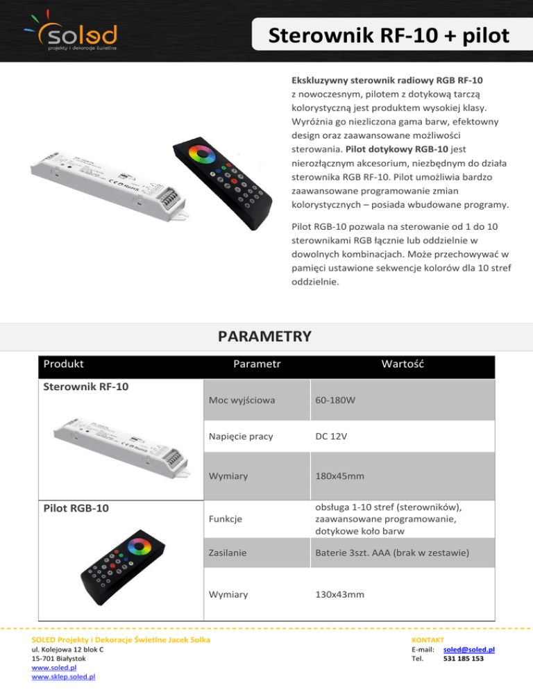 Sterownik RF-10 + pilot Ekskluzywny sterownik radiowy RGB RF-10 z nowoczesnym, pilotem z dotykową tarczą kolorystyczną jest produktem wysokiej klasy. Wyróżnia go niezliczona gama barw, efektowny design oraz zaawansowane możliwości sterowania. Pilot dotykowy RGB-10 jest nierozłącznym akcesorium, niezbędnym do działa sterownika RGB RF-10. Pilot umożliwia bardzo zaawansowane programowanie zmian kolorystycznych – posiada wbudowane programy. Pilot RGB-10 pozwala na sterowanie od 1 do 10 sterownikami RGB łącznie lub oddzielnie w dowolnych kombinacjach. Może przechowywać w pamięci ustawione sekwencje kolorów dla 10 stref oddzielnie. PARAMETRY Produkt Parametr Wartość Sterownik RF-10 Moc wyjściowa 60-180W Napięcie pracy DC 12V Wymiary 180x45mm Funkcje obsługa 1-10 stref (sterowników), zaawansowane programowanie, dotykowe koło barw Zasilanie Baterie 3szt. AAA (brak w zestawie) Wymiary 130x43mm Pilot RGB-10 SOLED Projekty i Dekoracje Świetlne Jacek Solka ul. Kolejowa 12 blok C 15-701 Białystok www.soled.pl www.sklep.soled.pl KONTAKT E-mail: [email protected] Tel. 531 185 153 TKOWE FUNKCJE PILOTA RGB-10 STEROWNIK RF-10 SOLED Projekty i Dekoracje Świetlne Jacek Solka ul. Kolejowa 12 blok C 15-701 Białystok www.soled.pl www.sklep.soled.pl KONTAKT E-mail: [email protected] Tel. 531 185 153 PROGRAMOWANIE Synchronizacja pilota ze sterownikiem 1. Włączyć pilot za pomocą przycisku ON/OFF 2. Jednokrotnie nacisnąć czarny przycisk LEARNING na sterowniku- zapali się czerwona dioda. Mieszanie kolorów 1. Można samodzielnie mieszać kolory między sobą, przy pomocy przycisków R,G,B,W. 2. Dla przykładu przyciśnięcie i przytrzymanie przycisku 3. Nacisnąć i przytrzymać numer strefy na pilocie (1-4) R oraz przycisku B na pilocie spowoduje połączenie 4. Czerwona dioda na sterowniku mignie czterokrotnie i tych dwóch kolorów (zapalenie czerwonej diody). W zgaśnie. Strefa została zapamiętana. tym momencie przesuwanie palcem po tarczy Czynności te powtarza się z innymi sterownikami. dotykowej spowoduje różne stopnie mieszania tych Wszystkie sterowniki można przypisać do jednej strefy dwóch kolorów. 5. (działanie synchroniczne) lub każdy sterownik do osobnej. 6. 3. Aby skasować zapamiętany program należy nacisnąć Kolor biały uzyskujemy poprzez jednokrotne przyciśnięcie R,G,B. przycisk LEARNING na sterowniku przez 5 sekund, aż czerwona dioda na sterowniku zgaśnie. Funkcje pilota Ustawienie programu 1. Pilot po 10s bezczynności się dezaktywuje. Ponowne Nacisnąć przycisk ON/OFF na pilocie dotykowym – zapali się dioda w prawym górnym rogu pilota. przyciśnięcie przycisku ON/OFF spowoduje aktywację 2. Nacisnąć wybrany przycisk strefy (1-10) przycisków pilota, co zasygnalizuje czerwona dioda w 3. Aby zmienić program, nacisnąć M. Ponowne prawym górnym rogu pilota. naciśnięcie przycisku M zatrzyma program w 1. Nacisnąć przycisk ON/OFF na pilocie dotykowym – zapali wybranym miejscu. Ponowne naciśnięcie M włączy się dioda w prawym górnym rogu pilota. 2. Po wybraniu strefy możemy wybrać kolor świecenia przy pomocy dotykowej palety barw. kolejny program. 4. Przyciskami pilota S- i S+ ustawiamy szybkość programu. 3. Aby zmienić barwę kilku stref należy nacisnąć wybrane numery stref (1-10) jedna po drugiej po czym wybrać kolory z koła barw. 4. Przyciśnięcie i przytrzymanie przycisku z numerem strefy spowoduje jej wyłączenie. Ponowne przytrzymanie – włączenie strefy. 5. Przyciskami pilota B- i B+ ustawiamy jasność wybranego koloru. SOLED Projekty i Dekoracje Świetlne Jacek Solka ul. Kolejowa 12 blok C 15-701 Białystok www.soled.pl www.sklep.soled.pl KONTAKT E-mail: [email protected] Tel. 531 185 153 PODŁĄCZENIE STEROWNIKA SOLED Projekty i Dekoracje Świetlne Jacek Solka ul. Kolejowa 12 blok C 15-701 Białystok www.soled.pl www.sklep.soled.pl KONTAKT E-mail: [email protected] Tel. 531 185 153