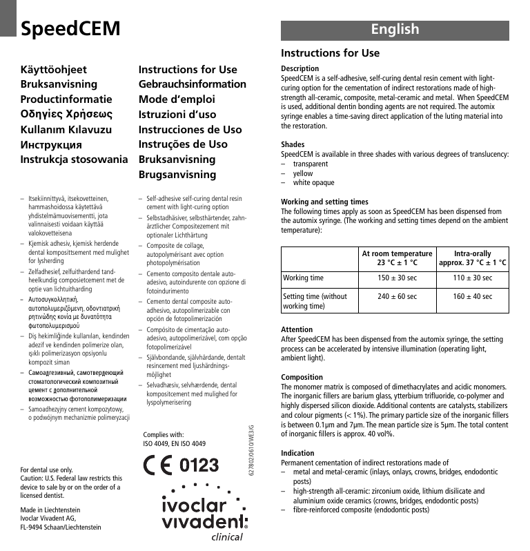 SpeedCEM English Instructions for Use Käyttöohjeet Bruksanvisning Productinformatie Oδηγίες Xρήσεως Kullanım Kılavuzu àÌÒÚÛ͈Ëfl Instrukcja stosowania Instructions for Use Gebrauchsinformation Mode d’emploi Istruzioni d’uso Instrucciones de Uso Instruções de Uso Bruksanvisning Brugsanvisning Description SpeedCEM is a self-adhesive, self-curing dental resin cement with lightcuring option for the cementation of indirect restorations made of highstrength all-ceramic, composite, metal-ceramic and metal. When SpeedCEM is used, additional dentin bonding agents are not required. The automix syringe enables a time-saving direct application of the luting material into the restoration. – Itsekiinnittyvä, itsekovetteinen, hammashoidossa käytettävä yhdistelmämuovisementti, jota valinnaisesti voidaan käyttää valokovetteisena – Kjemisk adhesiv, kjemisk herdende dental komposittsement med mulighet for lysherding – Zelfadhesief, zelfuithardend tandheelkundig composietcement met de optie van lichtuitharding – Αυτoσυγκoλλητική, αυτoπoλυµεριζWµενη, oδoντιατρική ρητινώδης κoνία µε δυνατWτητα φωτoπoλυµερισµoύ – Difl hekimli¤inde kullanılan, kendinden adezif ve kendinden polimerize olan, ıflıklı polimerizasyon opsiyonlu kompozit siman – ë‡ÏÓ‡‰„ÂÁË‚Ì˚È, Ò‡ÏÓڂ‰²˘ËÈ ÒÚÓχÚÓÎӄ˘ÂÒÍËÈ ÍÓÏÔÓÁËÚÌ˚È ˆÂÏÂÌÚ Ò ‰ÓÔÓÎÌËÚÂθÌÓÈ ‚ÓÁÏÓÊÌÓÒÚ¸˛ ÙÓÚÓÔÓÎËÏÂËÁ‡ˆËË – Samoadhezyjny cement kompozytowy, o podwójnym mechanizmie polimeryzacji – Self-adhesive self-curing dental resin cement with light-curing option – Selbstadhäsiver, selbsthärtender, zahnärztlicher Compositezement mit optionaler Lichthärtung – Composite de collage, autopolymérisant avec option photopolymérisation – Cemento composito dentale autoadesivo, autoindurente con opzione di fotoindurimento – Cemento dental composite autoadhesivo, autopolimerizable con opción de fotopolimerización – Compósito de cimentação autoadesivo, autopolimerizável, com opção fotopolimerizável – Självbondande, självhärdande, dentalt resincement med ljushärdningsmöjlighet – Selvadhæsiv, selvhærdende, dental kompositcement med mulighed for lyspolymerisering Working and setting times The following times apply as soon as SpeedCEM has been dispensed from the automix syringe. (The working and setting times depend on the ambient temperature): For dental use only. Caution: U.S. Federal law restricts this device to sale by or on the order of a licensed dentist. Made in Liechtenstein Ivoclar Vivadent AG, FL-9494 Schaan/Liechtenstein At room temperature Intra-orally 23 °C ± 1 °C approx. 37 °C ± 1 °C Working time 150 ± 30 sec 110 ± 30 sec Setting time (without working time) 240 ± 60 sec 160 ± 40 sec Attention After SpeedCEM has been dispensed from the automix syringe, the setting process can be accelerated by intensive illumination (operating light, ambient light). 627802/0610/WE3/G Complies with: ISO 4049, EN ISO 4049 Shades SpeedCEM is available in three shades with various degrees of translucency: – transparent – yellow – white opaque Composition The monomer matrix is composed of dimethacrylates and acidic monomers. The inorganic fillers are barium glass, ytterbium trifluoride, co-polymer and highly dispersed silicon dioxide. Additional contents are catalysts, stabilizers and colour pigments (< 1%). The primary particle size of the inorganic fillers is between 0.1µm and 7µm. The mean particle size is 5µm. The total content of inorganic fillers is approx. 40 vol%. Indication Permanent cementation of indirect restorations made of – metal and metal-ceramic (inlays, onlays, crowns, bridges, endodontic posts) – high-strength all-ceramic: zirconium oxide, lithium disilicate and aluminium oxide ceramics (crowns, bridges, endodontic posts) – fibre-reinforced composite (endodontic posts) Contraindication SpeedCEM is contraindicated – in situations where the preparation does not provide adequate retention (e.g. veneers). – if a patient is known to be allergic to any of the ingredients of SpeedCEM. – in general, SpeedCEM should not be applied to exposed pulp or to dentin which is close to the pulp. Side effects Systemic side effects are not known to date. In rare cases, allergic reactions to single components have been reported. Interactions Phenolic substances (e.g. eugenol) inhibit polymerization. Consequently, the application of materials containing these substances is to be avoided. Only use eugenol-free temporary cements (e.g. Telio CS Link), as eugenol may inhibit the polymerization of SpeedCEM. Disinfectants with an oxidative effect (e.g. hydrogen peroxide) may interact with the initiator system, which in turn may impair the curing process. Thus the tooth substance must not be disinfected using oxidative agents. Alkaline jet media impair the effect of SpeedCEM. Application 1. Removal of the temporary restoration and thorough cleaning of the cavity Remove possible residue of the temporary luting composite from the cavity or preparation with a polishing brush and an oil- and fluoride-free cleaning paste. Rinse with water spray. Then lightly dry with water- and oil-free air. Avoid overdrying. Note: Cleaning with alcohol can lead to overdrying of the dentin. 2. Try-in of the restoration Next, the shade, the accuracy of fit and the occlusion of the restoration can be checked. Care should be taken when checking the occlusion of fragile and brittle ceramic objects before they are permanently cemented, as there is a risk of fracture. If necessary, make corrections with fine diamonds at medium speed and with slight pressure and adequate water cooling. Polish ground surfaces. It is essential to ensure reliable isolation of the operative area with e.g. OptraGate, cotton rolls or saliva ejector. Dental hard tissue c