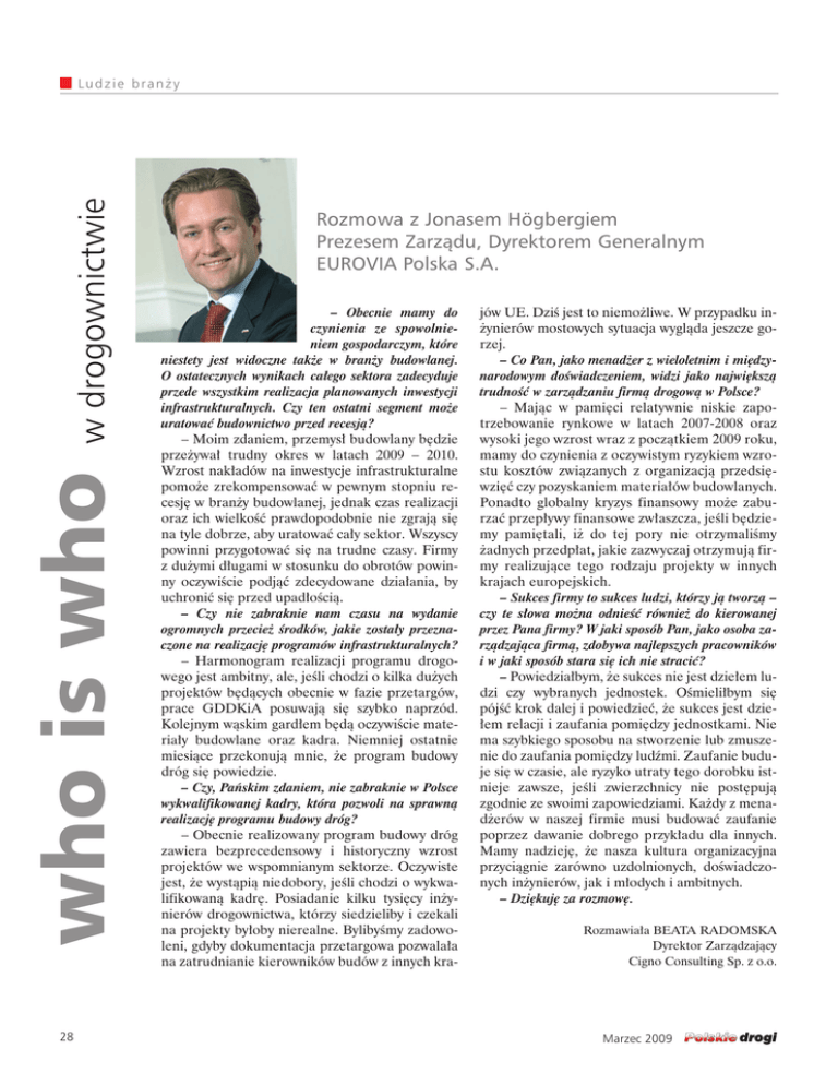 who is who w drogownictwie Ludzie bran˝y 28 Rozmowa z Jonasem Högbergiem Prezesem Zarzàdu, Dyrektorem Generalnym EUROVIA Polska S.A. – Obecnie mamy do czynienia ze spowolnieniem gospodarczym, które niestety jest widoczne tak˝e w bran˝y budowlanej. O ostatecznych wynikach ca∏ego sektora zadecyduje przede wszystkim realizacja planowanych inwestycji infrastrukturalnych. Czy ten ostatni segment mo˝e uratowaç budownictwo przed recesjà? – Moim zdaniem, przemys∏ budowlany b´dzie prze˝ywa∏ trudny okres w latach 2009 – 2010. Wzrost nak∏adów na inwestycje infrastrukturalne pomo˝e zrekompensowaç w pewnym stopniu recesj´ w bran˝y budowlanej, jednak czas realizacji oraz ich wielkoÊç prawdopodobnie nie zgrajà si´ na tyle dobrze, aby uratowaç ca∏y sektor. Wszyscy powinni przygotowaç si´ na trudne czasy. Firmy z du˝ymi d∏ugami w stosunku do obrotów powinny oczywiÊcie podjàç zdecydowane dzia∏ania, by uchroniç si´ przed upad∏oÊcià. – Czy nie zabraknie nam czasu na wydanie ogromnych przecie˝ Êrodków, jakie zosta∏y przeznaczone na realizacj´ programów infrastrukturalnych? – Harmonogram realizacji programu drogowego jest ambitny, ale, jeÊli chodzi o kilka du˝ych projektów b´dàcych obecnie w fazie przetargów, prace GDDKiA posuwajà si´ szybko naprzód. Kolejnym wàskim gard∏em b´dà oczywiÊcie materia∏y budowlane oraz kadra. Niemniej ostatnie miesiàce przekonujà mnie, ˝e program budowy dróg si´ powiedzie. – Czy, Paƒskim zdaniem, nie zabraknie w Polsce wykwalifikowanej kadry, która pozwoli na sprawnà realizacj´ programu budowy dróg? – Obecnie realizowany program budowy dróg zawiera bezprecedensowy i historyczny wzrost projektów we wspomnianym sektorze. Oczywiste jest, ˝e wystàpià niedobory, jeÊli chodzi o wykwalifikowanà kadr´. Posiadanie kilku tysi´cy in˝ynierów drogownictwa, którzy siedzieliby i czekali na projekty by∏oby nierealne. BylibyÊmy zadowoleni, gdyby dokumentacja przetargowa pozwala∏a na zatrudnianie kierowników budów z innych kra- jów UE. DziÊ jest to niemo˝liwe. W przypadku in˝ynierów mostowych sytuacja wyglàda jeszcze gorzej. – Co Pan, jako menad˝er z wieloletnim i mi´dzynarodowym doÊwiadczeniem, widzi jako najwi´kszà trudnoÊç w zarzàdzaniu firmà drogowà w Polsce? – Majàc w pami´ci relatywnie niskie zapotrzebowanie rynkowe w latach 2007-2008 oraz wysoki jego wzrost wraz z poczàtkiem 2009 roku, mamy do czynienia z oczywistym ryzykiem wzrostu kosztów zwiàzanych z organizacjà przedsi´wzi´ç czy pozyskaniem materia∏ów budowlanych. Ponadto globalny kryzys finansowy mo˝e zaburzaç przep∏ywy finansowe zw∏aszcza, jeÊli b´dziemy pami´tali, i˝ do tej pory nie otrzymaliÊmy ˝adnych przedp∏at, jakie zazwyczaj otrzymujà firmy realizujàce tego rodzaju projekty w innych krajach europejskich. – Sukces firmy to sukces ludzi, którzy jà tworzà – czy te s∏owa mo˝na odnieÊç równie˝ do kierowanej przez Pana firmy? W jaki sposób Pan, jako osoba zarzàdzajàca firmà, zdobywa najlepszych pracowników i w jaki sposób stara si´ ich nie straciç? – Powiedzia∏bym, ˝e sukces nie jest dzie∏em ludzi czy wybranych jednostek. OÊmieli∏bym si´ pójÊç krok dalej i powiedzieç, ˝e sukces jest dzie∏em relacji i zaufania pomi´dzy jednostkami. Nie ma szybkiego sposobu na stworzenie lub zmuszenie do zaufania pomi´dzy ludêmi. Zaufanie buduje si´ w czasie, ale ryzyko utraty tego dorobku istnieje zawsze, jeÊli zwierzchnicy nie post´pujà zgodnie ze swoimi zapowiedziami. Ka˝dy z menad˝erów w naszej firmie musi budowaç zaufanie poprzez dawanie dobrego przyk∏adu dla innych. Mamy nadziej´, ˝e nasza kultura organizacyjna przyciàgnie zarówno uzdolnionych, doÊwiadczonych in˝ynierów, jak i m∏odych i ambitnych. – Dzi´kuj´ za rozmow´. Rozmawia∏a BEATA RADOMSKA Dyrektor Zarzàdzajàcy Cigno Consulting Sp. z o.o. Marzec 2009 Janusz Andrzej Lewandowski jest absolwentem Politechniki Warszawskiej. Posiada uprawnienia budowlane. Jest cz∏onkiem Mazowieckiej Okr´gowej Izby In˝ynierów Budownictwa. Od 1979 r. by∏ kierownikiem budów realizowanych przez Mostostal Warszawa S.A. zarówno w Polsce, jak i za granicà. W latach 19952001 by∏ zast´pcà dyrektora, a nast´pnie dyrektorem Biura Marketingu i Sprzeda˝y Mostostal Warszawa S.A. Od 2002 r. pe∏ni∏ funkcj´ dyrektora, in˝yniera kontraktu dla ZBM Inwestor Zast´pczy Sp. z o.o. gdzie nadzorowa∏ m.in. realizacj´ odcinka Trasy Siekierkowskiej od Mostu Siekierkowskiego do w´z∏a Czerniakowska w∏àcznie oraz budow´ w´z∏a Wa∏u Miedzeszyƒskiego. Od 2003 pracowa∏ dla firmy Strabag Sp. z o.o. W latach 2005-2007 pe∏ni∏ funkcj´ dyrektora kontraktu dla Budimex Dromex S.A. realizujàc kolejny odcinek Trasy Siekierkowskiej obejmujàcy budow´ Trasy Siekierkowskiej oraz w´z∏a ul. P∏owieckiej. Obecnie jest Cz∏onkiem Zarzàdu, Dyrektorem Pionu Budownictwa Drogowo-Mostowego P.R.I. „POL-AQUA” S.A. Realizuje m.in. kontrakt drogowo-mostowy w Szczecinie, ostatni odcinek Trasy Siekierkowskiej przy ul. Marsa oraz budow´ nowej jezdni ul. Wilanowskiej. Firma, którà reprezentuje, jest liderem konsorcjum, które w lutym br. przedstawi∏o, najkorzystniejszà ofert´ na budow´ Mostu Pó∏nocnego w Warszawie. Marzec 2009 Marcin Kasprzak zajmuje stanowisko Lidera Zespo∏u Budownictwa Drogowego w firmie Ove Arup Polska. Ukoƒczy∏ Politechnik´ Âlàskà w Gliwicach, ze specjalnoÊcià Budowy Dróg, Ulic i Autostrad. Jest in˝ynierem budowy dróg, zajmujàcym si´ równie˝ organizacjà ruchu i transportem. Ma szerokie doÊwiadczenie w projektowaniu i wykonawstwie ró˝nych uk∏adów drogowych zarówno dla paƒstwowych, jak i prywatnych zamawiajàcych. Projektowa∏ drogi dwujezdniowe, w´z∏y drogowe, ulice miejskie, linie tramwajowe, zak∏ady przemys∏owe i centra handlowe. Jego doÊwiadczenie na budowie obejmuje du˝e projekty drogowo-mostowe, wspó∏finansowane prz