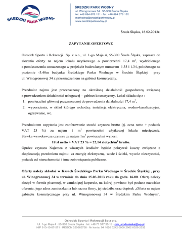 ŚREDZKI PARK WODNY ul. Winogronowa 34 ∙ 55-300 Środa Śląska tel. +48 884 676 151 ∙ fax +48 884 676 152 [email protected] www.sredzkiparkwodny.pl Środa Śląska, 18.02.2013r. ZAPYTANIE OFERTOWE Ośrodek Sportu i Rekreacji Sp. z o.o., ul. 1-go Maja 4, 55-300 Środa Śląska, zaprasza do złożenia oferty na najem lokalu użytkowego o powierzchni 17,4 m2, wydzielonego z pomieszczenia oznaczonego w projekcie budowlanym numerem 1.33 i 1.34, położonego na poziomie -3.40m budynku Średzkiego Parku Wodnego w Środzie Śląskiej przy ul. Winogronowej 34 z przeznaczeniem na gabinet kosmetyczny. Przedmiot najmu jest przeznaczony na określoną działalność gospodarczą związaną z prowadzeniem działalności usługowej – gabinet kosmetyczny. Lokal składa się z : 1. powierzchni głównej przeznaczonej do prowadzenia działalności 17,4 m2, 2. wyposażenia, w skład którego wchodzą: instalacja elektryczna, wodno-kanalizacyjna, ogrzewanie, wc. Przedmiotem zapytania jest zaoferowanie stawki czynszu brutto (tj. cena netto + podatek VAT 23 %) za najem 1 m2 powierzchni użytkowej lokalu miesięcznie. Stawka wywoławcza czynszu za najem 1m2 powierzchni wynosi: 18 zł netto + VAT 23 % = 22,14 złotych/m2 brutto. Oprócz czynszu Najemca z własnych środków będzie pokrywał koszty związane z eksploatacją przedmiotu najmu: za energię elektryczną, wodę i ścieki, wywóz nieczystości, podatek od nieruchomości i inne zobowiązania publiczne. Oferty należy składać w Kasach Średzkiego Parku Wodnego w Środzie Śląskiej , przy ul. Winogronowej 34 w terminie do dnia 15.03.2013 roku do godz. 16.00. Ofertę należy złożyć w formie pisemnej, w zamkniętej kopercie, na której powinno być podane nazwisko oferenta, jego adres zamieszkania lub nazwa firmy, jej siedziba oraz dopisek „Oferta na najem gabinetu kosmetycznego przy ul. Winogronowej 34 w Średzkim Parku Wodnym”. Ośrodek Sportu i Rekreacji Sp.z o.o. Ul. 1-go Maja 4 ∙ 55-300 Środa Śląska ∙ tel. +48 71 317 35 19 ∙ [email protected] NIP 913-15-87-571 ∙ REGON 020665758 ∙ Nr konta: 94 1020 5242 0000 2902 0029 2532 ŚREDZKI PARK WODNY ul. Winogronowa 34 ∙ 55-300 Środa Śląska tel. +48 884 676 151 ∙ fax +48 884 676 152 [email protected] www.sredzkiparkwodny.pl Oferta musi zawierać: nazwisko i imię oferenta lub nazwę jednostki składającej ofertę, proponowaną stawkę czynszu za 1m2 powierzchni miesięcznie lokalu użytkowego brutto (również słownie), oświadczenie pisemne oferenta o zapoznaniu się i zaakceptowaniu projektu umowy najmu, formularz ofertowy (wypełnione wszystkie wykropkowane w nim pola), aktualne zaświadczenie o wpisie do ewidencji działalności gospodarczej, w przypadku osób prawnych - wypis z krajowego rejestru sądowego, podpis składającego ofertę. Szczegółowych informacji o lokalu jak również w sprawie przetargu udziela: Dyrektor Średzkiego Parku Wodnego Arkadiusz Gubała tel. 885 130 885 W postępowaniu wygrywa oferta o najwyższej zaproponowanej stawce czynszu brutto. Wygrywający zobowiązany jest do zawarcia umowy najmu (załącznik do zapytania ofertowego) w terminie do 7 dni od daty ogłoszenia wyników. W celu zawarcia umowy wymagane są następujące dokumenty: oświadczenie oferenta, czy jest płatnikiem podatku VAT. Wynajmujący zawrze z najemcą porozumienie określające zakres robót adaptacyjnoremontowych podlegających rozliczeniu. Pozostałe warunki najmu określa umowa, której wzór stanowi załącznik do niniejszego zapytania ofertowego i jest obowiązująca dla zwycięzcy. Ośrodek Sportu i Rekreacji Sp.z o.o. Ul. 1-go Maja 4 ∙ 55-300 Środa Śląska ∙ tel. +48 71 317 35 19 ∙ [email protected] NIP 913-15-87-571 ∙ REGON 020665758 ∙ Nr konta: 94 1020 5242 0000 2902 0029 2532 ŚREDZKI PARK WODNY ul. Winogronowa 34 ∙ 55-300 Środa Śląska tel. +48 884 676 151 ∙ fax +48 884 676 152 [email protected] www.sredzkiparkwodny.pl FORMULARZ OFERTOWY na najem lokalu użytkowego o powierzchni 17,4 m2, w budynku Średzkiego Parku Wodnego w Środzie Śląskiej przy ul. Winogronowej 34 z przeznaczeniem na gabinet kosmetyczny DANE PODSTAWOWE: ...................................................................................................... Imię i nazwisko / nazwa firmy ...................................................................................................... OFERENTA Adres / siedziba ...................................................................................................... ...................................................................................................... OFERENTA ...................................................................................................... Adres korespondencyjny ...................................................................................................... Telefon, faks, tel. komórkowy ................................................................................................. Proponowana stawka czynszu brutto ........................... PLN/m2 powierzchni użytkowej lokalu (z 23 % VAT) Za 1 m2 powierzchni użytkowej lokalu (bez podatku VAT) będącego przedmiotem oferty słownie: .................................................................................... ................................................................................................ Ośrodek Sportu i Rekreacji Sp.z o.o. Ul. 1-go Maja 4 ∙ 55-300 Środa Śląska ∙ tel. +48 71 317 35 19 ∙ [email protected] NIP 913-15-87-571 ∙ REGON 020665758 ∙ Nr konta: 94 1020 5242 0000 2902 0029 2532 ŚREDZKI PARK WODNY ul. Winogronowa 34 ∙ 55-300 Środa Śląska tel. +48 884 676 151 ∙ fax +48 884 676 152 [email protected] www.sredzkiparkwodny.pl Dane personalne osoby lub osób upoważnionych do podpisania umowy: Imiona i nazwisko ..................................................................................................................................... Nr dowodu osobistego ..............