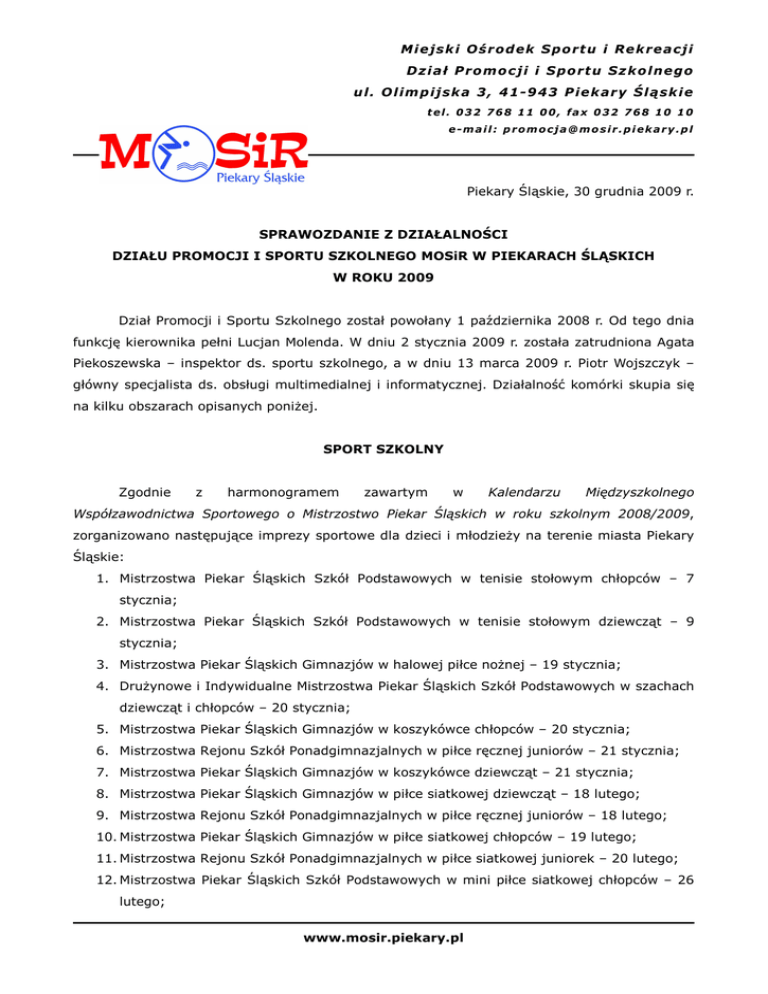 M i e js k i O ś r od ek S po rt u i Re k re a cj i Dz i a ł P ro mo c j i i S po rt u Sz k o l ne go u l. O l im p ij sk a 3, 4 1- 94 3 P ie k ar y Ś l ą sk i e tel. 032 768 11 00, fax 032 768 10 10 e-mail: [email protected] Piekary Śląskie, 30 grudnia 2009 r. SPRAWOZDANIE Z DZIAŁALNOŚCI DZIAŁU PROMOCJI I SPORTU SZKOLNEGO MOSiR W PIEKARACH ŚLĄSKICH W ROKU 2009 Dział Promocji i Sportu Szkolnego został powołany 1 października 2008 r. Od tego dnia funkcję kierownika pełni Lucjan Molenda. W dniu 2 stycznia 2009 r. została zatrudniona Agata Piekoszewska – inspektor ds. sportu szkolnego, a w dniu 13 marca 2009 r. Piotr Wojszczyk – główny specjalista ds. obsługi multimedialnej i informatycznej. Działalność komórki skupia się na kilku obszarach opisanych poniżej. SPORT SZKOLNY Zgodnie z harmonogramem zawartym w Kalendarzu Międzyszkolnego Współzawodnictwa Sportowego o Mistrzostwo Piekar Śląskich w roku szkolnym 2008/2009, zorganizowano następujące imprezy sportowe dla dzieci i młodzieży na terenie miasta Piekary Śląskie: 1. Mistrzostwa Piekar Śląskich Szkół Podstawowych w tenisie stołowym chłopców – 7 stycznia; 2. Mistrzostwa Piekar Śląskich Szkół Podstawowych w tenisie stołowym dziewcząt – 9 stycznia; 3. Mistrzostwa Piekar Śląskich Gimnazjów w halowej piłce nożnej – 19 stycznia; 4. Drużynowe i Indywidualne Mistrzostwa Piekar Śląskich Szkół Podstawowych w szachach dziewcząt i chłopców – 20 stycznia; 5. Mistrzostwa Piekar Śląskich Gimnazjów w koszykówce chłopców – 20 stycznia; 6. Mistrzostwa Rejonu Szkół Ponadgimnazjalnych w piłce ręcznej juniorów – 21 stycznia; 7. Mistrzostwa Piekar Śląskich Gimnazjów w koszykówce dziewcząt – 21 stycznia; 8. Mistrzostwa Piekar Śląskich Gimnazjów w piłce siatkowej dziewcząt – 18 lutego; 9. Mistrzostwa Rejonu Szkół Ponadgimnazjalnych w piłce ręcznej juniorów – 18 lutego; 10. Mistrzostwa Piekar Śląskich Gimnazjów w piłce siatkowej chłopców – 19 lutego; 11. Mistrzostwa Rejonu Szkół Ponadgimnazjalnych w piłce siatkowej juniorek – 20 lutego; 12. Mistrzostwa Piekar Śląskich Szkół Podstawowych w mini piłce siatkowej chłopców – 26 lutego; www.mosir.piekary.pl 13. Mistrzostwa Piekar Śląskich Szkół Ponadgimnazjalnych w halowej piłce nożnej juniorek – 26 lutego; 14. Mistrzostwa Rejonu Szkół Ponadgimnazjalnych w piłce siatkowej juniorów – 2 marca; 15. Mistrzostwa Piekar Śląskich Szkół Podstawowych w mini piłce siatkowej dziewcząt – 3 marca; 16. Drużynowe i Indywidualne Mistrzostwa Piekar Śląskich Szkół Podstawowych w pływaniu dziewcząt i chłopców – 5 marca; 17. Mistrzostwa Rejonu Gimnazjów w koszykówce dziewcząt i chłopców – 11 marca; 18. Mistrzostwa Rejonu Gimnazjów w piłce ręcznej i chłopców – 13 marca; 19. Drużynowe Mistrzostwa Piekar Śląskich Gimnazjów w pływaniu dziewcząt i chłopców – 12 marca (na basenie CDP w Bytomiu); 20. Drużynowe i Indywidualne Mistrzostwa Piekar Śląskich Gimnazjów w szachach dziewcząt i chłopców – 19 marca; 21. Mistrzostwa Piekar Śląskich Szkół Ponadgimnazjalnych w piłce nożnej juniorów – 15 kwietnia; 22. Mistrzostwa Rejonu Szkół Podstawowych w szachach dziewcząt i chłopców – 15 kwietnia; 23. Mistrzostwa Rejonu Gimnazjów w szachach dziewcząt i chłopców – 15 kwietnia; 24. Mistrzostwa Rejonu Szkół Ponadgimnazjalnych w piłce nożnej juniorów – 21 kwietnia; 25. Zawody Miejsko-Rejonowe Szkół Podstawowych, Gimnazjów i Szkół ponadgimnazjalnych dziewcząt i chłopców w biegu na orientację – 29 kwietnia; 26. Mistrzostwa Piekar Śląskich Szkół Podstawowych w czwórboju lekkoatletycznym dziewcząt i chłopców – 5 maja; 27. Indywidualne i Drużynowe Mistrzostwa Piekar Śląskich Gimnazjów w dwuboju nowoczesnym dziewcząt i chłopców – 7 maja (na basenie CDP i stadionie „Rozbark” w Bytomiu); 28. Mistrzostwa Rejonu Szkół Podstawowych w mini piłce nożnej chłopców – 8 maja; 29. Mistrzostwa Piekar Śląskich Gimnazjów w siatkówce plażowej chłopców – 26 maja; 30. Mistrzostwa Piekar Śląskich Gimnazjów w siatkówce plażowej dziewcząt – 27 maja; 31. Mistrzostwa Piekar Śląskich Szkół Ponadgimnazjalnych w siatkówce plażowej juniorek – 28 maja; 32. Mistrzostwa Piekar Śląskich Szkół Ponadgimnazjalnych w siatkówce plażowej juniorów – 1 czerwca. W zawodach od szczebla rejonu, poprzez półfinały, aż do finałów wojewódzkich koordynowano udział Mistrzów Piekar w poszczególnych dyscyplinach. W zawodach na szczeblu rejonu Bytom reprezentacje piekarskich szkół wygrały następujące konkurencje: Szkoły podstawowe: 2 Czwórbój lekkoatletyczny chłopcy – MSP 11, zajmując V m. w finale Wojewódzkich Igrzysk Młodzieży Szkolnej w Sosnowcu; Mini siatkówka dziewcząt – MSP 11, zajmując II m. w półfinale a Gliwicach, co daje V VIII m. w województwie; Szachy chłopców – MSP 14, zajmując XII m. w finale Wojewódzkich Igrzysk Młodzieży Szkolnej w Czechowicach – Dziedzicach; Tenis stołowy dziewcząt – MSP 11, zajmując XIII m w finale Wojewódzkich Igrzysk Młodzieży Szkolnej w Ligocie k. Bielska. Gimnazja: Piłka ręczna chłopców – MG 2 zajmując II m. w finale Wojewódzkiej Gimnazjady w Bielsku – Białej; Piłka ręczna dziewcząt – MG 4 zajmując IV m w półfinale w Gliwicach, co daje XIII – XVI miejsce w województwie; Bieg na orientację dziewcząt (K15) - MG 1, zajmując IX m. w finale Wojewódzkiej Gimnazjady w Jastrzębiu – Zdroju; Bieg na orientację chłopców (M15) – MG 1, zajmując IX m. w finale Wojewódzkiej Gimnazjady w Jastrzębiu – Zdroju; Bieg na orientację dziewcząt (K16) – MG 2, bez udziału w finale Wojewódzkiej Gimnazjady; Bieg na orientację chłopców (M16) – MG 1, bez udziału w finale Wojewódzkiej Gimnazjady. Szkoły ponadgimnazjalne: Piłka ręczna juniorów – I LO, zajmując I m. w finale Wojewódzkiej Licealiady w C