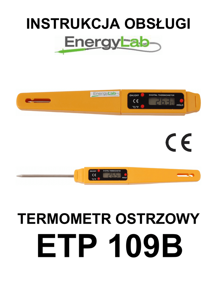 INSTRUKCJA OBSŁUGI TERMOMETR OSTRZOWY ETP 109B OPIS OGÓLNY Ten termometr jest wysoce precyzyjnym elektronicznym termometrem z sondą ostrzową (immersyjną ze stali szlachetnej. Jego zalety to: 1. Pomiar temperatury w stopniach Celsiusa lub Fahrenheita 2. Pamięć wyników MAX/MIN z pomiarów 3. DATA HOLD – „zamrożenie” bieżącego wyniku pomiaru na LCD 4. AUTO-POWER-OFF – automatyczne wyłączania po 20 minutach tak zwanej bezczynności (jężeli w tym czasie nie naciśniemy żadnego przycisku 5. Wskaz przekroczenia zakresu – jeżeli mierzona temperatura przekroczy 250ºC wyświetlacz wskaże „H- -„ przy niższej niż -40ºC wskaże „L- -„ 6. Osłona sondy po zdjęciu i założeniu na przeciwny koniec termometru może służyć jako wygodny uchwyt przy wykonywaniu pomiarów Termometr może być stosowany w przemyśle, laboratoriach, w testach i pomiarach temperatury żywności, również przy gotowaniu i sprawdzaniu temperatury gotowanej wody, mleka itp. SPECYFIKACJA Zakres pomiarowy: Temperatura pracy: -40ºC~+250ºC ( -40ºF~+482ºF) -0ºC~+50ºC (32ºF ~122ºF) (określa także dopuszczalną temp. obudowy) Dokładność: Dokładność jest podawana w formie: ±([%wskazania]+[wartość cyfr najmniej znaczących]) Zakres Dokładność Rozdzielczość -40ºC~0ºC ±(2% + 20) 0,1ºC 0,1ºC~99,9ºC ±(2% + 10) 0,1ºC Celsius 100ºC~199,9ºC ±(2% + 20) 0,1ºC 200ºC~250ºC ±(3% + 2) 1ºC -40ºF~32ºF ±(2% + 20) 0,1ºF Farenheit 32,1ºF~199,9ºF ±(2% + 10) 0,1ºF 200ºF~482ºF ±(3% + 2) 1ºF Zasilanie: 1,5V DC: bateria 1,5V LR44 lub odpowiednik Wymiary sondy: Ø3,8x70mm Wymiary (szerxgłxwys/dł) i masa: 22 x 16 x 145mm / 23 g (z baterią i osłoną) 2 SYMBOLE NA WYŚWIETLACZU HOLD – informuje, że na LCD znajduje się „zamrożony” ostatni wynik pomiaru MAX - informuje, że na LCD wyświetlony jest maksymalny wynik z pomiarów MIN - informuje, że na LCD wyświetlony jest minimalny wynik z pomiarów ----- - Oznaczenie ujemnej liczby ºC - stopnie Celsjusa ºF - stopnie Ferenheita OBSŁUGA 1. Wciśnij przycisk „ON/OFF’ dla włączenia termometru, wyświetlacz wskaże chwilowo wszystkie wyświetlane symbole, następnie wskaże chwilowo zero i następnie będzie wskazywał bieżącą temperaturę pomiarów (mierzoną czujnikiem temperatury umieszczonym w stożkowej końcówce sondy) 2. Wciśnij przycisk „ºC/ºF” dla wybory wskazań temperatury na LCD pomiędzy skalą Celsjusa a skalą Ferenheita 3. Wciśnij przycisk „HOLD” dla „zamrożenia” bieżącego wyniku pomiaru na LCD, symbol „HOLD” wyświetla się w tym czasie na LCD informując o tym trybie pracy 4. Wciśnij przycisk ‘HOLD” ponownie – wyświetli się symbol ‘MAX” informujący, że na LCD wyświetlona została maksymalna wartość temperatury z pomiarów (od czasu ostatniego włączenia) 5. Wciśnij przycisk „HOLD” jeszcze raz - wyświetli się symbol ‘MIN” informujący, że na LCD wyświetlona została minimalna wartość temperatury z pomiarów (od czasu ostatniego włączenia) 6. Kolejne wciśnięcie przycisku „HOLD” powoduje powrót do bieżących pomiarów temperatury (powyższe procedury są powtarzane sekwencyjnie) 7. Dla wyłączenia termometry wciśnij przycisk „ON/OFF” ponownie. OSTRZEŻENIE 1. Nie używać termometru do testowania obiektów o temperaturze > 250ºC 2. Po testach należy oczyścić sondę pomiarową gorącą wodą lub neutralnym detergentem i następnie osłonić sondę ochronną pokrywą 3. Jeżeli coś złego dzieje się z teromoetrem (wskazaniami) najpierw wymienić baterię (używając np. odpowiedniej monety przekręcić pokrywkę pojemnika baterii – w lewo, wyjąć pokrywkę i wymienić baterię na nową tego samego typu lub jej zamiennik. Założyć pokrywkę i w celu zamocowania przekręcić ją w prawo) 4. Jeżeli wskazania są nieczytelne, rozmyte itp. należy wymienić baterię 5. Nie wyrzucaj zużytych baterii - przekaż je do specjalnych pojemników znajdujących się np. w sklepach elektronicznych – chroń środowisko 6. Termometr przechowywać z dala od dzieci i niemowląt 3 UWAGI 1. Zastrzega się możliwość zmiany tej instrukcji obsługi bez uprzedzenia 2. Producent i dystrybutor nie biorą żadnej odpowiedzialności za jakiekolwiek szkody i straty 3. Dane zawarte w instrukcji nie mogą być podstawą do stosowania termometru do jakichkolwiek innych zastosowań Informacje o typowych temperaturach środków żywności (zachowując odpowiednie temperatury żywności chronisz swoje zdrowie) Temperatury gotowania: Drób …………………………………………………..88ºC Baranina ……………………………………………...82ºC W pełni dojrzała wołowina, wieprzowina ………….77ºC 70% gotowana wołowina, szynka wędzona ........ 71ºC 50% gotowana wołowina, szynka gotowana ……..60ºC Temperatury zamrażania Świeże mięso zamrażane na krótko ………………1ºC ~ 4ºC Mięso głęboko mrożone na długi czas …………….poniżej -18ºC OCHRONA ŚRODOWISKA. Urządzenie podlega dyrektywie WEEE 2002/96/EC. Symbol obok oznacza, że produkt musi być utylizowany oddzielnie i powinien być dostarczany do odpowiedniego punktu zbierającego odpady. Nie należy go wyrzucać razem z odpadami gospodarstwa domowego. Aby uzyskać więcej informacji, należy skontaktować się z przedstawicielem przedsiębiorstwa lub lokalnymi władzami odpowiedzialnymi za zarządzanie odpadami ETP109B nr kat. 111235 TERMOMETR OSTRZOWY Wyprodukowano w Chinach Importer: BIALL Sp. z o.o. Otomin, ul.Słoneczna 43 80-174 Gdańsk www.biall.com.pl 4