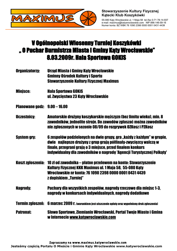 Stowarzyszenie Kultury Fizycznej Kątecki Klub Koszykówki 55-080 Kąty Wrocławskie ul. 1 Maja 58 tel./fax 0-71 78-14-937 e-mail: [email protected] NIP 896-146-59-16 Numer konta: BZ WBK 76 1090 2398 0000 0001 0431 4439 V Ogólnopolski Wiosenny Turniej Koszykówki „ O Puchar Burmistrza Miasta i Gminy Kąty Wrocławskie” 8.03.2009r. Hala Sportowa GOKiS Organizatorzy: Urząd Miasta i Gminy Kąty Wrocławskie Gminny Ośrodek Kultury i Sportu Stowarzyszenie Kultury Fizycznej Maximus Miejsce: Hala Sportowa GOKiS ul. Zwycięstwa 23 Kąty Wrocławskie Planowane godz: 9.00 – 16.00 Uczestnicy: Amatorskie drużyny koszykarskie mężczyzn (bez limitu wieku), min. 8 zawodników, jednolite stroje. Do zawodów zgłaszać można zawodników nie zgłoszonych w sezonie 08/09 do rozgrywek OZKosz i PZKosz System gry: 6 zespołów podzielonych na dwie grupy, gra „każdy z każdym” w grupie, dwie najlepsze drużyny z grup grają półfinały-zwycięzcy walczą w finale, przegrani grają o 3 miejsce, przed finałem konkurs indywidualny dla zawodników o nagrodę 'Agencji Turystycznej Polkąty' Koszt zgłoszenia: 10 zł od zawodnika – płatne przelewem na konto: Stowarzyszenie Kultury Fizycznej KKK Maximus ul. 1 Maja 58, 55-080 Kąty Wrocławskie nr konta: 76 1090 2398 0000 0001 0431 4439 z dopiskiem „Turniej” Nagrody: Puchary dla wszystkich zespołów, nagrody rzeczowe dla miejsc 1-3, nagrody w konkursach indywidualnych, nagrody dodatkowe Termin zgłoszeń: 6 marzec 2009 r. (warunkiem jest uiszczenie opłaty oraz wypełniony druk zgłoszenia) Patronat: Słowo Sportowe, Ziemianin Wrocławski, Portal Twoje Miasto i Gmina w Internecie www.katywroclawskie.com Za pr as zam y n a ww w. m ax i m u s . k at ywr o cla ws k i e . co m Jesteśmy częścią Portalu O Mieście i Gminie Kąty Wrocławskie www.katywroclawskie.com Stowarzyszenie Kultury Fizycznej Kątecki Klub Koszykówki 55-080 Kąty Wrocławskie ul. 1 Maja 58 tel./fax 0-71 78-14-937 e-mail: [email protected] NIP 896-146-59-16 Numer konta: BZ WBK 76 1090 2398 0000 0001 0431 4439 Inne: - zawodnicy ubezpieczają się we własnym zakresie - zapewniamy opiekę medyczną - mecze prowadzić będą sędziowie DZKosz - zgłoszenia oraz wpłaty można przesyłać faxem lub mailem: fax 0-71 78-14-937 mail: [email protected] - koordynator Turnieju Marcin Kurpiel tel. 0-501 674-458 Regulamin konkursu indywidualnego (rzut za 3 pkt.): W konkursie mogą uczestniczyć tylko zawodnicy reprezentujący drużyny biorące udział w Turnieju. Każda drużyna może zgłosić maksymalnie 2 zawodników. Zawodnicy wykonują po 5 rzutów z wybranej pozycji. Do drugiej tury przechodzi 4 zawodników z najlepszymi wynikami, którzy rzuty z II tury wykonują z połowy boiska. Wygrywa zawodnik, który odda celny(e) rzuty. (dokładne ustalenia na miejscu z uczestnikami konkursu) Mapka dojazdu do Hali: lub http://www.katywroclawskie.com/przewodnik/mapa_miasta/ Za pr as zam y n a ww w. m ax i m u s . k at ywr o cla ws k i e . co m Jesteśmy częścią Portalu O Mieście i Gminie Kąty Wrocławskie www.katywroclawskie.com Stowarzyszenie Kultury Fizycznej Kątecki Klub Koszykówki 55-080 Kąty Wrocławskie ul. 1 Maja 58 tel./fax 0-71 78-14-937 e-mail: [email protected] NIP 896-146-59-16 Numer konta: BZ WBK 76 1090 2398 0000 0001 0431 4439 Zgłaszam drużynę .............................................................................................. do uczestnictwa wV Ogólnopolskim Wiosennym Turnieju Koszykówki „O Puchar Burmistrza Miasta i Gminy Kąty Wrocławskie” SKŁAD DRUŻYNY: 1........................................................................................ 2........................................................................................ 3........................................................................................ 4........................................................................................ 5........................................................................................ 6........................................................................................ 7........................................................................................ 8........................................................................................ 9........................................................................................ 10...................................................................................... 11...................................................................................... 12...................................................................................... Proszę oznaczyć osoby uczestniczące w „konkursie rzutów za 3 pkt.” (max. 2 osoby) .......................................................................... osoba zgłaszająca + telefon Za pr as zam y n a ww w. m ax i m u s . k at ywr o cla ws k i e . co m Jesteśmy częścią Portalu O Mieście i Gminie Kąty Wrocławskie www.katywroclawskie.com