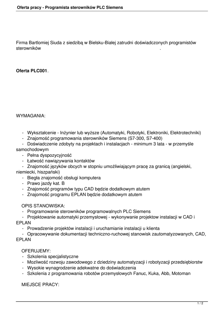Oferta pracy - Programista sterowników PLC Siemens Firma Bartlomiej Siuda z siedzibą w Bielsku-Białej zatrudni doświadczonych programistów sterowników . Oferta PLC001. WYMAGANIA: - Wykształcenie - Inżynier lub wyższe (Automatyki, Robotyki, Elektroniki, Elektrotechniki) - Znajomość programowania sterowników Siemens (S7-300, S7-400) - Doświadczenie zdobyty na projektach i instalacjach - minimum 3 lata - w przemyśle samochodowym - Pełna dyspozycyjność - Łatwość nawiązywania kontaktów - Znajomość języków obcych w stopniu umożliwiającym pracę za granicą (angielski, niemiecki, hiszpański) - Biegła znajomość obsługi komputera - Prawo jazdy kat. B - Znajomość programów typu CAD będzie dodatkowym atutem - Znajomość programu EPLAN będzie dodatkowym atutem OPIS STANOWISKA: - Programowanie sterowników programowalnych PLC Siemens - Projektowanie automatyki przemysłowej - wykonywanie projektow instalacji w CAD i EPLAN - Prowadzenie projektów instalacji i uruchamianie instalacji u klienta - Opracowywanie dokumentacji techniczno-ruchowej stanowisk zautomatyzowanych, CAD, EPLAN OFERUJEMY: - Szkolenia specjalistyczne - Mozliwość rozwoju zawodowego z dziedziny automatyzacji i robotyzacji przedsiębiorstw - Wysokie wynagrodzenie adekwatne do doświadczenia - Szkolenia z programowania robotów przemysłowych Fanuc, Kuka, Abb, Motoman MIEJSCE PRACY: 1/2 Oferta pracy - Programista sterowników PLC Siemens - Praca wyjazdowa na projektach w kraju i za granicą WARUNKI ZATRUDNIENIA: - Początkowo umowa na czas określony (3 miesiące) - Po upływie okresu próbnego umowa na czas nieokreślony w pełnym wymiarze godzin - Czas trwania projektów 1-24 miesięcy Jeżeli masz odpowiednie doświadczenie oraz jesteś zainteresowany podjęciem pracy w naszej firmie, prześlij swoją aplikacją na adres [email protected] . Proszę o dodanie klauzuli : "Wyrażam zgodę na przetwarzanie moich danych osobowych dla potrzeb procesu rekrutacji zgodnie z Ustawą z dnia 29.08.1997r o Ochronie Danych Osobowych (Dz. U. Nr 133 poz.833)". 2/2