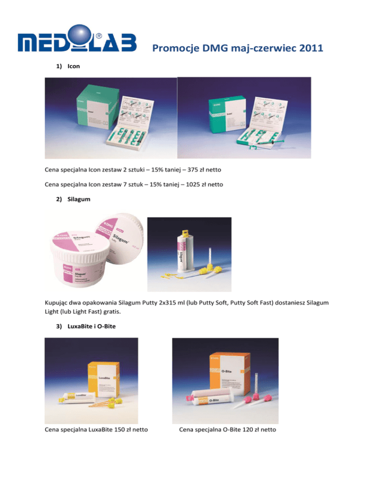 Promocje DMG maj-czerwiec 2011 1) Icon Cena specjalna Icon zestaw 2 sztuki – 15% taniej – 375 zł netto Cena specjalna Icon zestaw 7 sztuk – 15% taniej – 1025 zł netto 2) Silagum Kupując dwa opakowania Silagum Putty 2x315 ml (lub Putty Soft, Putty Soft Fast) dostaniesz Silagum Light (lub Light Fast) gratis. 3) LuxaBite i O-Bite Cena specjalna LuxaBite 150 zł netto Cena specjalna O-Bite 120 zł netto 4) Luxatemp Star Cena specjalna Luxatemp Star AM – 220 zł netto Cena specjalna Luxatemp Star SM – 90 zł netto 5) LuxaCore Z – rodzina produktów Kupując opakowanie LuxaCore-Z Dual i LuxaBond dostaniesz opakowanie LuxaPost Refill gratis. Obowiązują regularne rabaty umowne z klientami Medilab. Uwaga! Niektóre z ofert, w razie braku w magazynie, będą realizowane na zamówienie klienta!