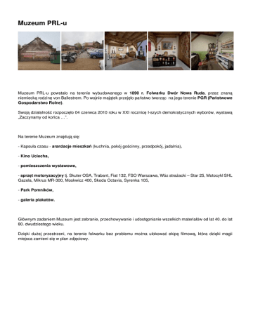Muzeum PRL-u Muzeum PRL-u powstało na terenie wybudowanego w 1890 r. Folwarku Dwór Nowa Ruda, przez znaną niemiecką rodzinę von Ballestrem. Po wojnie majątek przejęło państwo tworząc na jego terenie PGR (Państwowe Gospodarstwo Rolne). Swoją działalność rozpoczęło 04 czerwca 2010 roku w XXI rocznicę I-szych demokratycznych wyborów, wystawą „Zaczynamy od końca …”. Na terenie Muzeum znajdują się: - Kapsuła czasu - aranżacje mieszkań (kuchnia, pokój gościnny, przedpokój, jadalnia), - Kino Uciecha, - pomieszczenia wystawowe, - sprzęt motoryzacyjny tj. Skuter OSA, Trabant, Fiat 132, FSO Warszawa, Wóz strażacki – Star 25, Motocykl SHL Gazela, Mikrus MR-300, Moskwicz 400, Skoda Octavia, Syrenka 105, - Park Pomników, - galeria plakatów. Głównym zadaniem Muzeum jest zebranie, przechowywanie i udostępnianie wszelkich materiałów od lat 40. do lat 80. dwudziestego wieku. Dzięki dużej przestrzeni, na terenie folwarku bez problemu można ulokować ekipę filmową, która dzięki magii miejsca zamieni się w plan zdjęciowy. Informacje dodatkowe Wymagane zezwolenie: Tak Natężenie światła: Średnie Natężenie hałasu: Małe Media Odległość od bazy produkcyjnej: Na miejscu Możliwość dojazdu: Tak Powered by TCPDF (www.tcpdf.org)