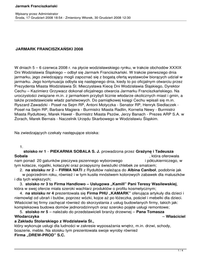 Jarmark Franciszkański Wpisany przez Administrator Środa, 17 Grudzień 2008 18:54 - Zmieniony Wtorek, 30 Grudzień 2008 12:30 JARMARK FRANCISZKAŃSKI 2008 W dniach 5 – 6 czerwca 2008 r. na płycie wodzisławskiego rynku, w trakcie obchodów XXXIX Dni Wodzisławia Śląskiego – odbył się Jarmark Franciszkański. W trakcie pierwszego dnia jarmarku, jego zwiedzający mogli zapoznać się z bogatą ofertą wystawców biorących udział w jarmarku. Jego kontynuacja odbyła się następnego dnia, kiedy to po oficjalnym otwarciu przez Prezydenta Miasta Wodzisławia Śl. Mieczysława Kiecę Dni Wodzisławia Śląskiego, Dyrektor Cechu – Kazimierz Grzywacz dokonał oficjalnego otwarcia Jarmarku Franciszkańskiego. Na uroczystości związane m.in. z jarmarkiem przybyli licznie włodarze okolicznych miast i gmin, a także przedstawiciele władz państwowych. Do pamiątkowej księgi Cechu wpisali się m.in. Ryszard Zawadzki - Poseł na Sejm RP, Antoni Motyczka - Senator RP, Henryk Siedlaczek Poseł na Sejm RP, Barbara Magiera - Burmistrz Miasta Radlin, Kornelia Newy - Burmistrz Miasta Rydułtowy, Marek Hawel - Burmistrz Miasta Pszów, Jerzy Banach - Prezes ARP S.A. w Żorach, Marek Bernais - Naczelnik Urzędu Skarbowego w Wodzisławiu Śląskim. Na zwiedzających czekały następujące stoiska: 1. stoisko nr 1 - PIEKARNIA SOBALA S. J. prowadzona przez Grażynę i Tadeusza Sobala , która oferowała nam ponad 20 gatunków pieczywa pszennego wyborowego i półcukierniczego, w tym kołacze, rogaliki, kołaczyki oraz przepyszny świeżutki chlebek ze smalcem; 2. na stoisku nr 2 – FIRMA NATI z Rydułtów należąca do Albina Caniboł, podobnie jak w poprzednim roku, również i w tym kusiła mnóstwem kolorowych zabawek dla maluszków i dla tych większych; 3. stoisko nr 3 to Firma Handlowo – Usługowa „Kamill” Pani Teresy Wasilewskiej, która w swej ofercie miała szeroki wachlarz produktów o profilu kosmetycznym; 4. na stoisku nr 4 prezentowała się Firma PHU „KAMARK” oferująca artykuły dla dzieci i niemowląt od ubrań i butów, poprzez wózki, kojce aż po łóżeczka, pościel i mebelki dla dzieci. Właściciel tej firmy zachęcał również do skorzystania z usług budowlanych firmy, takich jak: kompleksowa budowa domów jednorodzinnych oraz szeroko pojęte usługi remontowe; 5. stoisko nr 5 – należało do przedstawicieli branży drzewnej – Pana Tomasza Włodarczyka – Właściciel a Zakładu Stolarskiego z Wodzisławia Śl., który wykonuje usługi dla ludności w zakresie wyposażania wnętrz, m.in. drzwi, schody, boazerie, meble. Na stoisku tym prezentowała swoje wyroby również Firma „DREW-PROD” S.C. 1/4 Jarmark Franciszkański Wpisany przez Administrator Środa, 17 Grudzień 2008 18:54 - Zmieniony Wtorek, 30 Grudzień 2008 12:30 prowadzona przez Karola i Jacka Szypuła , w której ofercie mogliśmy znaleźć kołki meblowe, drążki ryflowane, drążki gładkie, łączniki meblowe, listwy drewniane, usługi tartaczne i drewno budowlane; 6. na stoisku nr 6 Pan Antoni Pawełek – Właściciel P.P.H.U „PAWEŁEK” z Syrynii oferował m.in. bramy, płoty, balustrady, schody metalowe, kraty, elementy małej architektury (mostki ogrodowe, daszki), wyroby ślusarskie (słupki ogrodzeniowe), konstrukcje stalowe, regały, automatykę do bram; 7. stoisko nr 7 przygotowane przez Administrację Cechu Rzemieślników i Innych Przedsiębiorców w Wodzisławiu Śl. promowało wszystkich rzemieślników i przedsiębiorców należących do wodzisławskiego cechu; 8. na stoisku nr 8 - Piekarnia „JO-MAR” S.C. z Gogołowej prowadzona przez Pana Jerzego Zoremba i Pana Marka Koniecznego oferowała wszystkim zwiedzającym pieczywo: pszenne, pszenno – żytnie, razowe, ciastka cukiernicze, a przede wszystkim tradycyjne kołacze i babki; 9. na stoisku nr 9 mogliśmy uzyskać szeroki wachlarz profesjonalnych usług motoryzacyjnych, zarówno w zakresie mechaniki pojazdowej, diagnostyki, elektroniki, blacharstwa, jak i lakiernictwa. Stoisko to zostało przygotowane przez Pa na Tomasza Sanecznik i Panią Judytę Sanecznik , prowadzących firmę SANECZNIK P.T.A. z Rydułtów; 10. stoisko nr 10 należało do Przedsiębiorstwa Produkcyjno – Handlowo – Usługowego Sprzętu Pożarniczego i Ochronnego „FIRE - SYSTEM” S.J. Lucjan Wnuk, Andrzej Kuźnik z Wodzisławia Śląskiego . Na stoisku tym mogliśmy uzyskać informacje na temat sprzętu przeciwpożarowego, a także na temat bezpośredniej obsługi tegoż sprzętu. Jako organizatorzy tegorocznego Jarmarku Franciszkańskiego chcielibyśmy bardzo serdecznie podziękować wszystkim firmom, które odpowiedziały na nasz apel i chętnie przyłączyły się do jego współorganizacji, a są to: Przedsiębiorstwo Komunalne „EKO-GLOB” Kuczaty Janusz; Zakład Budowlany KLIMEX Klimek Zbigniew; Przedsiębiorstwo Handlowo – Usługowe Aleksander Harnasz; Zakład Remontowo – Budowlany Bolesław Sitko; P.P.H.U. „PAWEŁEK” Antoni Pawełek; „DREW-PROD” S.C. Karol i Jacek Szypuła; Zakład Stolarski Tomasz Włodarczyk. Dziękujemy również producentowi domków – Krzysztofowi Kucza - właścicielowi F.P.H.U. “EUROCLAS”. Kolejny Jarmark Franciszkański już w przyszłym roku. Opracowały: Sylwia Moj i Anna Orszulik-Oślizlok 2/4 Jarmark Franciszkański Wpisany przez Administrator Środa, 17 Grudzień 2008 18:54 - Zmieniony Wtorek, 30 Grudzień 2008 12:30 JARMARK FRANCISZKAŃSKI 2007 15 czerwca 2007 r. wraz z wodzisławskim urzędem miasta zorganizowaliśmy, jak co roku w ramach XXXVIII Dni Wodzisławia Śląskiego, Jarmark Franciszkański. Po przybyciu na płytę wodzisławskiego rynku kolorowego korowodu przebierańców z wodzisławskich szkół, Mieczysław Kieca – Prezydent Miasta Wodzisławia Śląskiego otworzył XXXVIII Dni Wodzisławia Śląskiego, natomiast Jerzy Waltar – Starszy Cechu dokonał oficjalnego otwarcia Jarmarku Franciszkańskiego. W ciągu całego dnia można było brać udział w różnego rod