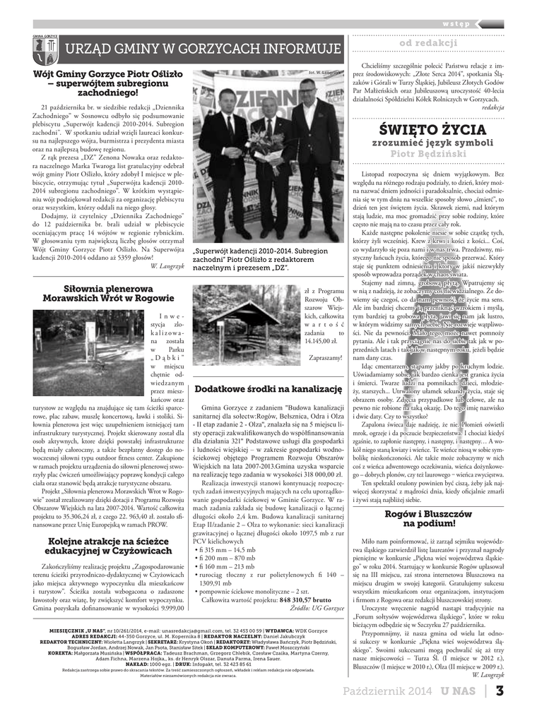wstęp od redakcji URZĄD GMINY W GORZYCACH INFORMUJE Wójt Gminy Gorzyce Piotr Oślizło – superwójtem subregionu zachodniego! 21 października br. w siedzibie redakcji „Dziennika Zachodniego” w Sosnowcu odbyło się podsumowanie plebiscytu „Superwójt kadencji 2010-2014. Subregion zachodni”. W spotkaniu udział wzięli laureaci konkursu na najlepszego wójta, burmistrza i prezydenta miasta oraz na najlepszą budowę regionu. Z rąk prezesa „DZ” Zenona Nowaka oraz redaktora naczelnego Marka Twaroga list gratulacyjny odebrał wójt gminy Piotr Oślizło, który zdobył I miejsce w plebiscycie, otrzymując tytuł „Superwójta kadencji 20102014 subregionu zachodniego”. W krótkim wystąpieniu wójt podziękował redakcji za organizację plebiscytu oraz wszystkim, którzy oddali na niego głosy. Dodajmy, iż czytelnicy „Dziennika Zachodniego” do 12 października br. brali udział w plebiscycie oceniającym pracę 14 wójtów w regionie rybnickim. W głosowaniu tym największą liczbę głosów otrzymał Wójt Gminy Gorzyce Piotr Oślizło. Na Superwójta kadencji 2010-2014 oddano aż 5359 głosów! W. Langrzyk Siłownia plenerowa Morawskich Wrót w Rogowie Inwestycja zlokalizowana została w Parku „Dąbki” w miejscu chętnie odwiedzanym przez mieszkańcow oraz turystow ze względu na znajdujące się tam ścieżki sparcerowe, plac zabaw, muszlę koncertową, ławki i stoliki. Siłownia plenerowa jest więc uzupełnieniem istniejącej tam infrastruktury turystycznej. Projekt skierowany został dla osob aktywnych, ktore dzięki powstałej infrastrukturze będą miały całoroczny, a także bezpłatny dostęp do nowoczesnej siłowni typu outdoor fitness center. Zakupione w ramach projektu urządzenia do siłowni plenerowej stworzyły plac ćwiczeń umożliwiający poprawę kondycji całego ciała oraz stanowić będą atrakcje turystyczne obszaru. Projekt „Siłownia plenerowa Morawskich Wrot w Rogowie” został zrealizowany dzięki dotacji z Programu Rozwoju Obszarow Wiejskich na lata 2007-2014. Wartość całkowita projektu to 35.306,24 zł, z czego 22. 963,40 zł. zostało sfinansowane przez Unię Europejską w ramach PROW. Kolejne atrakcje na ścieżce edukacyjnej w Czyżowicach Zakończyliśmy realizację projektu „Zagospodarowanie terenu ścieżki przyrodniczo-dydaktycznej w Czyżowicach jako miejsca aktywnego wypoczynku dla mieszkańcow i turystow”. Ścieżka została wzbogacona o zadaszone ławostoły oraz wiatę, by zwiększyć komfort wypoczynku. Gmina pozyskała dofinansowanie w wysokości 9.999,00 Chcieliśmy szczególnie polecić Państwu relacje z imprez środowiskowych: „Złote Serca 2014”, spotkania Ślązaków i Górali w Turzy Śląskiej, Jubileusz Złotych Godów Par Małżeńskich oraz Jubileuszową uroczystość 40-lecia działalności Spółdzielni Kółek Rolniczych w Gorzycach. redakcja fot. W. Langrzyk ŚWIĘTO ŻYCIA zrozumieć język symboli Piotr Będziński „Superwójt kadencji 2010-2014. Subregion zachodni” Piotr Oślizło z redaktorem naczelnym i prezesem „DZ”. zł z Programu Rozwoju Obszarow Wiejskich, całkowita w a r t o ś ć zadania to 14.145,00 zł. Zapraszamy! Dodatkowe środki na kanalizację Gmina Gorzyce z zadaniem "Budowa kanalizacji sanitarnej dla sołectw:Rogów, Bełsznica, Odra i Olza - II etap zadanie 2 - Olza", znalazła się na 5 miejscu listy operacji zakwalifikowanych do współfinansowania dla działania 321" Podstawowe usługi dla gospodarki i ludności wiejskiej – w zakresie gospodarki wodnościekowej objętego Programem Rozwoju Obszarów Wiejskich na lata 2007-2013.Gmina uzyska wsparcie na realizację tego zadania w wysokości 318 000,00 zł. Realizacja inwestycji stanowi kontynuację rozpoczętych zadań inwestycyjnych mających na celu uporządkowanie gospodarki ściekowej w Gminie Gorzyce. W ramach zadania zakłada się budowę kanalizacji o łącznej długości około 2,4 km. Budowa kanalizacji sanitarnej Etap II/zadanie 2 – Olza to wykonanie: sieci kanalizacji grawitacyjnej o łącznej długości około 1097,5 mb z rur PCV kielichowych ••fi 315 mm – 14,5 mb ••fi 200 mm – 870 mb ••fi 160 mm – 213 mb ••rurociąg tłoczny z rur polietylenowych fi 140 – 1309,91 mb •• pompownie ściekowe monolityczne – 2 szt. Całkowita wartość projektu: 848 310,57 brutto Źródło: UG Gorzyce MIESIĘCZNIK „U NAS”, nr 10/261/2014, e-mail: [email protected], tel. 32 453 00 59 | WYDAWCA: WDK Gorzyce ADRES REDAKCJI: 44-350 Gorzyce, ul. M. Kopernika 8 | REDAKTOR NACZELNY: Daniel Jakubczyk REDAKTOR TECHNICZNY: Wioletta Langrzyk | SEKRETARZ: Krystyna Okoń | REDAKTORZY: Władysława Bańczyk, Piotr Będziński, Bogusław Jordan, Andrzej Nowak, Jan Psota, Stanisław Sitek | SKŁAD KOMPUTEROWY: Paweł Moszczyński KOREKTA: Małgorzata Musińska | WSPÓŁPRACA: Tadeusz Brachman, Grzegorz Chlebik, Czesław Czaika, Martyna Czerny, Adam Fichna, Marzena Hojka,, ks. dr Henryk Olszar, Danuta Parma, Irena Sauer. NAKŁAD: 1000 egz. | DRUK: Infopakt, tel. 32 423 85 61 Redakcja zastrzega sobie prawo do skracania tekstów. Za treść zamieszczonych ogłoszeń, wkładek i reklam redakcja nie odpowiada. Materiałów niezamówionych redakcja nie zwraca. Listopad rozpoczyna się dniem wyjątkowym. Bez względu na różnego rodzaju podziały, to dzień, który można nazwać dniem jedności i paradoksalnie, chociaż odmienia się w tym dniu na wszelkie sposoby słowo „śmierć”, to dzień ten jest świętem życia. Skrawek ziemi, nad którym stają ludzie, ma moc gromadzić przy sobie rodziny, które często nie mają na to czasu przez cały rok. Każde następne pokolenie niesie w sobie cząstkę tych, którzy żyli wcześniej. Krew z krwi i kości z kości... Coś, co wydarzyło się poza nami i w nas trwa. Przedziwny, mistyczny łańcuch życia, którego nie sposób przerwać. Który staje się punktem odniesienia i który w jakiś niezwykły sposób wprowadza porządek w chaos świata. Sta