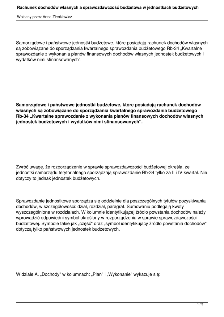 Rachunek dochodów własnych a sprawozdawczość budżetowa w jednostkach budżetowych Wpisany przez Anna Zienkiewicz Samorządowe i państwowe jednostki budżetowe, które posiadają rachunek dochodów własnych są zobowiązane do sporządzania kwartalnego sprawozdania budżetowego Rb-34 „Kwartalne sprawozdanie z wykonania planów finansowych dochodów własnych jednostek budżetowych i wydatków nimi sfinansowanych". Samorządowe i państwowe jednostki budżetowe, które posiadają rachunek dochodów własnych są zobowiązane do sporządzania kwartalnego sprawozdania budżetowego Rb-34 „Kwartalne sprawozdanie z wykonania planów finansowych dochodów własnych jednostek budżetowych i wydatków nimi sfinansowanych". Zwróć uwagę, że rozporządzenie w sprawie sprawozdawczości budżetowej określa, że jednostki samorządu terytorialnego sporządzają sprawozdanie Rb-34 tylko za II i IV kwartał. Nie dotyczy to jednak jednostek budżetowych. Sprawozdanie jednostkowe sporządza się oddzielnie dla poszczególnych tytułów pozyskiwania dochodów, w szczegółowości: dział, rozdział, paragraf. Sumowaniu podlegają kwoty wyszczególnione w rozdziałach. W kolumnie identyfikującej źródło powstania dochodów należy wprowadzić odpowiedni symbol określony w rozporządzeniu w sprawie sprawozdawczości budżetowej. Symbole takie jak „część" oraz „symbol identyfikujący źródło powstania dochodów" dotyczą tylko państwowych jednostek budżetowych. W dziale A. „Dochody" w kolumnach: „Plan" i „Wykonanie" wykazuje się: 1/3 Rachunek dochodów własnych a sprawozdawczość budżetowa w jednostkach budżetowych Wpisany przez Anna Zienkiewicz - w szczegółowości dział, rozdział, paragraf - odpowiednio planowane i zrealizowane wpływy środków pieniężnych na wydzielony rachunek dochodów własnych, - w wydzielonym wierszu „K 150" - stan środków pieniężnych na wydzielonym rachunku dochodów własnych na początku okresu sprawozdawczego. W dziale B. „Wydatki" w kolumnach: „Plan" i „Wykonanie" wykazuje się: - w szczegółowości: dział, rozdział paragraf - odpowiednio planowane i poniesione wydatki, - w wydzielonym wierszu „P 150" - stan środków pieniężnych na wydzielonym rachunku dochodów własnych na koniec okresu sprawozdawczego. W dziale C. wykazuje się według stanu na początek i koniec okresu sprawozdawczego: - w wierszu W 020 - należności netto, tj. należności po pomniejszeniu o odpis aktualizujący oraz odsetki od należności niezapłaconych w terminie, - w wierszu W 021 - kwotę odpisu aktualizującego należności, - w wierszu W 022 - kwotę odsetek od należności niezapłaconych w terminie, - w wierszu W 040 - zobowiązania. Pamiętaj, że początkiem okresu sprawozdawczego jest zawsze początek roku budżetowego, a końcem okresu sprawozdawczego jest dzień, na który sporządzasz sprawozdanie. Podstawa prawna: 2/3 Rachunek dochodów własnych a sprawozdawczość budżetowa w jednostkach budżetowych Wpisany przez Anna Zienkiewicz - Ustawa z 30 czerwca 2005 r. o finansach publicznych (Dz.U. nr 249, poz. 2104 z późn. zm.). - Ustawa z 29 września 1994 r. o rachunkowości (tekst jednolity: Dz.U. z 2002 r. nr 76, poz. 694 z późn. zm.). - Rozporządzenie Ministra Finansów z 27 czerwca 2006 r. w sprawie sprawozdawczości budżetowej (Dz.U. nr 115, poz. 781 z późn. zm.). 3/3