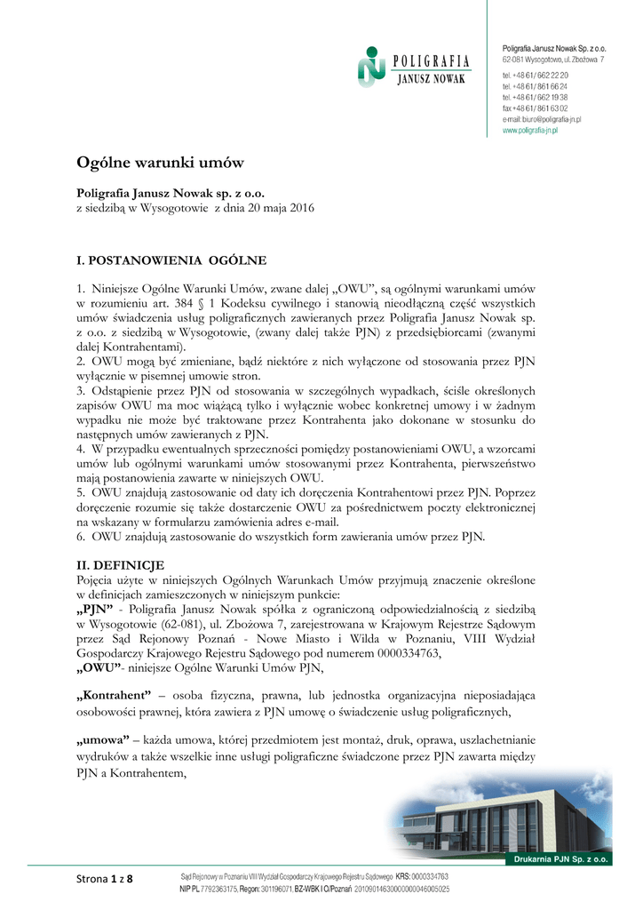 Ogólne warunki umów Poligrafia Janusz Nowak sp. z o.o. z siedzibą w Wysogotowie z dnia 20 maja 2016 I. POSTANOWIENIA OGÓLNE 1. Niniejsze Ogólne Warunki Umów, zwane dalej „OWU”, są ogólnymi warunkami umów w rozumieniu art. 384 § 1 Kodeksu cywilnego i stanowią nieodłączną część wszystkich umów świadczenia usług poligraficznych zawieranych przez Poligrafia Janusz Nowak sp. z o.o. z siedzibą w Wysogotowie, (zwany dalej także PJN) z przedsiębiorcami (zwanymi dalej Kontrahentami). 2. OWU mogą być zmieniane, bądź niektóre z nich wyłączone od stosowania przez PJN wyłącznie w pisemnej umowie stron. 3. Odstąpienie przez PJN od stosowania w szczególnych wypadkach, ściśle określonych zapisów OWU ma moc wiążącą tylko i wyłącznie wobec konkretnej umowy i w żadnym wypadku nie może być traktowane przez Kontrahenta jako dokonane w stosunku do następnych umów zawieranych z PJN. 4. W przypadku ewentualnych sprzeczności pomiędzy postanowieniami OWU, a wzorcami umów lub ogólnymi warunkami umów stosowanymi przez Kontrahenta, pierwszeństwo mają postanowienia zawarte w niniejszych OWU. 5. OWU znajdują zastosowanie od daty ich doręczenia Kontrahentowi przez PJN. Poprzez doręczenie rozumie się także dostarczenie OWU za pośrednictwem poczty elektronicznej na wskazany w formularzu zamówienia adres e-mail. 6. OWU znajdują zastosowanie do wszystkich form zawierania umów przez PJN. II. DEFINICJE Pojęcia użyte w niniejszych Ogólnych Warunkach Umów przyjmują znaczenie określone w definicjach zamieszczonych w niniejszym punkcie: „PJN” - Poligrafia Janusz Nowak spółka z ograniczoną odpowiedzialnością z siedzibą w Wysogotowie (62-081), ul. Zbożowa 7, zarejestrowana w Krajowym Rejestrze Sądowym przez Sąd Rejonowy Poznań - Nowe Miasto i Wilda w Poznaniu, VIII Wydział Gospodarczy Krajowego Rejestru Sądowego pod numerem 0000334763, „OWU”- niniejsze Ogólne Warunki Umów PJN, „Kontrahent” – osoba fizyczna, prawna, lub jednostka organizacyjna nieposiadająca osobowości prawnej, która zawiera z PJN umowę o świadczenie usług poligraficznych, „umowa” – każda umowa, której przedmiotem jest montaż, druk, oprawa, uszlachetnianie wydruków a także wszelkie inne usługi poligraficzne świadczone przez PJN zawarta między PJN a Kontrahentem, Strona 1 z 8 „specyfikacja techniczna” – dokument pt. „Specyfikacja techniczna przygotowania materiałów do druku oraz podstawowe normy jakościowe” zawierający szczegółową specyfikację przygotowania materiałów do druku wraz z normami jakościowymi obowiązującymi w PJN, dostępny pod adresem: http://www.poligrafia-jn.pl/PLH23/specyfikacja-techniczna.html, „harmonogram” - szczegółowy harmonogram realizacji przedmiotu umowy, określający w szczególności termin wykonania zamówienia, terminy składania oświadczeń przez strony, dostarczenia materiałów źródłowych i wszelkie inne terminy do dokonania czynności niezbędnych do wykonania umowy, „materiały źródłowe” - materiały w formie elektronicznej sporządzone przez Kontrahenta i przekazane PJN jako podstawa do wykonania przedmiotu zamówienia, „siła wyższa” - zdarzenie zewnętrzne, niemożliwe do przewidzenia i zapobieżenia nawet przy zachowaniu należytej staranności ocenianej przy uwzględnieniu treści art. 355 § 2 kodeksu cywilnego, III. ZŁOŻENIE ZAMÓWIENIA. ZAWARCIE UMOWY. 1. Kontrahent zainteresowany zawarciem umowy zwraca się za pośrednictwem poczty elektronicznej (e- mail na adres [email protected] lub inny podany przez PJN) lub telefonicznie do PJN z zapytaniem ofertowym, które powinno określać w szczególności: a) przedmiot zamówienia (montaż, druk, oprawa, uszlachetnianie wydruków itd.), b) zamierzoną, przybliżoną ilość materiałów, które będą zamawiane, c) format, d) objętość, e) specyfikację produktu/usługi z wykazem procesów (ilości kolorów, rodzaju oprawy, rodzaje wykończenia okładek, rodzaju uszlachetnień itp.). 2. Zapytanie, o którym mowa w pkt. III.1. stanowi podstawę do przygotowania przez PJN kalkulacji cenowej. Kalkulacja cenowa stanowi zaproszenie do rozpoczęcia rokowań w rozumieniu art. 71 kodeksu cywilnego. 3. Zawarcie umowy poprzedza złożenie przez Kontrahenta, zamówienia uwzględniającego wyniki rokowań jakie strony prowadziły w oparciu o kalkulację cenową. Zamówienie może być złożone za pośrednictwem poczty elektronicznej (e – mail) lub w formie pisemnej. 4. Złożenie zapytania jest równoznaczne z potwierdzeniem przez Kontrahenta, że zapoznał się ze specyfikacją techniczną i przyjmuje do wiadomości oraz zgadza się Strona 2 z 8 na wykonanie zamówienia przez PJN zgodnie z tą specyfikacją techniczną. Złożenie zamówienia jest także równoznaczne ze złożeniem przez Kontrahenta oświadczenia, że posiada pełne prawa autorskie do wszelkich materiałów (w tym logotypów, oznaczeń geograficznych i innych) przekazanych PJN w celu wykonania umowy oraz, że korzystanie przez PJN z tych materiałów w zakresie koniecznym do wykonania przedmiotu umowy nie będzie zagrażało ani naruszało jakichkolwiek praw osób trzecich, w szczególności majątkowych i osobistych praw autorskich oraz dóbr osobistych. Kontrahent zobowiązuje się, że osoby, którym przysługiwać będą prawa autorskie lub inne prawa własności intelektualnej do materiałów przekazanych przez Kontrahenta nie będą ich wykonywać w stosunku do PJN ani jego następców prawnych. 5. Zamówienie, oprócz informacji o których mowa w pkt. III.1.lit.a, c-e powinno zwierać co najmniej: a) dokładne określenie ilości zamawianych materiałów, b) wskazanie terminu wykonania zamówienia, c) rodzaj pakowania. 6. W przypadku Kontrahenta, który pierwszy raz składa zamówienie do PJN do zamówienia powinny zostać dołączone dokumenty: a) potwierdzające nadanie numeru NIP, b) potwierdzające nadanie numeru REGON, c) odpis z właściw