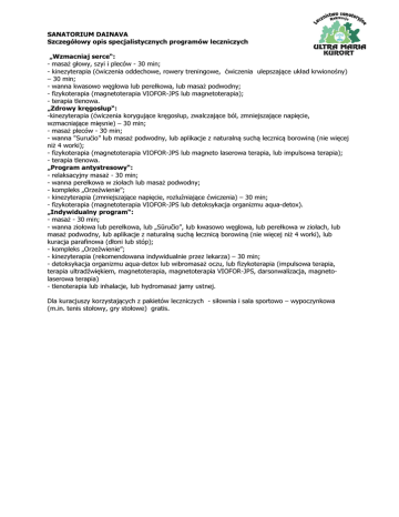 SANATORIUM DAINAVA Szczegółowy opis specjalistycznych programów leczniczych „Wzmacniaj serce“: - masaż głowy, szyi i pleców - 30 min; - kinezyterapia (ćwiczenia oddechowe, rowery treningowe, ćwiczenia ulepszające układ krwionośny) – 30 min; - wanna kwasowo węglowa lub perełkowa, lub masaż podwodny; - fizykoterapia (magnetoterapia VIOFOR-JPS lub magnetoterapia); - terapia tlenowa. „Zdrowy kręgosłup“: -kinezyterapia (ćwiczenia korygujące kręgosłup, zwalczające ból, zmniejszające napięcie, wzmacniające mięsnie) – 30 min; - masaż pleców - 30 min; - wanna "Surućio" lub masaż podwodny, lub aplikacje z naturalną suchą lecznicą borowiną (nie więcej niż 4 worki); - fizykoterapia (magnetoterapia VIOFOR-JPS lub magneto laserowa terapia, lub impulsowa terapia); - terapia tlenowa. „Program antystresowy“: - relaksacyjny masaż - 30 min; - wanna perełkowa w ziołach lub masaż podwodny; - kompleks „Orzeźwienie”; - kinezyterapia (zmniejszające napięcie, rozluźniające ćwiczenia) – 30 min; - fizykoterapia (magnetoterapia VIOFOR-JPS lub detoksykacja organizmu aqua-detox). „Indywidualny program“: - masaż - 30 min; - wanna ziołowa lub perełkowa, lub „Sūručio”, lub kwasowo węglowa, lub perełkowa w ziołach, lub masaż podwodny, lub aplikacje z naturalną suchą lecznicą borowiną (nie więcej niż 4 worki), lub kuracja parafinowa (dłoni lub stóp); - kompleks „Orzeźwienie”; - kinezyterapia (rekomendowana indywidualnie przez lekarza) – 30 min; - detoksykacja organizmu aqua-detox lub wibromasaż oczu, lub fizykoterapia (impulsowa terapia, terapia ultradźwiękiem, magnetoterapia, magnetoterapia VIOFOR-JPS, darsonwalizacja, magnetolaserowa terapia) - tlenoterapia lub inhalacje, lub hydromasaż jamy ustnej. Dla kuracjuszy korzystających z pakietów leczniczych - siłownia i sala sportowo – wypoczynkowa (m.in. tenis stołowy, gry stołowe) gratis.