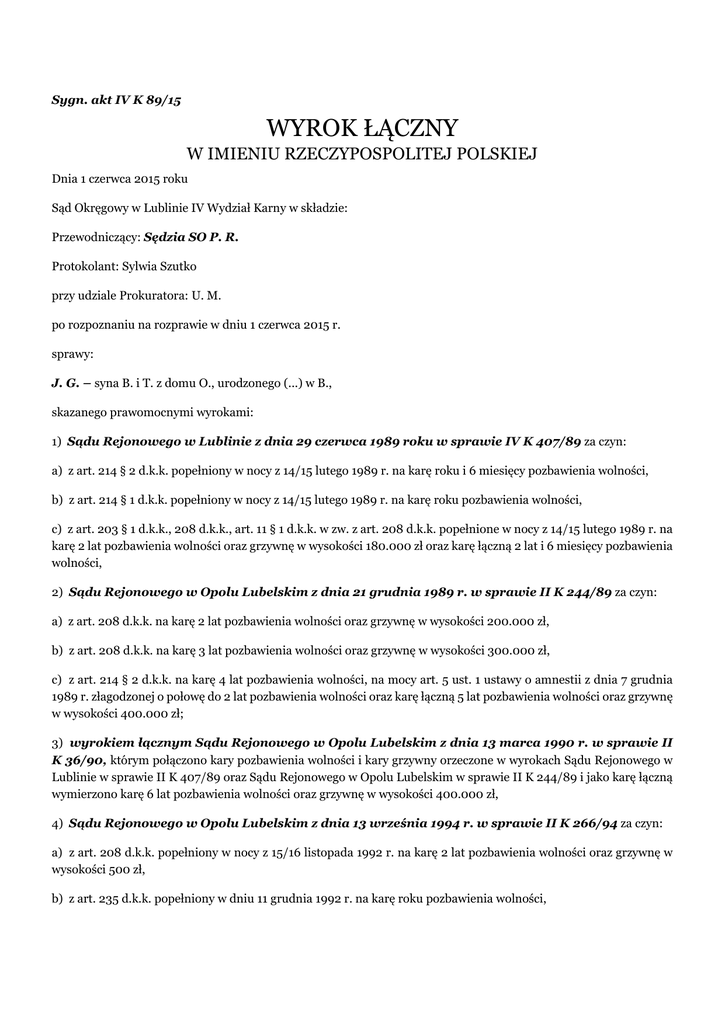 Sygn. akt IV K 89/15 WYROK ŁĄCZNY W IMIENIU RZECZYPOSPOLITEJ POLSKIEJ Dnia 1 czerwca 2015 roku Sąd Okręgowy w Lublinie IV Wydział Karny w składzie: Przewodniczący: Sędzia SO P. R. Protokolant: Sylwia Szutko przy udziale Prokuratora: U. M. po rozpoznaniu na rozprawie w dniu 1 czerwca 2015 r. sprawy: J. G. – syna B. i T. z domu O., urodzonego (...) w B., skazanego prawomocnymi wyrokami: 1) Sądu Rejonowego w Lublinie z dnia 29 czerwca 1989 roku w sprawie IV K 407/89 za czyn: a) z art. 214 § 2 d.k.k. popełniony w nocy z 14/15 lutego 1989 r. na karę roku i 6 miesięcy pozbawienia wolności, b) z art. 214 § 1 d.k.k. popełniony w nocy z 14/15 lutego 1989 r. na karę roku pozbawienia wolności, c) z art. 203 § 1 d.k.k., 208 d.k.k., art. 11 § 1 d.k.k. w zw. z art. 208 d.k.k. popełnione w nocy z 14/15 lutego 1989 r. na karę 2 lat pozbawienia wolności oraz grzywnę w wysokości 180.000 zł oraz karę łączną 2 lat i 6 miesięcy pozbawienia wolności, 2) Sądu Rejonowego w Opolu Lubelskim z dnia 21 grudnia 1989 r. w sprawie II K 244/89 za czyn: a) z art. 208 d.k.k. na karę 2 lat pozbawienia wolności oraz grzywnę w wysokości 200.000 zł, b) z art. 208 d.k.k. na karę 3 lat pozbawienia wolności oraz grzywnę w wysokości 300.000 zł, c) z art. 214 § 2 d.k.k. na karę 4 lat pozbawienia wolności, na mocy art. 5 ust. 1 ustawy o amnestii z dnia 7 grudnia 1989 r. złagodzonej o połowę do 2 lat pozbawienia wolności oraz karę łączną 5 lat pozbawienia wolności oraz grzywnę w wysokości 400.000 zł; 3) wyrokiem łącznym Sądu Rejonowego w Opolu Lubelskim z dnia 13 marca 1990 r. w sprawie II K 36/90, którym połączono kary pozbawienia wolności i kary grzywny orzeczone w wyrokach Sądu Rejonowego w Lublinie w sprawie II K 407/89 oraz Sądu Rejonowego w Opolu Lubelskim w sprawie II K 244/89 i jako karę łączną wymierzono karę 6 lat pozbawienia wolności oraz grzywnę w wysokości 400.000 zł, 4) Sądu Rejonowego w Opolu Lubelskim z dnia 13 września 1994 r. w sprawie II K 266/94 za czyn: a) z art. 208 d.k.k. popełniony w nocy z 15/16 listopada 1992 r. na karę 2 lat pozbawienia wolności oraz grzywnę w wysokości 500 zł, b) z art. 235 d.k.k. popełniony w dniu 11 grudnia 1992 r. na karę roku pozbawienia wolności, c) z art. 236 d.k.k. popełniony w dniu 11 grudnia 1992 r. na karę 6 miesięcy pozbawienia wolności oraz karę łączną 3 lat pozbawienia wolności; 5) Sądu Rejonowego w Opolu Lubelskim z dnia 9 grudnia 1994 r. w sprawie II K 440/94, zmienionym wyrokiem Sądu Wojewódzkiego w Lublinie z dnia 4 maja 1995 r. w sprawie V Kr 517/95, za dwa czyny z art. 211 d.k.k. popełnione w marcu 1994 r. na kary po roku pozbawienia wolności oraz grzywny w wysokości po 500 zł oraz karę łączną 2 lat pozbawienia wolności oraz grzywnę w wysokości 700 zł, 6) wyrokiem łącznym Sądu Rejonowego w Opolu Lubelskim z dnia 21 września 1995 r. w sprawie II K 274/95, którym połączono kary pozbawienia wolności i kary grzywny orzeczone w wyrokach Sądu Rejonowego w Opolu Lubelskim w sprawach II K 266/94 oraz II K 440/94 i jako karę łączną wymierzono karę 4 lat pozbawienia wolności oraz grzywnę w wysokości 800 zł; 7) Sądu Rejonowego w Lublinie z dnia 13 czerwca 2003 r. w sprawie IX K 253/03, zmienionym wyrokiem Sądu Okręgowego w Lublinie z dnia 10 marca 2004 r. w sprawie V Ka 1756/03, za czyn: a) z art. 13 § 1 k.k. w zw. z art. 279 § 1 k.k. popełniony w nocy z 4/5 grudnia 2002 r. na karę 2 lat pozbawienia wolności, b) z art. 224 § 2 k.k. popełniony w nocy z 4/5 grudnia 2002 r. na karę 6 miesięcy pozbawienia wolności, c) z art. 13 § 1 k.k. w zw. z art. 278 § 1 k.k. popełniony w dniu 29 marca 2001 r. na karę roku i 6 miesięcy pozbawienia wolności d) z art. 190 § 1 k.k. popełniony w dniu 29 marca 2001 r. na karę roku pozbawienia wolności oraz karę łączną 3 lat i 6 miesięcy pozbawienia wolności, na poczet której zaliczono oskarżonemu okresy pozbawienia wolności w sprawie od dnia 29 marca 2001 r. do dnia 30 marca 2001 r. oraz od dnia 5 grudnia 2002 r. do dnia 12 grudnia 2002 r.; 8) Sądu Okręgowego w Lublinie z dnia 5 kwietnia 2004 r. w sprawie IV K 359/02, utrzymanym w mocy wyrokiem Sądu Apelacyjnego w Lublinie z dnia 13 grudnia 2004 r. w sprawie II AKa 201/04 za czyn: a) z art. 280 § 2 k.k. w zb. z art. 158 § 1 k.k. w zw. z art. 11 § 2 k.k. w zw. z art. 64 § 2 k.k. popełniony w dniu 19 kwietnia 1999 r. na karę 7 lat pozbawienia wolności oraz grzywnę w wysokości 100 stawek dziennych, ustalając wysokość jednej stawki na kwotę 20 zł, b) z art. 263 § 2 k.k. popełniony w dniu 27 kwietnia 1999 r. na karę 6 miesięcy pozbawienia wolności oraz karę łączną 7 lat pozbawienia wolności, na poczet której zaliczono oskarżonemu okres pozbawienia wolności w sprawie od dnia 27 kwietnia 1999 r. do dnia 11 grudnia 2000 r.; 9) wyrokiem łącznym Sądu Okręgowego w Lublinie z dnia 17 maja 2005 r. w sprawie IV K 25/05, którym połączono kary pozbawienia wolności orzeczone w wyrokach Sądu Rejonowego w Lublinie w sprawie IX K 253/03 oraz Sądu Okręgowego w Lublinie w sprawie IV K 359/02 i jako karę łączną wymierzono karę 9 lat i 6 miesięcy pozbawienia wolności; 10) Sądu Rejonowego w Opolu Lubelskim z dnia 7 lutego 2006 r. w sprawie II K 189/04, zmienionym wyrokiem Sądu Okręgowego w Lublinie z dnia 28 czerwca 2006 r. w sprawie V Ka 616/06, sprostowanym postanowieniem Sądu Rejonowego w Opolu Lubelskim z dnia 16 sierpnia 2011 r. za czyn: a) z art. 279 § 1 k.k. w zw. z art. 64 § 1 k.k. popełniony w nocy na 1 sierpnia 2001 r. oraz w nocy na 13 sierpnia 2001 r., przy zastosowaniu art. 91 § 1 k.k., na karę 2 lat pozbawienia wolności oraz grzywnę w wysokości 150 stawek dziennych, ustalając wysokość jednej stawki na kwotę 20 zł, b) z art. 289 § 2 k.k. w zw. z art. 64 § 1 k.k. popełniony w nocy na 5 kwietnia 2002 r. na karę roku i 6 miesięcy pozbawienia wolności oraz grzywnę w wysokości 75 stawek 