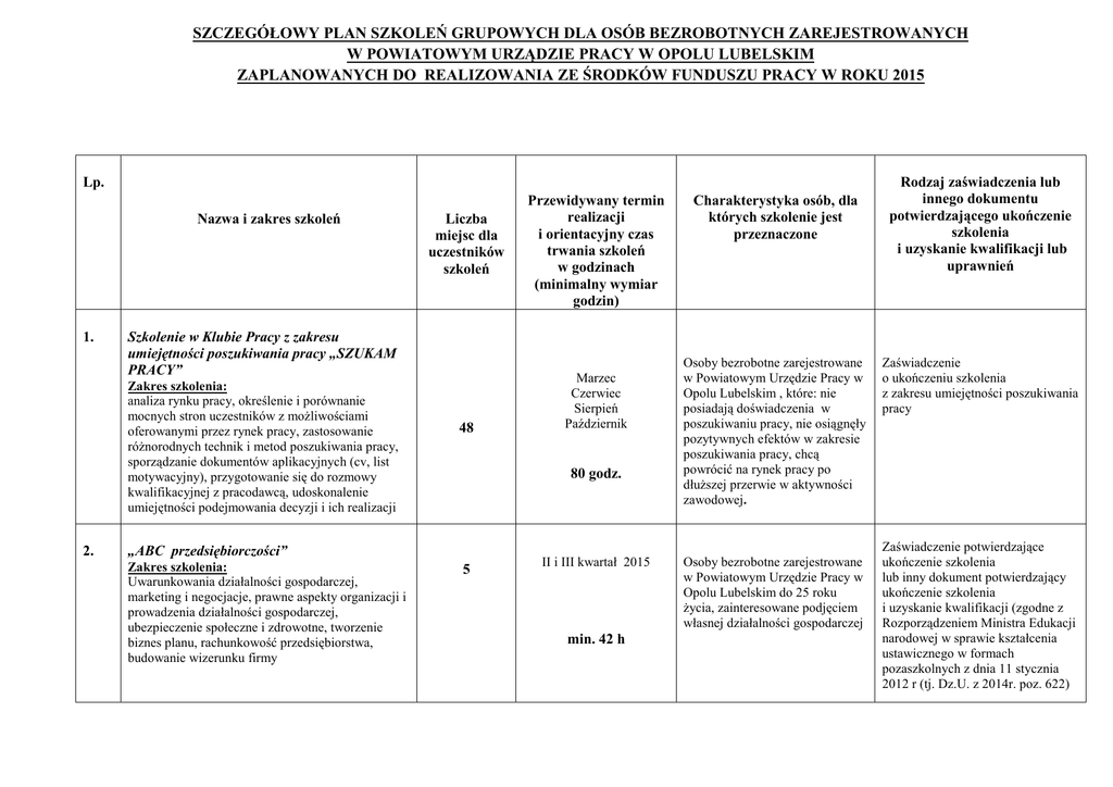 SZCZEGÓŁOWY PLAN SZKOLEŃ GRUPOWYCH DLA OSÓB BEZROBOTNYCH ZAREJESTROWANYCH W POWIATOWYM URZĄDZIE PRACY W OPOLU LUBELSKIM ZAPLANOWANYCH DO REALIZOWANIA ZE ŚRODKÓW FUNDUSZU PRACY W ROKU 2015 Lp. Nazwa i zakres szkoleń 1. Szkolenie w Klubie Pracy z zakresu umiejętności poszukiwania pracy „SZUKAM PRACY” Zakres szkolenia: analiza rynku pracy, określenie i porównanie mocnych stron uczestników z możliwościami oferowanymi przez rynek pracy, zastosowanie różnorodnych technik i metod poszukiwania pracy, sporządzanie dokumentów aplikacyjnych (cv, list motywacyjny), przygotowanie się do rozmowy kwalifikacyjnej z pracodawcą, udoskonalenie umiejętności podejmowania decyzji i ich realizacji 2. Liczba miejsc dla uczestników szkoleń 48 Marzec Czerwiec Sierpień Październik 80 godz. „ABC przedsiębiorczości” Zakres szkolenia: Uwarunkowania działalności gospodarczej, marketing i negocjacje, prawne aspekty organizacji i prowadzenia działalności gospodarczej, ubezpieczenie społeczne i zdrowotne, tworzenie biznes planu, rachunkowość przedsiębiorstwa, budowanie wizerunku firmy Przewidywany termin realizacji i orientacyjny czas trwania szkoleń w godzinach (minimalny wymiar godzin) 5 II i III kwartał 2015 min. 42 h Charakterystyka osób, dla których szkolenie jest przeznaczone Osoby bezrobotne zarejestrowane w Powiatowym Urzędzie Pracy w Opolu Lubelskim , które: nie posiadają doświadczenia w poszukiwaniu pracy, nie osiągnęły pozytywnych efektów w zakresie poszukiwania pracy, chcą powrócić na rynek pracy po dłuższej przerwie w aktywności zawodowej. Osoby bezrobotne zarejestrowane w Powiatowym Urzędzie Pracy w Opolu Lubelskim do 25 roku życia, zainteresowane podjęciem własnej działalności gospodarczej Rodzaj zaświadczenia lub innego dokumentu potwierdzającego ukończenie szkolenia i uzyskanie kwalifikacji lub uprawnień Zaświadczenie o ukończeniu szkolenia z zakresu umiejętności poszukiwania pracy Zaświadczenie potwierdzające ukończenie szkolenia lub inny dokument potwierdzający ukończenie szkolenia i uzyskanie kwalifikacji (zgodne z Rozporządzeniem Ministra Edukacji narodowej w sprawie kształcenia ustawicznego w formach pozaszkolnych z dnia 11 stycznia 2012 r (tj. Dz.U. z 2014r. poz. 622) 3. „Magazynier z obsługą wózków jezdniowych z napędem silnikowym” Zakres szkolenia: Przepisy i normy w magazynowaniu, organizacja gospodarki magazynowej, zagospodarowanie magazynu i technologia magazynowania, prowadzenie dokumentacji; obieg dokumentów i towarów; wydawanie towarów z magazynu, zapasycel i funkcja zapasów, nowoczesne metody gospodarowania zapasami, systemy ewidencji zapasów, obsługa i prezentacja komputerowych programów używanych w magazynie, typy stosowanych wózków widłowych, budowa wózków, czynności operatora przy obsłudze wózka widłowego, wiadomości z zakresu ładunkoznawstwa, BHP w zawodzie, wiadomości o dozorze technicznym, praktyczna nauka jazdy i manewrowania wózkami widłowymi. Egzamin państwowy przed Urzędem Dozoru Technicznego; obsługa kasy fiskalne i terminali kart płatniczych, obsługa komputera i programów komputerowych wykorzystywanych w handlu; 4. „Sprzedawca z obsługa kasy fiskalnej z minimum sanitarnym” 10 min.100 h 5 Zakres szkolenia: Obsługa kasy fiskalnej i terminali płatniczych, metkownicy, techniki skutecznej sprzedaży, towaroznastwo, organizacja pracy sprzedawcy, profesjonalna obsługa klienta, podstawowe zasady reklamy i marketingu, techniki negocjacyjne, w procesie sprzedaży, minimum sanitarne. 5. „Operator koparko ładowarki kl .III” Zakres szkolenia: Użytkowanie eksploatacyjne, dokumentacja techniczna, bezpieczeństwo i higiena pracy, podstawy elektrotechniki, silniki spalinowe, elementy hydrauliki, budowa koparko- I i II kwartał 2015 10 III i IV kwartał min. 45 h I i IV kwartał 2015 min.132h Osoby bezrobotne zarejestrowane w PUP w Opolu Lubelskim do 30 roku życia, mieszkańcy wsi , posiadające wykształcenie minimum zawodowe posiadające wykształcenie minimum zawodowe, brak przeciwwskazań lekarskich do odbywania szkolenia potwierdzony zaświadczeniem lekarskim., umiejętność obsługi komputera w zakresie podstawowym. Szkolenie realizowane w ramach Programu Regionalnego „Ludzie Młodzi” Dokument uprawniający do obsługi wózka jezdniowego potwierdzony przez Urząd Dozoru Technicznego oraz zaświadczenie potwierdzające ukończenie szkolenia lub inny dokument potwierdzający ukończenie szkolenia i uzyskanie kwalifikacji (zgodne z Rozporządzeniem Ministra Edukacji narodowej w sprawie kształcenia ustawicznego w formach pozaszkolnych z dnia 11 stycznia 2012 r (tj. Dz.U. z 2014r. poz. 662). Osoby bezrobotne zarejestrowane w PUP w Opolu Lubelskim powyżej 50 roku życia posiadające wykształcenie minimum zawodowe, posiadające wykształcenie minimum zawodowe, brak przeciwwskazań lekarskich do odbywania szkolenia potwierdzony zaświadczeniem lekarskim. Szkolenie realizowane w ramach rezerwy ministra dla osób powyżej 50 roku życia” Osoby bezrobotne zarejestrowane w PUP w Opolu Lubelskim, które ukończyły 30 rok życia a nie ukończyły 50 roku życia , posiadające wykształcenie minimum zawodowe, brak przeciwwskazań lekarskich do Zaświadczenie potwierdzające ukończenie szkolenia lub inny dokument potwierdzający ukończenie szkolenia i uzyskanie kwalifikacji (zgodne z Rozporządzeniem Ministra Edukacji narodowej w sprawie kształcenia ustawicznego w formach pozaszkolnych z dnia 11 stycznia 2012 r (tj. Dz.U. z 2014r. poz. 622 Zaświadczenie potwierdzające ukończenie szkolenia lub inny dokument potwierdzający ukończenie szkolenia i uzyskanie kwalifikacji (zgodne z Rozporządzeniem Ministra Edukacji narodowej w sprawie kształcenia odbywania szkolenia potwierdzony zaświadczeniem lekarskim. Szkolenie realizowane w ramach rezerwy ministra . ładowarki, technologia robót, zajęcia praktyczne. 6. „Pracownik małej gastronomii z elementami de
