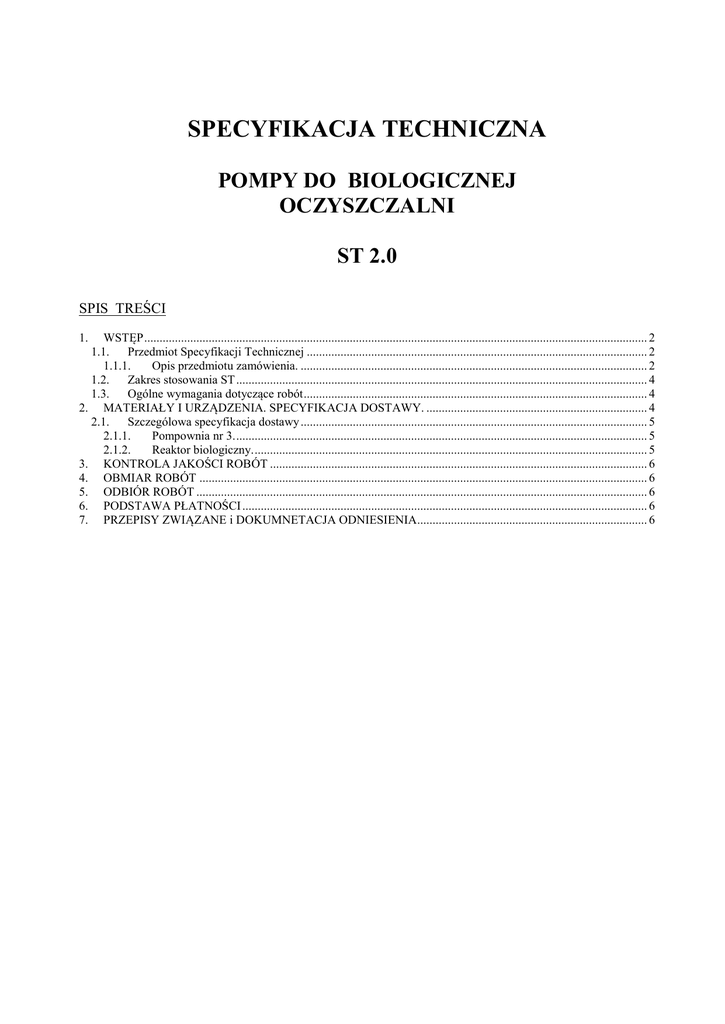 SPECYFIKACJA TECHNICZNA POMPY DO BIOLOGICZNEJ OCZYSZCZALNI ST 2.0 SPIS TREŚCI WSTĘP .................................................................................................................................................................... 2 1.1. Przedmiot Specyfikacji Technicznej ............................................................................................................... 2 1.1.1. Opis przedmiotu zamówienia. ................................................................................................................. 2 1.2. Zakres stosowania ST ...................................................................................................................................... 4 1.3. Ogólne wymagania dotyczące robót ................................................................................................................ 4 2. MATERIAŁY I URZĄDZENIA. SPECYFIKACJA DOSTAWY. ........................................................................ 4 2.1. Szczególowa specyfikacja dostawy ................................................................................................................. 5 2.1.1. Pompownia nr 3. ...................................................................................................................................... 5 2.1.2. Reaktor biologiczny. ................................................................................................................................ 5 3. KONTROLA JAKOŚCI ROBÓT ........................................................................................................................... 6 4. OBMIAR ROBÓT .................................................................................................................................................. 6 5. ODBIÓR ROBÓT ................................................................................................................................................... 6 6. PODSTAWA PŁATNOŚCI .................................................................................................................................... 6 7. PRZEPISY ZWIĄZANE i DOKUMNETACJA ODNIESIENIA........................................................................... 6 1. Specyfikacje Techniczne Wykonania i Odbioru Robót ST 1.0 1. WSTĘP 1.1. Przedmiot Specyfikacji Technicznej Przedmiotem niniejszej specyfikacji technicznej są wymagania dotyczące dostawy pomp do biologicznej oczyszczalni ścieków farbiarskich podczyszczonych chemicznie. 1.1.1. Opis przedmiotu zamówienia. 1.1.1.1. Opis gospodarki ściekowej zakładu. Ścieki zakładowe powstają w procesie farbowania tkanin oraz wykonywania nadruków na tkaninach. Podczas farbowania każda maszyna pracuje w następujących cyklach: 1 – pranie i podbielanie nadtlenkiem wodoru 2 –płukanie ciepłe 3 – płukanie zimne 4 – barwienie 5 – płukanie zimne po barwieniu 6 – płukanie ciepłe z kwasem octowym 7 – pranie ciepłe 98st.C 8 – pranie ciepłe 80st.C 9 – płukanie ciepłe 60st.C 10 – płukanie zimne 11 – utrwalanie kwasem octowym 12 - zmiękczanie Z jednego cyklu do kanalizacji z maszyn farbiarskich trafia max. 16m3 ścieków ( w zależności od ilości uruchamianych maszyn). W ciągu doby każda maszyna może wykonać max 3 farbowania. Po wykonaniu kolorowych nadruków tkaniny są kierowane do prania w następujących cyklach: 5 – płukanie zimne po barwieniu 6 – płukanie ciepłe z kwasem octowym 7 – pranie ciepłe 98st.C 8 – pranie ciepłe 80st.C 9 – płukanie ciepłe 60st.C 10 – płukanie zimne 11 – utrwalanie kwasem octowym 12 - zmiękczanie Łączna ilość ścieków wytwarzanych na terenie zakładu wynosi: Qśrd = 500m3/d, Qmaxd = 576m3/d. Qmaxh = 60m3/h Skład ścieków surowych w próbach uśrednionych dobowych przedstawiono w poniższej tabeli. 2 Specyfikacje Techniczne Wykonania i Odbioru Robót ST 1.0 SKŁAD ŚCIEKOW. L.p. 1 2 3 4 5 6 7 8 9 10 Wskaźnik Jednostki Odczyn ChZT BZT5 Zawiesina Azot ogólny Fosfor ogólny Chlorki Siarczany Ekstrakt eterowy Detergenty anionowe pH gO2/m3 gO2/m3 g/m3 g/m3 g/m3 g/m3 g/m3 g/m3 g/m3 Wartość min. 9,0 1000 460 80 20 2,0 2800 150 20 0,9 Wartość max. 11,0 3000 1000 200 40 4,0 3800 600 60 3,0 Wartość średnia 9,5 2000 760 120 30 3,5 3300 340 40 1,5 1.1.1.2. Opis technologii podczyszczania ścieków. Na podstawie badań technologicznych stwierdzono, że ścieki z farbowania oraz prania po farbowaniu (spust z cyklu nr 4,5,6,7 i ew.1) powinny być poddane koagulacji lub utlenieniu chemicznemu metodą Fentona. Na odpływie z każdej maszyny zostanie zamontowany zawór trójdrożny, który kierować będzie ścieki do jednej z trzech pompowni. Pompownia nr 1 przetłacza ścieki do zbiornika retencyjnego nr1 przed utlenianiem chemicznym, pompownia nr 2 przetłacza ścieki do zbiornika retencyjnego nr 2 przed koagulacją, natomiast pompownia nr 3 podaje pozostałe ścieki do zbiornika wyrównawczego nr3, do którego trafiać będą również ścieki po podczyszczeniu chemicznym. Ścieki ze zbiornika nr 3 będą podawane na reaktor biologicznego oczyszczania. Dodatkowo do pompowni nr 3 będą podawane ścieki dowożone, przyjmowane w celu uzupełnienia ścieków w biogenny oraz inne mikro i makroelementy. W procesie koagulacji oraz utleniania chemicznego powstają osady chemiczne, które będą odwadniane na dwóch prasach komorowych o wydajności 700kgsm/d każda. Wszystkie procesy jednostkowe prowadzone będą w urządzeniach zlokalizowanych w budynku oczyszczalni ścieków. Dodatkowo na wyposażeniu budynku znajdować się będą urządzenia do końcowej flotacji osadu czynnego, po procesie biologicznego oczyszczania ścieków, w celu oddzielenia osadu od ścieków oczyszczonych. Osad czynny po flotacji zawracany będzie do komory osadu czynnego, a jego nadmiar odprowadzany będzie do zbiornika osadu (zbiornik nr 4) i stąd podawany do odwodnienia na prasie komorowej. Ścieki oczyszczone kierowane będą do p