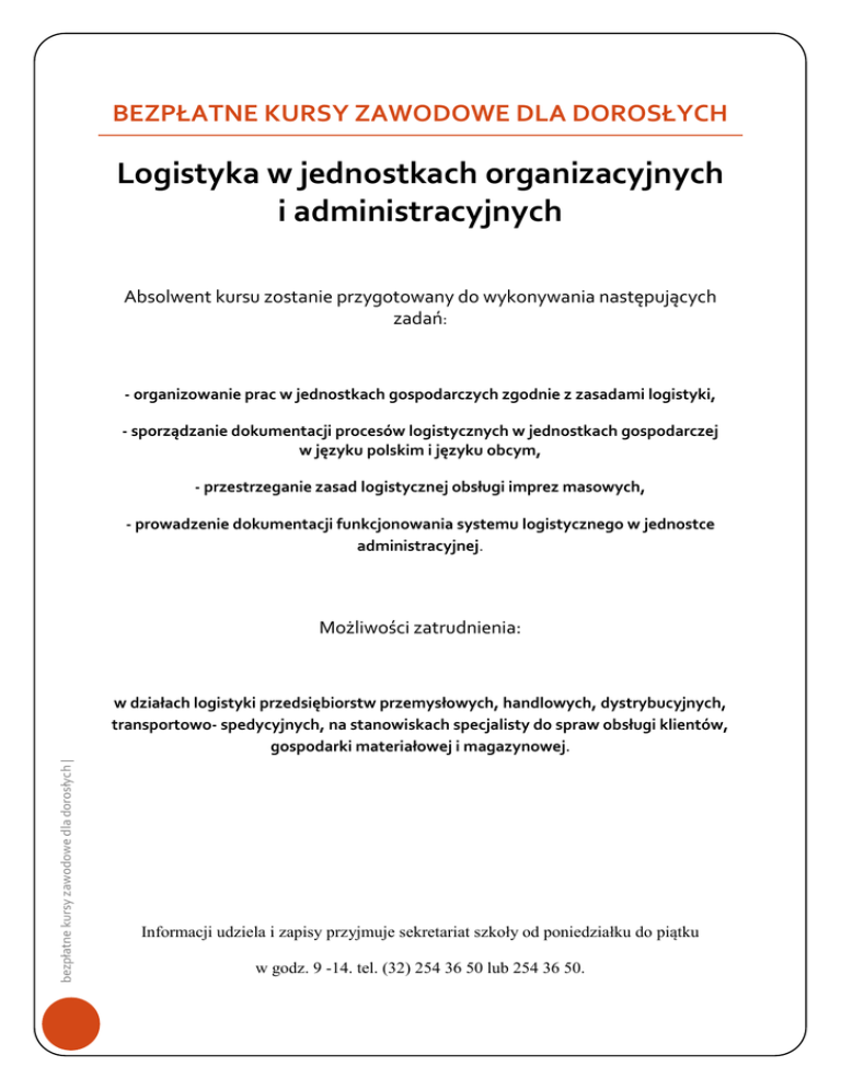 BEZPŁATNE KURSY ZAWODOWE DLA DOROSŁYCH Logistyka w jednostkach organizacyjnych i administracyjnych Absolwent kursu zostanie przygotowany do wykonywania następujących zadań: - organizowanie prac w jednostkach gospodarczych zgodnie z zasadami logistyki, - sporządzanie dokumentacji procesów logistycznych w jednostkach gospodarczej w języku polskim i języku obcym, - przestrzeganie zasad logistycznej obsługi imprez masowych, - prowadzenie dokumentacji funkcjonowania systemu logistycznego w jednostce administracyjnej. Możliwości zatrudnienia: bezpłatne kursy zawodowe dla dorosłych | w działach logistyki przedsiębiorstw przemysłowych, handlowych, dystrybucyjnych, transportowo- spedycyjnych, na stanowiskach specjalisty do spraw obsługi klientów, gospodarki materiałowej i magazynowej. Informacji udziela i zapisy przyjmuje sekretariat szkoły od poniedziałku do piątku w godz. 9 -14. tel. (32) 254 36 50 lub 254 36 50.
