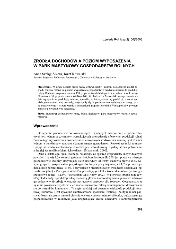 Inżynieria Rolnicza 2(100)/2008 ŹRÓDŁA DOCHODÓW A POZIOM WYPOSAŻENIA W PARK MASZYNOWY GOSPODARSTW ROLNYCH Anna Szeląg-Sikora, Józef Kowalski Katedra Inżynierii Rolniczej i Informatyki, Uniwersytet Rolniczy w Krakowie Streszczenie. W pracy podjęto próbę oceny wpływu liczby i rodzaju posiadanych źródeł dochodu rodziny rolnika na poziom wyposażenia gospodarstw w środki techniczne do produkcji rolnej. Badania przeprowadzono w 150 gospodarstwach Małopolski a uzyskane wyniki weryfikowano w 30 gospodarstwach Wielkopolski. W obiektach z Małopolski zaangażowanie rodzin wyłącznie w produkcję rolniczą, sprawiło, że intensywność tej produkcji, a co za tym idzie generowane z niej dochody, przyczyniły się do posiadania najlepiej wyposażonego parku maszynowego – w porównaniu z pozostałymi grupami. Wyniki z Wielkopolski w pewnym zakresie potwierdziły tą zależność. Słowa kluczowe: gospodarstwo rolne, źródła dochodów, park maszynowy, wartość odtworzeniowa Wprowadzenie Dostępność gospodarstw do nowoczesnych i wydajnych maszyn oraz urządzeń rolniczych jest jednym z czynników warunkujących prowadzenie efektywnej produkcji rolnej. Poziom tego wyposażenia i nowoczesność stosowanych środków mechanizacji jest również jednym z wyróżników rozwoju ekonomicznego gospodarstw. Rozwój techniki rolniczej i popyt na środki mechanizacji rolnictwa jest warunkowany z jednej strony potrzebami, z drugiej zaś możliwościami ich realizacji [Muzalewski 2000]. Dane z ostatniego Spisu Rolnego, wskazują, że spośród gospodarstw indywidualnych powyżej 1 ha użytków rolnych głównym źródłem dochodu dla 30% jest praca we własnym gospodarstwie. Rolnicy utrzymujący się z emerytury lub renty, stanowią prawie 25%. Kolejne grupy to: gospodarstwa pozyskujące dochody z pracy najemnej - 23,6%, prowadzące działalność pozarolniczą - 5,3%, korzystające z niezarobkowych świadczeń socjalnych (np. zasiłki socjalne) - 4% i grupa obiektów posiadających kilka źródeł dochodów (w tym gospodarstwo rolne) - 12,3% [Powszechny Spis Rolny 2002]. W pierwszej grupie rolników, których dochody z produkcji rolnej stanowią główne źródło utrzymania, praca we własnym gospodarstwie absorbuje większość posiadanych zasobów siły roboczej. Gospodarstwa te są silnie powiązane z rynkiem i ich szanse rozwojowe zależą od umiejętności dostosowania się do warunków konkurencji. Ta część polskiej wsi dostarcza większość produkcji towarowej rolnictwa i jest żywotnie zainteresowana sposobami realizacji polityki rolnej państwa. Pozostałe grupy stanowi głównie wielozawodowa ludność chłopska, wykorzystująca gospodarowanie w rolnictwie jako uzupełniające źródło dochodów i samozaopatrzenia 269 Anna Szeląg-Sikora, Józef Kowalski Sytuacja materialna tej grupy jest na ogół bardzo skromna, ale dość stabilna, stosunkowo mało podatna na silniejsze perturbacje płynące z rynku. Proces modernizacji mogą podejmować tylko potencjalnie rozwojowe (przyszłościowe) gospodarstwa rolnicze, a więc gospodarstwa, które uzyskują dochody pozwalające prowadzić odtworzeniową działalność inwestycyjną w zakresie posiadanych środków trwałych. Dotyczy to dostępu do nowych środków technicznych i energetycznych będących nośnikami postępu technologicznego w modernizowanym gospodarstwie. Wygospodarowanie środków finansowych wewnętrznych jak i zewnętrznych powinno wynikać z mądrego zarządzania działalnością gospodarstwa oraz umiejętnego obniżania kosztów własnych [Szeląg-Sikora 2007]. Cel, zakres oraz przedmiot badań Przyjmując zasoby finansowe gospodarstw rolnych za jeden z głównych czynników umożliwiających modernizację zaplecza technicznego, dokonano analizy ilościowego wyposażenia oraz wartości odtworzeniowej parku maszynowego w aspekcie ilości dostępnych źródeł dochodów rodziny chłopskiej. Zakresem badań objęto 150 gospodarstw zlokalizowanych w Małopolsce oraz w celach porównawczych 30 obiektów z Wielkopolski. Obliczenia analizowanych wskaźników dokonano zgodnie z metodyką stosowaną w Katedrze Inżynierii Rolniczej i Informatyki [Kowalski i in. 2002]. Wydzielono również trzy grupy gospodarstw w zależności od liczby i jakości posiadanych źródeł dochodu: – jedno źródło dochodu – gospodarstwo rolne, – dwa źródła dochodu – gospodarstwo rolne + jedno inne, – trzy lub więcej źródeł dochodu – gospodarstwo rolne + inne. Spośród innych źródeł dochodu, tj. spoza gospodarstwa, do najczęściej wymienianych należały: stała praca zarobkowa, zarobki dorywcze, źródła niezarobkowe (renty, emerytury, zasiłki socjalne). Wśród badanych gospodarstw z regionu Małopolski 16% utrzymywało się wyłącznie z działalności rolniczej, aż 60% deklarowało posiadanie dwóch źródeł dochodów, zaś w pozostałych 24% obiektów dochody z gospodarstwa były jednym z wielu źródeł dochodów (co najmniej trzech). W porównawczej próbie z Wielkopolski rozkład był podobny, tam również dominowały gospodarstwa o dwóch źródłach dochodu - 67%. Tabela 1. Podział gospodarstw wg liczby źródeł dochodów, z uwzględnieniem lokalizacji Tabela 1. Grouping of farms by the number of income sources, allowance made for the location Liczba źródeł dochodów Wyszczególnienie Małopolska Wielkopolska 1 źródło (gosp. rolne) 24 3 2 źródła (gosp.rolne+1in.) Liczba gospodarstw 90 20 3 źródła (gosp.+2 in. lub więcej) 36 7 Źródło: badania własne 270 Źródła dochodów... Zgodnie z przyjętym kryteriami, gospodarstwa będące przedmiotem badań musiały posiadać co najmniej podstawowe wyposażenie parku maszynowego. Przeprowadzone badania pozwoliły ustalić, iż każde z nich posiadało własny ciągnik. Średnia dla Małopolski wyniosła 1,3 szt.·gosp.-1, co przy średniej powierzchni 7,61 ha UR dało 0,2 szt.·ha-1UR. Region Wielkopolski charakteryzował się znacznie wyżs