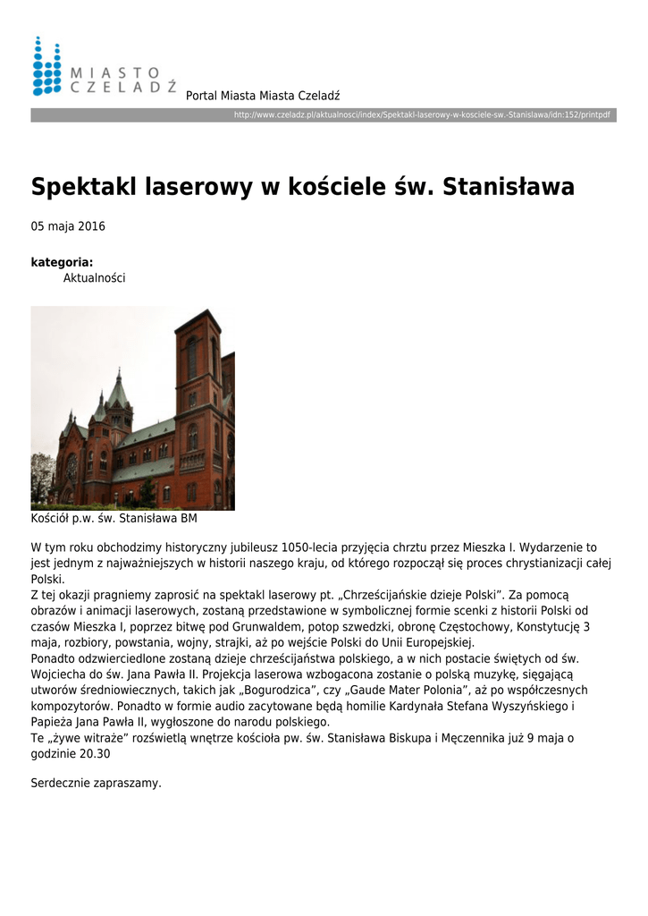 Portal Miasta Miasta Czeladź http://www.czeladz.pl/aktualnosci/index/Spektakl-laserowy-w-kosciele-sw.-Stanislawa/idn:152/printpdf Spektakl laserowy w kościele św. Stanisława 05 maja 2016 kategoria: Aktualności Kościół p.w. św. Stanisława BM W tym roku obchodzimy historyczny jubileusz 1050-lecia przyjęcia chrztu przez Mieszka I. Wydarzenie to jest jednym z najważniejszych w historii naszego kraju, od którego rozpoczął się proces chrystianizacji całej Polski. Z tej okazji pragniemy zaprosić na spektakl laserowy pt. „Chrześcijańskie dzieje Polski”. Za pomocą obrazów i animacji laserowych, zostaną przedstawione w symbolicznej formie scenki z historii Polski od czasów Mieszka I, poprzez bitwę pod Grunwaldem, potop szwedzki, obronę Częstochowy, Konstytucję 3 maja, rozbiory, powstania, wojny, strajki, aż po wejście Polski do Unii Europejskiej. Ponadto odzwierciedlone zostaną dzieje chrześcijaństwa polskiego, a w nich postacie świętych od św. Wojciecha do św. Jana Pawła II. Projekcja laserowa wzbogacona zostanie o polską muzykę, sięgającą utworów średniowiecznych, takich jak „Bogurodzica”, czy „Gaude Mater Polonia”, aż po współczesnych kompozytorów. Ponadto w formie audio zacytowane będą homilie Kardynała Stefana Wyszyńskiego i Papieża Jana Pawła II, wygłoszone do narodu polskiego. Te „żywe witraże” rozświetlą wnętrze kościoła pw. św. Stanisława Biskupa i Męczennika już 9 maja o godzinie 20.30 Serdecznie zapraszamy.