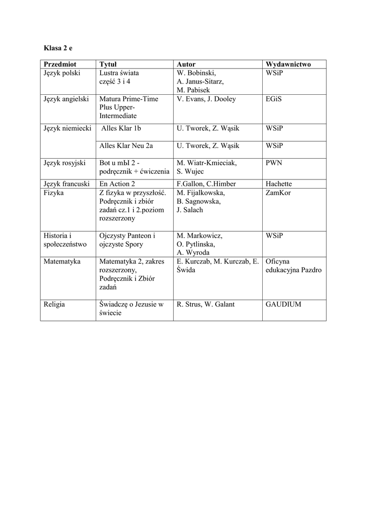Klasa 2 e Przedmiot Język polski Tytuł Lustra świata część 3 i 4 Język angielski Matura Prime-Time Plus UpperIntermediate Język niemiecki Autor W. Bobinski, A. Janus-Sitarz, M. Pabisek V. Evans, J. Dooley Wydawnictwo WSiP Alles Klar 1b U. Tworek, Z. Wąsik WSiP Alles Klar Neu 2a U. Tworek, Z. Wąsik WSiP EGiS Język rosyjski Bot u mЫ 2 M. Wiatr-Kmieciak, podręcznik + ćwiczenia S. Wujec PWN Język francuski Fizyka En Action 2 Z fizyka w przyszłość. Podręcznik i zbiór zadań cz.1 i 2.poziom rozszerzony F.Gallon, C.Himber M. Fijalkowska, B. Sagnowska, J. Salach Hachette ZamKor Historia i społeczeństwo Ojczysty Panteon i ojczyste Spory Matematyka Matematyka 2, zakres rozszerzony, Podręcznik i Zbiór zadań M. Markowicz, WSiP O. Pytlinska, A. Wyroda E. Kurczab, M. Kurczab, E. Oficyna Świda edukacyjna Pazdro Religia Świadczę o Jezusie w świecie R. Strus, W. Galant GAUDIUM