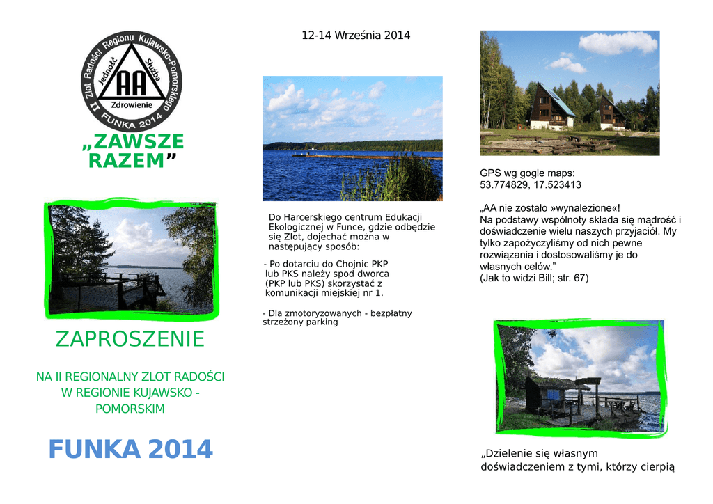 12-14 Września 2014 „ZAWSZE RAZEM” GPS wg gogle maps: 53.774829, 17.523413 Do Harcerskiego centrum Edukacji Ekologicznej w Funce, gdzie odbędzie się Zlot, dojechać można w następujący sposób: - Po dotarciu do Chojnic PKP lub PKS należy spod dworca (PKP lub PKS) skorzystać z komunikacji miejskiej nr 1. ZAPROSZENIE „AA nie zostało »wynalezione«! Na podstawy wspólnoty składa się mądrość i doświadczenie wielu naszych przyjaciół. My tylko zapożyczyliśmy od nich pewne rozwiązania i dostosowaliśmy je do własnych celów.” (Jak to widzi Bill; str. 67) - Dla zmotoryzowanych - bezpłatny strzeżony parking NA II REGIONALNY ZLOT RADOŚCI W REGIONIE KUJAWSKO POMORSKIM FUNKA 2014 „Dzielenie się własnym doświadczeniem z tymi, którzy cierpią przekazanie im sposobów skutecznej pomocy ma szczególną wartość w naszym życiu.” Anonimowi Alkoholicy str. 109 Drodzy Przyjaciele! Zlot to jedna z wielu okazji aby poczuć jedność wspólnoty, docenić korzyści płynące z działania Programu AA i okazać radość płynącą z trzeźwości. Zlot jest okazją do dzielenia się doświadczeniem, ale także do wspólnego świętowania, radości i odpoczynku. Serdecznie zapraszamy, do zobaczenia! Organizatorzy zlotu: Region Kujawsko-Pomorski AA Zapraszamy na drugi Zlot Radości w naszym Regionie. W tym roku przypada I Rocznica naszego Biuletynu Regionalnego „WISŁA”. Serdecznie oraz gorąco zapraszamy Was z rodzinami i Przyjaciółmi. Spotkamy się w Funce- dzieląc się doświadczeniem, siłą i nadzieją pamiętając o tym, iż miejsca tworzą ludzie. Funka-położona nad Jeziorem Charzykowskim, to wspaniałe miejsce do wypoczynku i spotkań. Świętujemy wspólnie dar trzeźwości w tym pięknym miejscu. 16:00 Koncert - Jerzy Fiedorczuk 18:00 Kolacja 20:00 Zabawa taneczna 20:00 Miting AA Niedziela 14 września 8:00 Śniadanie 10:00 Miting AA 12:00 Zakończenie Zlotu 13:00 Obiad Ośrodek dysponuje i oferuje: - wypożyczalnia rowerów i żaglówek -boisko do siatkówki i koszykówki - rejs statkiem „Bałtyk” po jeziorze Charzykowskim - tor łuczniczy Program Zlotu „Zawsze Razem” Funka 2014 Piątek 12 września Zakwaterowanie - koszty pobytu 2 noclegi z wyżywieniem 12:00 Rejestracja uczestników 18:00 Kolacja 19:00 Otwarcie Zlotu Ognisko - Śpiewanie i Miting Otwarty Domek typu „Jola” 109 zł od osoby pokoje 2-4-6 osobowe od osoby Sobota 13 września - ogrzewanie 8:00 Śniadanie 10:00 Miting AA spotkania-warsztaty Mitingi Al. Anon - DDA blok rekreacyjny - rozrywkowy 13:00 Obiad 15:00 Koncert - Piotr Nagiel - sanitariat i łazienki w domku Domek typu „Brda” pokoje 2-4 osobowe 89 zł od osoby - bez ogrzewania - sanitariat i łazienki na zewnątrz Dzieci do lat 7 opłata 50% Wpłaty przyjmowane do końca sierpnia 2014 na numer rachunku bankowego: 15 1500 1777 1217 7009 4700 0000 Fundacja Biuro Służby Krajowej AA w Polsce ul. Chmielna 20 00-020 Warszawa W treści przelewu proszę wpisać „Zlot Funka” Koszty uczestnictwa 20 zł od osoby płatne na miejscu Telefony informacyjne 504 032 857 lub 788 303 528 codziennie w godz.: 10:00 – 20:00 Rezerwacja tel.: 504 166 488