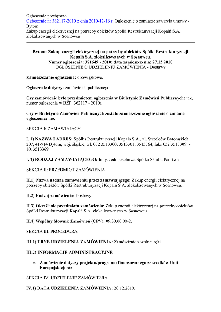 Ogłoszenie powiązane: Ogłoszenie nr 362117-2010 z dnia 2010-12-16 r. Ogłoszenie o zamiarze zawarcia umowy Bytom Zakup energii elektrycznej na potrzeby obiektów Spółki Restrukturyzacji Kopalń S.A. zlokalizowanych w Sosnowcu Bytom: Zakup energii elektrycznej na potrzeby obiektów Spółki Restrukturyzacji Kopalń S.A. zlokalizowanych w Sosnowcu. Numer ogłoszenia: 371649 - 2010; data zamieszczenia: 27.12.2010 OGŁOSZENIE O UDZIELENIU ZAMÓWIENIA - Dostawy Zamieszczanie ogłoszenia: obowiązkowe. Ogłoszenie dotyczy: zamówienia publicznego. Czy zamówienie było przedmiotem ogłoszenia w Biuletynie Zamówień Publicznych: tak, numer ogłoszenia w BZP: 362117 - 2010r. Czy w Biuletynie Zamówień Publicznych zostało zamieszczone ogłoszenie o zmianie ogłoszenia: nie. SEKCJA I: ZAMAWIAJĄCY I. 1) NAZWA I ADRES: Spółka Restrukturyzacji Kopalń S.A., ul. Strzelców Bytomskich 207, 41-914 Bytom, woj. śląskie, tel. 032 3513300, 3513301, 3513364, faks 032 3513309, 10, 3513369. I. 2) RODZAJ ZAMAWIAJĄCEGO: Inny: Jednoosobowa Spółka Skarbu Państwa. SEKCJA II: PRZEDMIOT ZAMÓWIENIA II.1) Nazwa nadana zamówieniu przez zamawiającego: Zakup energii elektrycznej na potrzeby obiektów Spółki Restrukturyzacji Kopalń S.A. zlokalizowanych w Sosnowcu.. II.2) Rodzaj zamówienia: Dostawy. II.3) Określenie przedmiotu zamówienia: Zakup energii elektrycznej na potrzeby obiektów Spółki Restrukturyzacji Kopalń S.A. zlokalizowanych w Sosnowcu.. II.4) Wspólny Słownik Zamówień (CPV): 09.30.00.00-2. SEKCJA III: PROCEDURA III.1) TRYB UDZIELENIA ZAMÓWIENIA: Zamówienie z wolnej ręki III.2) INFORMACJE ADMINISTRACYJNE • Zamówienie dotyczy projektu/programu finansowanego ze środków Unii Europejskiej: nie SEKCJA IV: UDZIELENIE ZAMÓWIENIA IV.1) DATA UDZIELENIA ZAMÓWIENIA: 20.12.2010. IV.2) LICZBA OTRZYMANYCH OFERT: 1. IV.3) LICZBA ODRZUCONYCH OFERT: . IV.4) NAZWA I ADRES WYKONAWCY, KTÓREMU UDZIELONO ZAMÓWIENIA: • PGE Obrót S.A, ul. 8-go Marca 6, 35-959 Rzeszów, kraj/woj. podkarpackie. IV.5) Szacunkowa wartość zamówienia (bez VAT): 142853,60 PLN. IV.6) INFORMACJA O CENIE WYBRANEJ OFERTY ORAZ O OFERTACH Z NAJNIŻSZĄ I NAJWYŻSZĄ CENĄ • • • Cena wybranej oferty: 161696,20 Oferta z najniższą ceną: 161696,20 / Oferta z najwyższą ceną: 161696,20 Waluta: PLN. ZAŁĄCZNIK I Uzasadnienie udzielenia zamówienia w trybie negocjacji bez ogłoszenia, zamówienia z wolnej ręki albo zapytania o cenę • 1. Podstawa prawna Postępowanie prowadzone jest w trybie zamówienie z wolnej ręki na podstawie art. 67 ust. 1 pkt 3 ustawy z dnia 29 stycznia 2004r. - Prawo zamówień publicznych. • 2. Uzasadnienia wyboru trybu Należy podać uzasadnienie faktyczne i prawne wyboru trybu oraz wyjaśnić, dlaczego udzielenie zamówienia jest zgodne z przepisami. SRK S.A. na podstawie Umowy sprzedaży energii elektrycznej nr WO14/49/13/2010 zarejestrowaną pod nr SRK/KWK/18/10 z dnia 29.03.2010 r. zakupuje energię elektryczną na potrzeby obiektów Spółki Restrukturyzacji Kopalń S.A. zlokalizowanych w Sosnowcu. Sprzedawcą energii jest PGE Obrót S.A. ul. 8-go Marca 6, 35-959 Rzeszów, Oddział z siedzibą w Warszawie, ul. Marsa 95, 04-470 Warszawa (zgodnie z Aneksem nr 1 do umowy zmiana oznaczenia podmiotu Wykonawcy). Zgodnie z przedmiotową umową energia elektryczna dostarczana jest do obiektów stacji transformatorowo-rozdzielczych 6kV zlokalizowanych w Sosnowcu przy ul. Gacka 1, z których zasilani są odbiorcy dzielnicy SosnowcaKlimontów. Jest to zgodne z posiadaną koncesją udzieloną przez Prezesa Urzędu Regulacji Energetyki na obrót i dystrybucję energią elektryczną nr OEE/567/1493/W/2/2009/BT i nr DEE/234/1493/W/2/2009/BT z dnia 8.12.2009r SRK S.A., zgodnie z którą Spółka Restrukturyzacji Kopalń S.A. w Bytomiu jako Przedsiębiorstwo Energetyczne jest zobowiązana do utrzymania ciągłości zasilania przedmiotowych odbiorców poprzez odsprzedaż energii elektrycznej Odbiorcom końcowym. W/w Umowa zawarta jest na czas określony, tj. do 31.12.2010r. i do tego czasu odbiorcy tej dzielnicy winni byli zostać przełączeni na sieć lokalnego Operatora Systemu Dystrybucyjnego. Niestety, z przyczyn niezależnych od SRK S.A. Zakładu KWK w całkowitej likwidacji, nastąpiło opóźnienie w procesie przełączania odbiorców energii elektrycznej zasilanych z sieci SRK S.A. Bezpośrednią i główną przyczyną powyższego jest opóźnienie w realizacji budowy nowej infrastruktury sieciowej w dzielnicy Sosnowiec-Klimontów przez ENION S.A.- zakończenie prac nastąpiło z półrocznym opóźnieniem, tj. na przełomie października i listopada br. wobec planowanego na czerwiec br. Szczegółowe przyczyny, które miały i będą miały wpływ na opóźnienie w procesie przełączania odbiorców zostały określone w piśmie z dnia 16.11.2010r. skierowanym do Zarządu SRK S.A. (załącznik nr 1). Ze względu na powyższe, wg posiadanych informacji do dnia 31 grudnia 2010r. nie zostanie przełączonych około 950 odbiorców energii elektrycznej (głównie odbiorców indywidualnych zlokalizowanych w wielolokalowych budynkach mieszkalnych). Po tym terminie, tj. od 1.01.2011r. istnieje realne zagrożenie pozbawienia możliwości zasilania tych odbiorców. O fakcie tym stosownym pismem z dnia 24.11.2010r. został poinformowany Dyrektor Naczelny ENION S.A. Oddział w Będzinie (załącznik nr 2). Wstrzymanie dostaw energii elektrycznej dla 950 odbiorców jest poważnym i niewyobrażalnym problemem społecznym. W związku z tym, w celu ochrony odbiorców indywidualnych, SRK S.A. jako właściciel sieci elektroenergetycznych, mając na uwadze ważny interes społeczny zmuszona jest zapewnić ciągłość zasilania odbiorcom w rejonie Sosnowiec-Klimontów do czasu ich przełączenia na sieć nowego OSD. W trakcie przeprowadzonych rozmów w dniu 13.12.2010r. z przedstawicielami URE w Warszawie, w/w jednoznacznie określili konieczność dalszej kontynuacji ciągłości zasilania nie prze