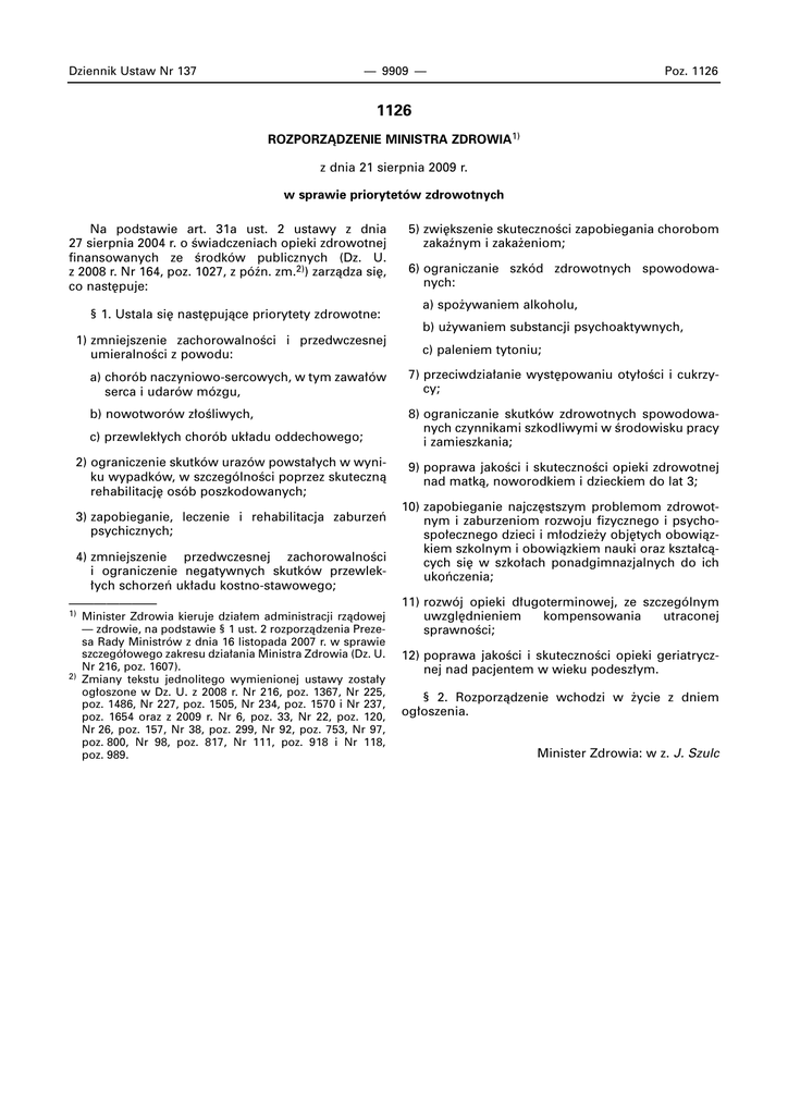 Dziennik Ustaw Nr 137 — 9909 — Poz. 1126 1126 ROZPORZÑDZENIE MINISTRA ZDROWIA1) z dnia 21 sierpnia 2009 r. w sprawie priorytetów zdrowotnych Na podstawie art. 31a ust. 2 ustawy z dnia 27 sierpnia 2004 r. o Êwiadczeniach opieki zdrowotnej finansowanych ze Êrodków publicznych (Dz. U. z 2008 r. Nr 164, poz. 1027, z póên. zm.2)) zarzàdza si´, co nast´puje: § 1. Ustala si´ nast´pujàce priorytety zdrowotne: 5) zwi´kszenie skutecznoÊci zapobiegania chorobom zakaênym i zaka˝eniom; 6) ograniczanie szkód zdrowotnych spowodowanych: a) spo˝ywaniem alkoholu, b) u˝ywaniem substancji psychoaktywnych, 1) zmniejszenie zachorowalnoÊci i przedwczesnej umieralnoÊci z powodu: a) chorób naczyniowo-sercowych, w tym zawa∏ów serca i udarów mózgu, 7) przeciwdzia∏anie wyst´powaniu oty∏oÊci i cukrzycy; b) nowotworów z∏oÊliwych, 8) ograniczanie skutków zdrowotnych spowodowanych czynnikami szkodliwymi w Êrodowisku pracy i zamieszkania; c) przewlek∏ych chorób uk∏adu oddechowego; 2) ograniczenie skutków urazów powsta∏ych w wyniku wypadków, w szczególnoÊci poprzez skutecznà rehabilitacj´ osób poszkodowanych; 3) zapobieganie, leczenie i rehabilitacja zaburzeƒ psychicznych; 4) zmniejszenie przedwczesnej zachorowalnoÊci i ograniczenie negatywnych skutków przewlek∏ych schorzeƒ uk∏adu kostno-stawowego; ——————— 1) 2) c) paleniem tytoniu; Minister Zdrowia kieruje dzia∏em administracji rzàdowej — zdrowie, na podstawie § 1 ust. 2 rozporzàdzenia Prezesa Rady Ministrów z dnia 16 listopada 2007 r. w sprawie szczegó∏owego zakresu dzia∏ania Ministra Zdrowia (Dz. U. Nr 216, poz. 1607). Zmiany tekstu jednolitego wymienionej ustawy zosta∏y og∏oszone w Dz. U. z 2008 r. Nr 216, poz. 1367, Nr 225, poz. 1486, Nr 227, poz. 1505, Nr 234, poz. 1570 i Nr 237, poz. 1654 oraz z 2009 r. Nr 6, poz. 33, Nr 22, poz. 120, Nr 26, poz. 157, Nr 38, poz. 299, Nr 92, poz. 753, Nr 97, poz. 800, Nr 98, poz. 817, Nr 111, poz. 918 i Nr 118, poz. 989. 9) poprawa jakoÊci i skutecznoÊci opieki zdrowotnej nad matkà, noworodkiem i dzieckiem do lat 3; 10) zapobieganie najcz´stszym problemom zdrowotnym i zaburzeniom rozwoju fizycznego i psychospo∏ecznego dzieci i m∏odzie˝y obj´tych obowiàzkiem szkolnym i obowiàzkiem nauki oraz kszta∏càcych si´ w szko∏ach ponadgimnazjalnych do ich ukoƒczenia; 11) rozwój opieki d∏ugoterminowej, ze szczególnym uwzgl´dnieniem kompensowania utraconej sprawnoÊci; 12) poprawa jakoÊci i skutecznoÊci opieki geriatrycznej nad pacjentem w wieku podesz∏ym. § 2. Rozporzàdzenie wchodzi w ˝ycie z dniem og∏oszenia. Minister Zdrowia: w z. J. Szulc