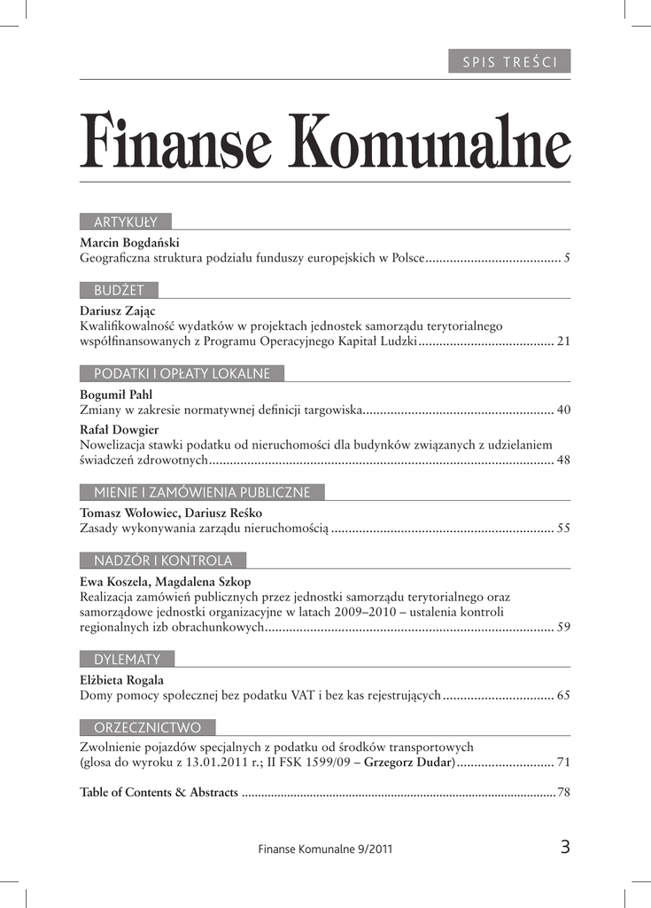SPIS TREŚCI ARTYKUŁY Marcin Bogdański Geograficzna struktura podziału funduszy europejskich w Polsce ....................................... 5 BUDŻET Dariusz Zając Kwalifikowalność wydatków w projektach jednostek samorządu terytorialnego współfinansowanych z Programu Operacyjnego Kapitał Ludzki ....................................... 21 PODATKI I OPŁATY LOKALNE Bogumił Pahl Zmiany w zakresie normatywnej definicji targowiska....................................................... 40 Rafał Dowgier Nowelizacja stawki podatku od nieruchomości dla budynków związanych z udzielaniem świadczeń zdrowotnych ................................................................................................... 48 MIENIE I ZAMÓWIENIA PUBLICZNE Tomasz Wołowiec, Dariusz Reśko Zasady wykonywania zarządu nieruchomością ................................................................ 55 NADZÓR I KONTROLA Ewa Koszela, Magdalena Szkop Realizacja zamówień publicznych przez jednostki samorządu terytorialnego oraz samorządowe jednostki organizacyjne w latach 2009–2010 – ustalenia kontroli regionalnych izb obrachunkowych ................................................................................... 59 DYLEMATY Elżbieta Rogala Domy pomocy społecznej bez podatku VAT i bez kas rejestrujących ................................ 65 ORZECZNICTWO Zwolnienie pojazdów specjalnych z podatku od środków transportowych (glosa do wyroku z 13.01.2011 r.; II FSK 1599/09 – Grzegorz Dudar) ............................ 71 Table of Contents & Abstracts .................................................................................................78 Finanse Komunalne 9/2011 3 SPIS TREŚCI WARUNKI PRZYJMOWANIA TEKSTÓW DO DRUKU Redakcja przyjmuje teksty oryginalne o objętości 10–40 tys. znaków, z wyraźnie zaznaczonym tytułem, podziałem na podrozdziały, podsumowaniem, przypisami, krótką notką o autorze oraz adresem e-mailowym. Materiały większe lub mniejsze albo już publikowane wymagają osobnej zgody redakcji. Tekst należy zaopatrzyć w abstrakt w języku polskim, o objętości nie większej niż 500 znaków. Autor może zaproponować tłumaczenie na język angielski tytułu tekstu oraz abstraktu. Przypisy powinny być opracowane w tradycyjny sposób – na dole strony. Materiały wraz z danymi autora (stanowisko, adres, numer telefonu) i ewentualnym listem polecającym prosimy przysyłać pocztą elektroniczną lub zwykłą, z załączoną płytą CD. Przekazując tekst do redakcji, autor przenosi na Wydawcę wyłączne prawo do jego publikacji. Autor ponosi odpowiedzialność za aktualny stan prawny, orzecznictwa i doktryny. Redakcja zastrzega sobie prawo skracania tekstów, zmiany tytułów, śródtytułów oraz poprawek merytorycznych i stylistycznych, również w wersji angielskiej. Materiałów niezamówionych nie zwracamy. Warunkiem publikacji artykułu jest odesłanie podpisanej umowy do Wydawnictwa. Redakcja 4 Finanse Komunalne 9/2011 TA B L E O F CO N T E N T S & A B S T R A C T S LOCAL AUTHORITY FINANCE Monthly Magazine of the Regional Chambers of Audit ARTICLES Marcin Bogdański Geographical structure of the distribution of European funds in Poland ...............................................5 One of the objectives of EU regional policy is economic cohesion, understood as the attempt to minimize the differences in the level of regional GDP per inhabitant (Latin: per capita). However, over the past dozen or so years, the differences in the level of economic development of the voivodships have increased, which suggests the incorrect choice of cohesion policy tools. European funds have mainly been reaching the most affluent regions, thereby strengthening their economic potential. The article presents the results of research into this phenomenon and attempts to answer the question about its causes. BUDGET Dariusz Zając Eligibility of expenditures in local authority projects co-financed with the Human Capital Operational Programme ............................................................................................. 21 The article presents issues related to the eligibility of expenditures in local authority projects co-financed with EU funds. The author establishes the meaning of the notion of eligibility and the principles of eligibility arising from the sources of law governing the functioning of EU funds in Poland. Next, using the example of the Human Capital Operational Programme (HCOP), he presents the most frequent irregularities in this area, which appear during monitoring visits, inspections or audits of the current EU financial framework. De lege ferenda conclusions, which could remedy these problems, are formulated on the basis of the analysis conducted. LOCAL TAXES AND CHARGES Bogumił Pahl Changes in the normative definition of the marketplace ....................................................................... 40 The language of the provisions of the law must be sufficiently communicative for both the duties and rights to be unequivocally understood from the wording of the tax regulations. The failure to satisfy this condition can result in a breach of the provisions of the constitution. A prime example of this is that of the provisions governing the notion of marketplace for the purposes of collecting a marketplace fee. The Constitutional Court found some of them, and more precisely Article 15 (2a) of the Act on local taxes and charges, inconsistent with the constitution. As a result, a new definition of marketplace entered into force on 19 June 2011, to which the author has devoted this article. Rafał Dowgier Amendment to the rate of property tax on buildings related to the provision of healthcare services ..... 48 Municipal councils have the powers, within the limits set by law, to set, among others, the rates of local taxes and charges. Certainty of the law requires that their level remains unmodified during the year. However, in certa
