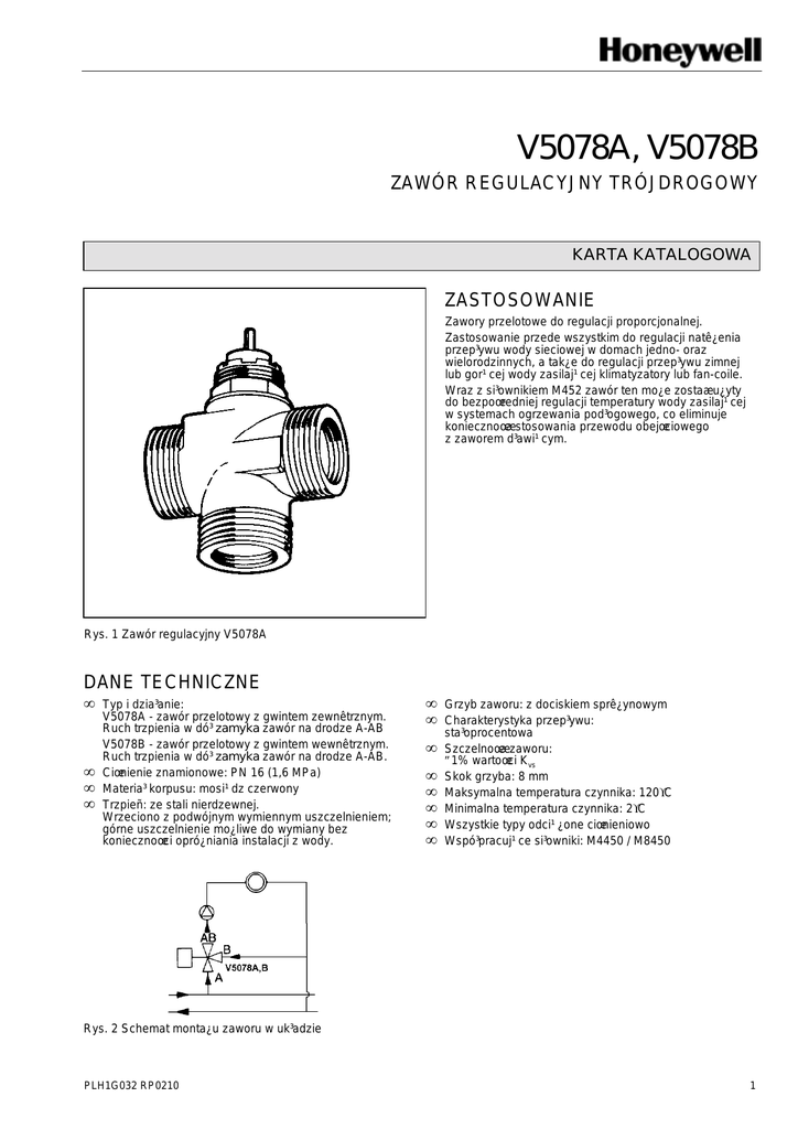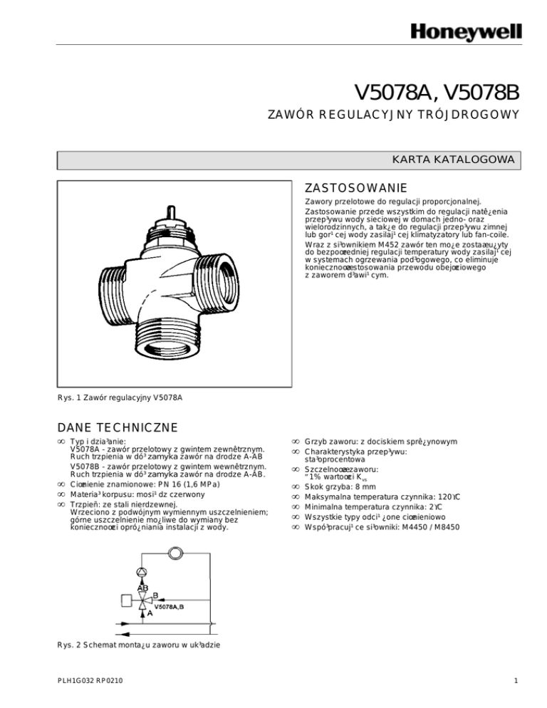 V5078A, V5078B ZAWÓR REGULACYJNY TRÓJDROGOWY KARTA KATALOGOWA ZASTOSOWANIE Zawory przelotowe do regulacji proporcjonalnej. Zastosowanie przede wszystkim do regulacji natê¿enia przep³ywu wody sieciowej w domach jedno- oraz wielorodzinnych, a tak¿e do regulacji przep³ywu zimnej lub gor¹cej wody zasilaj¹cej klimatyzatory lub fan-coile. Wraz z si³ownikiem M452 zawór ten mo¿e zostaæ u¿yty do bezpoœredniej regulacji temperatury wody zasilaj¹cej w systemach ogrzewania pod³ogowego, co eliminuje koniecznoœæ stosowania przewodu obejœciowego z zaworem d³awi¹cym. Rys. 1 Zawór regulacyjny V5078A DANE TECHNICZNE • • • • Typ i dzia³anie: V5078A - zawór przelotowy z gwintem zewnêtrznym. Ruch trzpienia w dó³ zamyka zawór na drodze A-AB V5078B - zawór przelotowy z gwintem wewnêtrznym. Ruch trzpienia w dó³ zamyka zawór na drodze A-AB. Ciœnienie znamionowe: PN 16 (1,6 MPa) Materia³ korpusu: mosi¹dz czerwony Trzpieñ: ze stali nierdzewnej. Wrzeciono z podwójnym wymiennym uszczelnieniem; górne uszczelnienie mo¿liwe do wymiany bez koniecznoœci opró¿niania instalacji z wody. • • • • • • • • Grzyb zaworu: z dociskiem sprê¿ynowym Charakterystyka przep³ywu: sta³oprocentowa Szczelnoœæ zaworu: ≤1% wartoœci Kvs Skok grzyba: 8 mm Maksymalna temperatura czynnika: 120°C Minimalna temperatura czynnika: 2°C Wszystkie typy odci¹¿one ciœnieniowo Wspó³pracuj¹ce si³owniki: M4450 / M8450 Rys. 2 Schemat monta¿u zaworu w uk³adzie PLH1G032 RP0210 1 Typ DN [mm] Kvs [m3/h] ∆p* [MPa] 15 2,5 1,0 V5078A (gwint zewnêtrzny) V 5078 A 1007 V5078B (gwint wewnêtrzny) V 5078 A 1005 20 3,3 1,0 V 5078 A 1015 V 5078 A 1013 25 5,0 1,0 V 5078 A 1023 V 5078 A 1021 32 5,0 1,0 V 5078 A 1031 V 5078 A 1039 40 11,0 1,0 V 5078 A 1049 V 5078 A 1047 50 13,0 1,0 V 5078 A 1056 V 5078 A 1054 ∆p* - maksymalna dopuszczalna ró¿nica ciœnieñ na zaworze (bar) przy wspó³pracy z si³ownikiem M 4450 Tab. 1 Wspó³czynnik przep³ywu, maksymalna dopuszczalna ró¿nica ciœnieñ WYMIARY (w mm) DN Typ V5078A V5078B Wymiary [mm] LA LB Hmax hA hB Kvs 2 15 20 25 32 40 50 V 5078 A 1007 V 5078 A 1007 V 5078 A 1015 V 5078 A 1013 V 5078 A 1023 V 5078 A 1021 V 5078 A 1031 V 5078 A 1039 V 5078 A 1049 V 5078 A 1047 V 5078 A 1056 V 5078 A 1054 70 80 88 30 40 72 80 88 36 40 80 90 88 40 45 88 100 88 49 50 115 130 100 58 65 140 150 100 70 75 2,5 3,3 5 5 11 13 Masa [kg] 0,50 0,55 0,75 0,95 1,5 2,4 R 3/4" 1' 1 1/4" 1 1/2" 2" 2 1/2" R1 1/2" 3/4" 1" 1 1/4" 1 1/2" 2" PLH1G032 RP0210 WYPOSA¯ENIE DODATKOWE Komplet z³¹czek gwintowanych zawieraj¹cy 3 tulejki, 3 nakrêtki nasadowe, 3 pierœcienie uszczelniaj¹ce. Wykonanie R Kod zamówienia Wykonanie ∅ Kod zamówienia Tuleja gwintowana 1/2" 3/4" 1" 1 1/4" 1 1/2" 2" 4200 4614-001 4200 4615-001 4200 4616-001 4200 4617-001 4200 4618-001 4200 4619-001 Tuleja do lutowania 15 22 28 35 42 54 4200 4620-001 4200 4621-001 4200 4622-001 4200-4623-001 4200-4624-001 4200 4625-001 WYKRESY DO OBLICZANIA WARTOŒCI Kvs DLA WODY Wyznaczanie nastawy wstêpnej zaworu dla obejœcia Znale¿æ punkt przeciêcia charakterystyki ¿¹danej temperatury wody grzewczej doprowadzanej tVH i tK / tRH. Znaleziony punkt przeciêcia przenieœæ po lini poziomej na krzyw¹ nastaw wstêspnych. Odczytaæ po³o¿enie œruby nastawczej na osi odciêtych. PLH1G032 RP0210 3 Pozycja 0 - ca³kowite otwarcie zaworu Przyk³ad 1: temperatura wody (grzewczej) doprowadzonej tVH = 40°C temperatura wody w kotle tK = 50°C temperatura wody (grzewczej) powracaj¹cej tRH = 30°C Wielkoœæ obliczona: nastawa wstêpna punktu A odpowiadaj¹ca w przybli¿eniu 1,4 obrotu œruby nastawczej (od po³o¿enia 0) Przyk³ad 2: temperatura wody (grzewczej) doprowadzonej tVH = 50°C temperatura wody w kotle tK = 110°C temperatura wody (grzewczej) powracaj¹cej tRH = 40°C Wielkoœæ obliczona: nastawa wstêpna punktu B odpowiadaj¹ca w przybli¿eniu 1,4 - po³o¿enie 0. Uwaga: Wykres odnosi siê do spadku ciœnienia w zaworze wynosz¹cego ∆pVA≥4pK Honeywell Sp. z o. o. ul. Domaniewska 41 ( Budynek MARS ) 02-672 WARSZAWA Komfort i oszczêdnoœæ (48)(22) 606 09 00; Fax (48)(22) 606 09 01 4 PLH1G032 RP0210