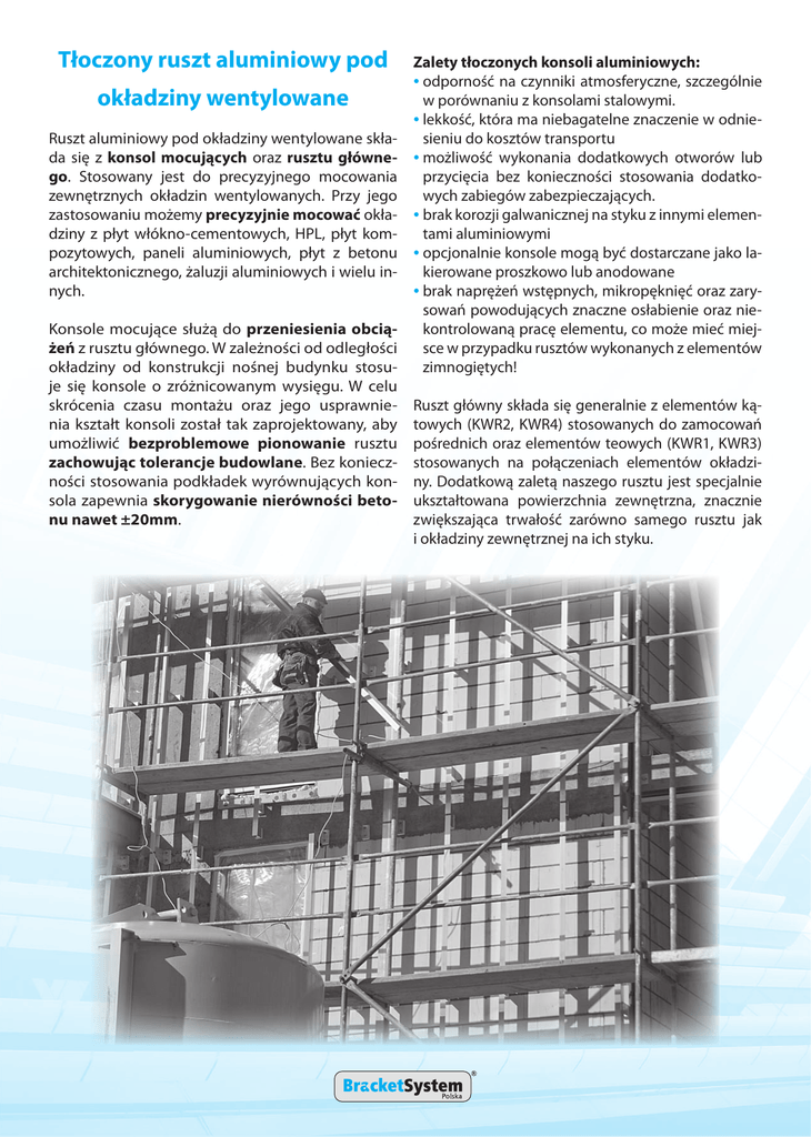 Tłoczony ruszt aluminiowy pod okładziny wentylowane Ruszt aluminiowy pod okładziny wentylowane składa się z konsol mocujących oraz rusztu głównego. Stosowany jest do precyzyjnego mocowania zewnętrznych okładzin wentylowanych. Przy jego zastosowaniu możemy precyzyjnie mocować okładziny z płyt włókno-cementowych, HPL, płyt kompozytowych, paneli aluminiowych, płyt z betonu architektonicznego, żaluzji aluminiowych i wielu innych. Konsole mocujące służą do przeniesienia obciążeń z rusztu głównego. W zależności od odległości okładziny od konstrukcji nośnej budynku stosuje się konsole o zróżnicowanym wysięgu. W celu skrócenia czasu montażu oraz jego usprawnienia kształt konsoli został tak zaprojektowany, aby umożliwić bezproblemowe pionowanie rusztu zachowując tolerancje budowlane. Bez konieczności stosowania podkładek wyrównujących konsola zapewnia skorygowanie nierówności betonu nawet ±20mm. Zalety tłoczonych konsoli aluminiowych: • odporność na czynniki atmosferyczne, szczególnie w porównaniu z konsolami stalowymi. • lekkość, która ma niebagatelne znaczenie w odniesieniu do kosztów transportu • możliwość wykonania dodatkowych otworów lub przycięcia bez konieczności stosowania dodatkowych zabiegów zabezpieczających. • brak korozji galwanicznej na styku z innymi elementami aluminiowymi • opcjonalnie konsole mogą być dostarczane jako lakierowane proszkowo lub anodowane • brak naprężeń wstępnych, mikropęknięć oraz zarysowań powodujących znaczne osłabienie oraz niekontrolowaną pracę elementu, co może mieć miejsce w przypadku rusztów wykonanych z elementów zimnogiętych! Ruszt główny składa się generalnie z elementów kątowych (KWR2, KWR4) stosowanych do zamocowań pośrednich oraz elementów teowych (KWR1, KWR3) stosowanych na połączeniach elementów okładziny. Dodatkową zaletą naszego rusztu jest specjalnie ukształtowana powierzchnia zewnętrzna, znacznie zwiększająca trwałość zarówno samego rusztu jak i okładziny zewnętrznej na ich styku. $ %