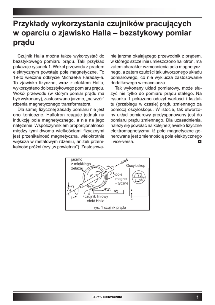 Przykłady wykorzystania czujników pracujących w oparciu o zjawisko Halla – bezstykowy pomiar prądu Czujnik Halla można także wykorzystać do bezstykowego pomiaru prądu. Taki przykład pokazuje rysunek 1. Wokół przewodu z prądem elektrycznym powstaje pole magnetyczne. To 19-to wieczne odkrycie Michael-a Faraday-a. To zjawisko fizyczne, wraz z efektem Halla, wykorzystano do bezstykowego pomiaru prądu. Wokół przewodu (w którym pomiar prądu ma być wykonany), zastosowano jarzmo, „na wzór” rdzenia magnetycznego transformatora. Dla samej fizycznej zasady pomiaru nie jest ono konieczne. Hallotron reaguje jednak na indukcję pola magnetycznego, a nie na jego natężenie. Współczynnikiem proporcjonalności między tymi dwoma wielkościami fizycznymi jest przenikalność magnetyczna, wielokrotnie większa w metalowym rdzeniu, aniżeli przenikalność próżni (czy „w powietrzu”). Zastosowa- nie jarzma okalającego przewodnik z prądem, w którego szczelinie umieszczono hallotron, ma zatem charakter wzmocnienia pola magnetycznego, a zatem czułości tak utworzonego układu pomiarowego, co nie wyklucza zastosowanie dodatkowego wzmacniacza. Tak wykonany układ pomiarowy, może służyć nie tylko do pomiaru prądu stałego. Na rysunku 1 pokazano odczyt wartości i kształtu (przebiegu w czasie) prądu zmiennego za pomocą oscyloskopu. W istocie, tak utworzony układ pomiarowy predysponowany jest do pomiaru prądu zmiennego. Dla uzasadnienia, należy się powołać na kolejne zjawisko fizyczne elektromagnetyzmu, iż pole magnetyczne generowane jest zmiennością pola elektrycznego i vice-versa. jarzmo z miękkiego żelaza d prą Oscyloskop pole magne - tyczne A 1 t t A VCC VO czujnik liniowy - efekt Halla rys. 1 czujnik prądu SERWIS ELEKTRONIKI 1