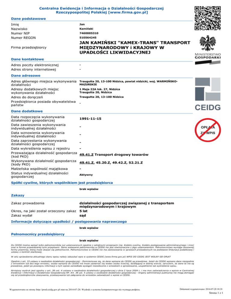 Centralna Ewidencja i Informacja o Działalności Gospodarczej Rzeczypospolitej Polskiej [www.firma.gov.pl] Dane podstawowe Imię Nazwisko Numer NIP Numer REGON Firma przedsiębiorcy Jan Kamiński 7460005310 510564245 JAN KAMIŃSKI "KAMEXTRANS" TRANSPORT MIĘDZYNARODOWY i KRAJOWY W UPADŁOŚCI LIKWIDACYJNEJ Dane kontaktowe Adres poczty elektronicznej Adres strony internetowej Dane adresowe Adres głównego miejsca wykonywania działalności Adresy dodatkowych miejsc wykonywania działalności Adres do doręczeń Przedsiębiorca posiada obywatelstwa państw Traugutta 20, 13100 Nidzica, powiat nidzicki, woj. WARMIŃSKO MAZURSKIE 1 Maja 22A lok. 27, Nidzica Traugutta 20, Nidzica Traugutta 20, 13100 Nidzica Dane dodatkowe Data rozpoczęcia wykonywania działalności gospodarczej Data zawieszenia wykonywania indywidualnej działalności Data wznowienia wykonywania indywidualnej działalności Data zaprzestania wykonywania działalności gospodarczej Data wykreślenia wpisu z rejestru Przeważająca działalność gospodarcza (kod PKD) Wykonywana działalność gospodarcza (kody PKD) Małżeńska wspólność majątkowa Status indywidualnej działalności gospodarczej 19911115 49.41.Z Transport drogowy towarów 49.41.Z, 45.20.Z, 49.42.Z, 52.21.Z Aktywny Spółki cywilne, których wspólnikiem jest przedsiębiorca brak wpisów Zakazy Zakaz prowadzenia działalności gospodarczej związanej z transportem międzynarodowym i krajowym Okres, na jaki został orzeczony zakaz 5 lat Zakaz wydał sąd Informacje dotyczące upadłości / postępowania naprawczego brak wpisów Pełnomocnicy przedsiębiorcy brak wpisów Do CEIDG można wpisać tylko pełnomocników już ustanowionych zgodnie z odrębnymi przepisami (np. Kodeks cywilny, Kodeks postępowania administracyjnego i inne) oraz w formie przewidzianej tymi przepisami. Samo wskazanie pełnomocnika w CEIDG nie jest równoznaczne z jego ustanowieniem. Pełnomocnictwo wymaga stosownej formy pisemnej, którą może okazać się pełnomocnik. Pełnomocnictwo w CEIDG nie ma zastosowania w sprawach prowadzonych na podstawie Ordynacji podatkowej i ustawy o kontroli skarbowej. W celu sprawdzenia aktualnego stanu wpisu należy odszukać wpis w systemie CEIDG (www.firma.gov.pl) WPIS DO CEIDG JEST WOLNY OD OPŁAT Zgodnie z art. 33 ustawy o swobodzie działalności gospodarczej Domniemywa się, że dane wpisane do CEIDG są prawdziwe. Jeżeli do CEIDG wpisano dane niezgodnie z wnioskiem lub bez tego wniosku, osoba wpisana do CEIDG nie może zasłaniać się wobec osoby trzeciej, działającej w dobrej wierze, zarzutem, że dane te nie są prawdziwe, jeżeli po powzięciu informacji o tym wpisie zaniedbała wystąpić niezwłocznie z wnioskiem o sprostowanie, uzupełnienie lub wykreślenie wpisu. Niniejszy wydruk jest zgodny z art. 38 ust. 4 ustawy o swobodzie działalności gospodarczej z dnia 2 lipca 2004 r. i ma moc zaświadczenia o wpisie w Centralnej Ewidencji i Informacji o Działalności Gospodarczej RP. Art. 38 ust. 5 ustawy o swobodzie działalności gospodarczej Organy administracji publicznej nie mogą domagać się od przedsiębiorców okazywania, przekazywania lub załączania do wniosków zaświadczeń o wpisie w CEIDG. Wygenerowano ze strony http://prod.ceidg.gov.pl stan na 20140728. Wydruk z systemu komputerowego nie wymaga podpisu. Dokument wygenerowano: 20140728 10:18 Strona 1 z 1