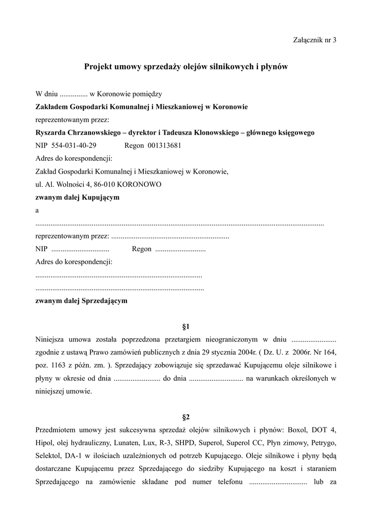 Załącznik nr 3 Projekt umowy sprzedaży olejów silnikowych i płynów W dniu ............... w Koronowie pomiędzy Zakładem Gospodarki Komunalnej i Mieszkaniowej w Koronowie reprezentowanym przez: Ryszarda Chrzanowskiego – dyrektor i Tadeusza Klonowskiego – głównego księgowego NIP 554-031-40-29 Regon 001313681 Adres do korespondencji: Zakład Gospodarki Komunalnej i Mieszkaniowej w Koronowie, ul. Al. Wolności 4, 86-010 KORONOWO zwanym dalej Kupującym a .......................................................................................................................................................... reprezentowanym przez: ............................................................... NIP ............................... Regon ........................... Adres do korespondencji: ......................................................................................... .......................................................................................... zwanym dalej Sprzedającym §1 Niniejsza umowa została poprzedzona przetargiem nieograniczonym w dniu ........................ zgodnie z ustawą Prawo zamówień publicznych z dnia 29 stycznia 2004r. ( Dz. U. z 2006r. Nr 164, poz. 1163 z późn. zm. ). Sprzedający zobowiązuje się sprzedawać Kupującemu oleje silnikowe i płyny w okresie od dnia ......................... do dnia ............................. na warunkach określonych w niniejszej umowie. §2 Przedmiotem umowy jest sukcesywna sprzedaż olejów silnikowych i płynów: Boxol, DOT 4, Hipol, olej hydrauliczny, Lunaten, Lux, R-3, SHPD, Superol, Superol CC, Płyn zimowy, Petrygo, Selektol, DA-1 w ilościach uzależnionych od potrzeb Kupującego. Oleje silnikowe i płyny będą dostarczane Kupującemu przez Sprzedającego do siedziby Kupującego na koszt i staraniem Sprzedającego na zamówienie składane pod numer telefonu ............................... lub za pośrednictwem fax .................................. z co najmniej 2 dniowym wyprzedzeniem. W przypadku zmiany numerów telefonów Sprzedający zawiadomi o tym fakcie Kupującego. Osoby upoważnione do składania zamówień: Karol Latos, Kazimierz Jewuła. §3 1. Zgodnie z formularzem ofertowym ceny sprzedaży olejów i płynów zaakceptowane przez strony wynoszą: Stała marża stosowana wobec Kupującego wynosi .................................. a) Boxol 26 opakowanie 5 l - ................................. b) DOT 4 opakowanie 0,5 l - ................................. c) Hipol GL 4 80W 90 200 l - ................................. d) olej hydrauliczny 46 200 l - ................................. e) Lunaten 200 l - ................................. f) Lux 10 200 l - ................................. g) R-3 0,5 ll - ................................. h) SHPD 15W40 200 l - ................................. i) Superol CB 30 200 l - ................................. j) Superol CC 30 50 l - ................................. k) Płyn zimowy 5 l do spryskiwaczy - ................................. l) Petrygo 200 l - ................................. m) Selektol 20 l - ................................. n) DA – 1 0,5 l - ................................. Powyższe ceny zawierają podatek od towarów i usług. 2. Kupujący dopuszcza zmianę cen olejów i płynów w trakcie realizacji zamówienia jedynie w przypadku zmiany ceny przez producenta o zmieniony wskaźnik wzrostu lub obniżki ceny. Sprzedający powiadomi Kupującego o zmianie cen w ciągu 3 dni roboczych od jej dokonania. W przypadku pisemnej odmowy zaakceptowania przez Kupującego zmienionych cen w terminie 3 dni roboczych od dnia zawiadomienia, umowa ulega rozwiązaniu z końcem miesiąca, w którym Sprzedający zawiadomił o zmianie ceny. Sprzedający przedstawi Kupującemu dowody świadczące o zasadności zmiany ceny. §4 1. Podstawę regulowania należności za zakupione towary stanowić będą faktury VAT wystawiane przez Sprzedającego przy każdej dostawie. 2. Zapłata ceny następować będzie przelewem na konto Sprzedającego, w terminie 14 dni od daty dostarczenia faktury Kupującemu. §5 W przypadku niedokonania dostawy olejów i płynów zgodnie z zamówieniem, Kupujący zakupi oleje i płyny u innego dostawcy na ryzyko Sprzedawcy, a różnica ceny, w przypadku wyższej niż określona w umowie obciąży Sprzedawcę. §6 Strony oświadczają, że są podatnikami podatku od towarów i usług VAT. §7 1. W sprawach nie uregulowanych niniejszą umową zastosowanie mają odpowiednie przepisy Kodeksu cywilnego. 2. Rozwiązanie umowy może nastąpić tylko z ważnych powodów z zachowaniem 1 – miesięcznego okresu wypowiedzenia. 3. Wszelkie ewentualne spory między Kupującym i Sprzedającym rozstrzygane będą w pierwszej kolejności polubownie. 4. W przypadku braku porozumienia, spory rozstrzygać będzie Sąd Rejonowy z siedzibą w Bydgoszczy. §8 1. Wszelkie zmiany niniejszej umowy wymagają zachowania formy pisemnej, pod rygorem nieważności. 2. Umowę sporządzono w 2 jednobrzmiących egzemplarzach, po jednym egzemplarzu dla każdej ze stron. Sprzedający Kupujący