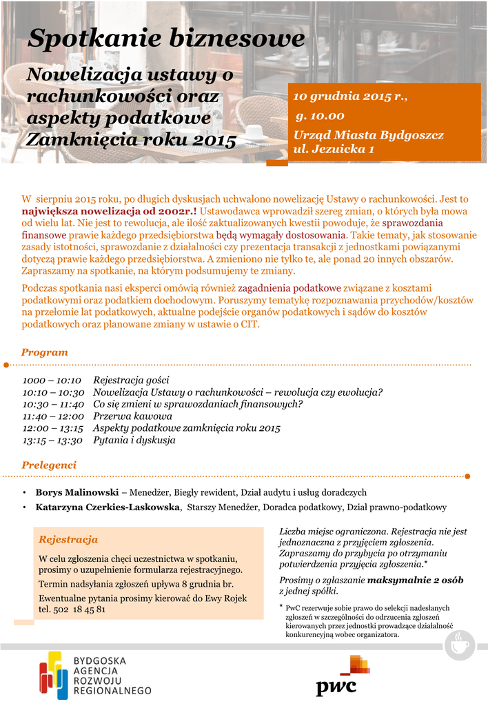 Spotkanie biznesowe Nowelizacja ustawy o rachunkowości oraz aspekty podatkowe Zamknięcia roku 2015 10 grudnia 2015 r., g. 10.00 Urząd Miasta Bydgoszcz ul. Jezuicka 1 W sierpniu 2015 roku, po długich dyskusjach uchwalono nowelizację Ustawy o rachunkowości. Jest to największa nowelizacja od 2002r.! Ustawodawca wprowadził szereg zmian, o których była mowa od wielu lat. Nie jest to rewolucja, ale ilość zaktualizowanych kwestii powoduje, że sprawozdania finansowe prawie każdego przedsiębiorstwa będą wymagały dostosowania. Takie tematy, jak stosowanie zasady istotności, sprawozdanie z działalności czy prezentacja transakcji z jednostkami powiązanymi dotyczą prawie każdego przedsiębiorstwa. A zmieniono nie tylko te, ale ponad 20 innych obszarów. Zapraszamy na spotkanie, na którym podsumujemy te zmiany. Podczas spotkania nasi eksperci omówią również zagadnienia podatkowe związane z kosztami podatkowymi oraz podatkiem dochodowym. Poruszymy tematykę rozpoznawania przychodów/kosztów na przełomie lat podatkowych, aktualne podejście organów podatkowych i sądów do kosztów podatkowych oraz planowane zmiany w ustawie o CIT. Program 1000 – 10:10 10:10 – 10:30 10:30 – 11:40 11:40 – 12:00 12:00 – 13:15 13:15 – 13:30 Rejestracja gości Nowelizacja Ustawy o rachunkowości – rewolucja czy ewolucja? Co się zmieni w sprawozdaniach finansowych? Przerwa kawowa Aspekty podatkowe zamknięcia roku 2015 Pytania i dyskusja Prelegenci • Borys Malinowski – Menedżer, Biegły rewident, Dział audytu i usług doradczych • Katarzyna Czerkies-Laskowska, Starszy Menedżer, Doradca podatkowy, Dział prawno-podatkowy Rejestracja W celu zgłoszenia chęci uczestnictwa w spotkaniu, prosimy o uzupełnienie formularza rejestracyjnego. Termin nadsyłania zgłoszeń upływa 8 grudnia br. Ewentualne pytania prosimy kierować do Ewy Rojek tel. 502 18 45 81 Liczba miejsc ograniczona. Rejestracja nie jest jednoznaczna z przyjęciem zgłoszenia. Zapraszamy do przybycia po otrzymaniu potwierdzenia przyjęcia zgłoszenia.* Prosimy o zgłaszanie maksymalnie 2 osób z jednej spółki. * PwC rezerwuje sobie prawo do selekcji nadesłanych zgłoszeń w szczególności do odrzucenia zgłoszeń kierowanych przez jednostki prowadzące działalność konkurencyjną wobec organizatora.
