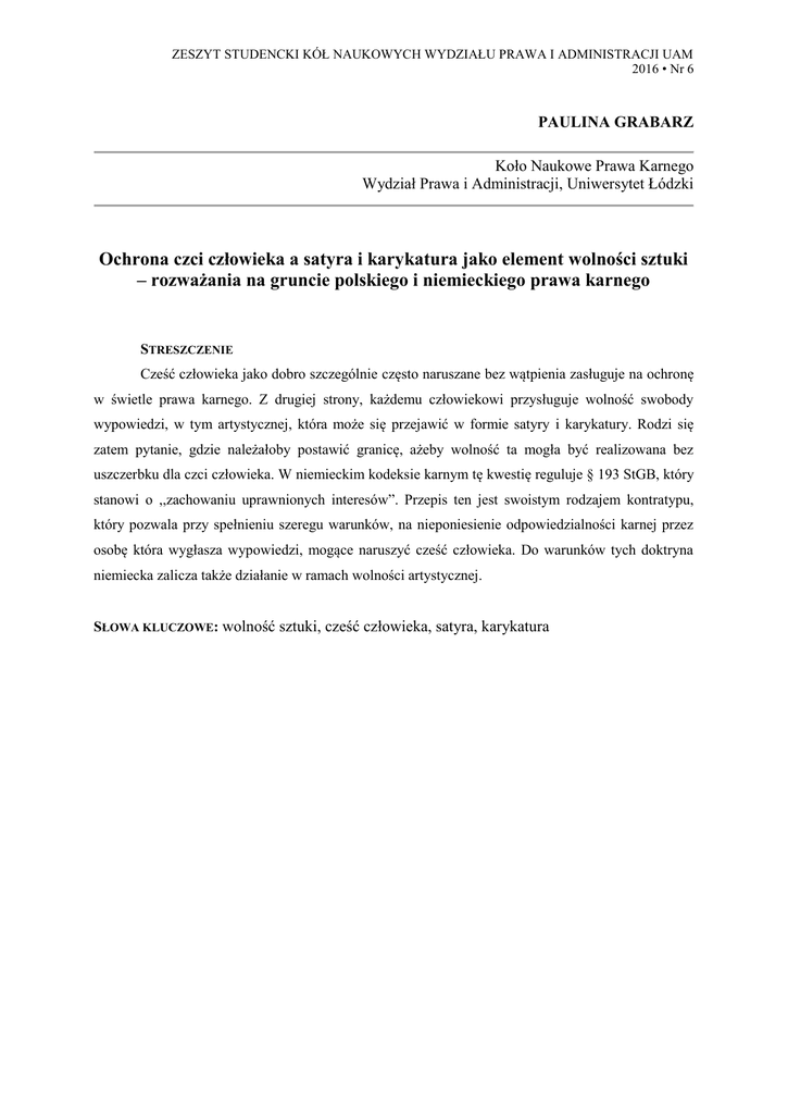 ZESZYT STUDENCKI KÓŁ NAUKOWYCH WYDZIAŁU PRAWA I ADMINISTRACJI UAM 2016 • Nr 6 PAULINA GRABARZ Koło Naukowe Prawa Karnego Wydział Prawa i Administracji, Uniwersytet Łódzki Ochrona czci człowieka a satyra i karykatura jako element wolności sztuki – rozważania na gruncie polskiego i niemieckiego prawa karnego STRESZCZENIE Cześć człowieka jako dobro szczególnie często naruszane bez wątpienia zasługuje na ochronę w świetle prawa karnego. Z drugiej strony, każdemu człowiekowi przysługuje wolność swobody wypowiedzi, w tym artystycznej, która może się przejawić w formie satyry i karykatury. Rodzi się zatem pytanie, gdzie należałoby postawić granicę, ażeby wolność ta mogła być realizowana bez uszczerbku dla czci człowieka. W niemieckim kodeksie karnym tę kwestię reguluje § 193 StGB, który stanowi o ,,zachowaniu uprawnionych interesów”. Przepis ten jest swoistym rodzajem kontratypu, który pozwala przy spełnieniu szeregu warunków, na nieponiesienie odpowiedzialności karnej przez osobę która wygłasza wypowiedzi, mogące naruszyć cześć człowieka. Do warunków tych doktryna niemiecka zalicza także działanie w ramach wolności artystycznej. SŁOWA KLUCZOWE: wolność sztuki, cześć człowieka, satyra, karykatura