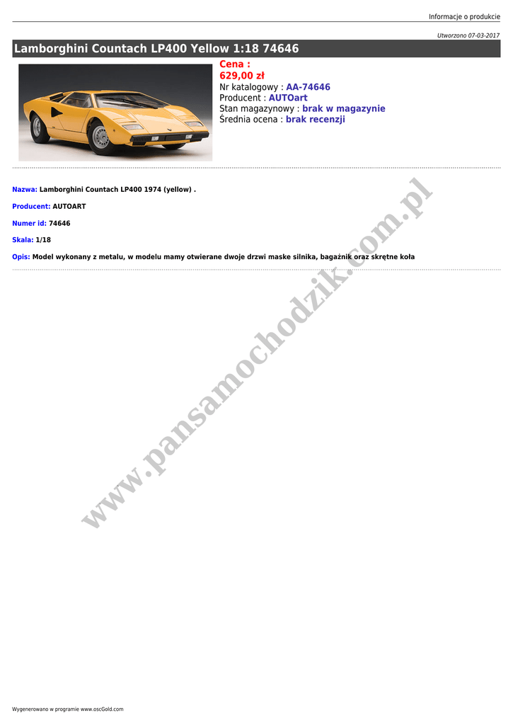 Informacje o produkcie Utworzono 07-03-2017 Lamborghini Countach LP400 Yellow 1:18 74646 Cena : 629,00 zł Nr katalogowy : AA-74646 Producent : AUTOart Stan magazynowy : brak w magazynie Średnia ocena : brak recenzji .p l Nazwa: Lamborghini Countach LP400 1974 (yellow) . Producent: AUTOART om Numer id: 74646 Skala: 1/18 w w w .p an sa m oc ho dz ik .c Opis: Model wykonany z metalu, w modelu mamy otwierane dwoje drzwi maske silnika, bagażnik oraz skrętne koła Wygenerowano w programie www.oscGold.com
