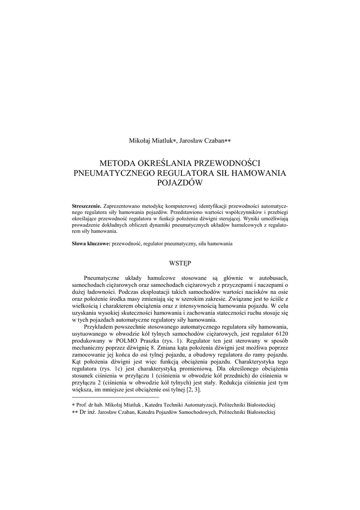 Mikołaj Miatluk∗, Jarosław Czaban∗∗ METODA OKREŚLANIA PRZEWODNOŚCI PNEUMATYCZNEGO REGULATORA SIŁ HAMOWANIA POJAZDÓW Streszczenie. Zaprezentowano metodykę komputerowej identyfikacji przewodności automatycznego regulatora siły hamowania pojazdów. Przedstawiono wartości współczynników i przebiegi określające przewodność regulatora w funkcji połoŜenia dźwigni sterującej. Wyniki umoŜliwiają prowadzenie dokładnych obliczeń dynamiki pneumatycznych układów hamulcowych z regulatorem siły hamowania. Słowa kluczowe: przewodność, regulator pneumatyczny, siła hamowania WSTĘP Pneumatyczne układy hamulcowe stosowane są głównie w autobusach, samochodach cięŜarowych oraz samochodach cięŜarowych z przyczepami i naczepami o duŜej ładowności. Podczas eksploatacji takich samochodów wartości nacisków na osie oraz połoŜenie środka masy zmieniają się w szerokim zakresie. Związane jest to ściśle z wielkością i charakterem obciąŜenia oraz z intensywnością hamowania pojazdu. W celu uzyskania wysokiej skuteczności hamowania i zachowania stateczności ruchu stosuje się w tych pojazdach automatyczne regulatory siły hamowania. Przykładem powszechnie stosowanego automatycznego regulatora siły hamowania, usytuowanego w obwodzie kół tylnych samochodów cięŜarowych, jest regulator 6120 produkowany w POLMO Praszka (rys. 1). Regulator ten jest sterowany w sposób mechaniczny poprzez dźwignię 8. Zmiana kąta połoŜenia dźwigni jest moŜliwa poprzez zamocowanie jej końca do osi tylnej pojazdu, a obudowy regulatora do ramy pojazdu. Kąt połoŜenia dźwigni jest więc funkcją obciąŜenia pojazdu. Charakterystyka tego regulatora (rys. 1c) jest charakterystyką promieniową. Dla określonego obciąŜenia stosunek ciśnienia w przyłączu 1 (ciśnienia w obwodzie kół przednich) do ciśnienia w przyłączu 2 (ciśnienia w obwodzie kół tylnych) jest stały. Redukcja ciśnienia jest tym większa, im mniejsze jest obciąŜenie osi tylnej [2, 3]. ∗ Prof. dr hab. Mikołaj Miatluk , Katedra Techniki Automatyzacji, Politechniki Białostockiej ∗∗ Dr inŜ. Jarosław Czaban, Katedra Pojazdów Samochodowych, Politechniki Białostockiej METODA OKREŚLANIA PRZEWODNOŚCI PNEUMATYCZNEGO REGULATORA... 155 Zastosowanie automatycznego regulatora sił hamowania w obwodzie tylnym układu hamulcowego wpływa na właściwości dynamiczne tego obwodu. Tak więc znajomość przewodności pneumatycznej takiego regulatora i jego charakterystyki przepływowej jest niezbędna do analizy i syntezy pneumatycznych układów hamulcowych. Celem pracy jest doświadczalne określenie przewodności pneumatycznej automatycznego regulatora siły hamowania. b) 1 a) 2 c) a) b) c) a) b) c) Rys.1. Automatyczny regulator siły hamowania: [3]: Budowa : 1 – zawór; 2 – spręŜyna; 3 – przelot; 4 – popychacz; 5 –tłok; 6 – membrana; 7 – Ŝebra tłoka 5; 8 – dźwignia; 9 – tłok; 10 – sworzeń kulowy; 11 – rurka; 12 – wkładka z Ŝebrami wewnętrznymi Ugięcie zawieszenia dla: 1- pojazdu nieobciąŜonego; 2 – pojazdu obciąŜonego Charakterystyka regulatora dla róŜnych kątów połoŜenia dźwigni: p1 – ciśnienie w przyłączu wejściowym; p2 – ciśnienie w przyłączu wyjściowym. Fig. 1. Automatic regulator of braking force [3]: construction: 1 – valve; 2 – spring; 3 – flow; 4 – lifter; 5 – piston; 6 – membrane; 7 – piston ribs 5; 8 – lever; 9 – piston; 10 – pivot; 11 – tube; 12 – liner with inner ribs suspension bend for: 1- unloaded vehicle; 2 – loaded vehicle Characteristics of the regulator for different lever angels: p1 – input connection pressure; p2 – output connection pressure METODYKA BADAŃ Elementy stosowane w układach hamulcowych takie jak: zawory, regulatory, filtry, złączki charakteryzują się swoją objętością wewnętrzną oraz przewodnością. Mikołaj Miatluk, Jarosław Czaban 156 Przewodność ta moŜe być wartością stałą lub zmienną. W przypadku przedstawionego regulatora przewodność jest zmienna ze względu na wzajemne przemieszczanie się elementów ruchomych regulatora w trakcie jego pracy, a tym samym zmianę przelotu (3, rys. 1a). Wielkość tego przelotu zaleŜna jest od połoŜenia dźwigni sterującej 8, a takŜe od wartości ciśnień w przyłączach 1 i 2. Do badań regulatora zastosowano metodę opracowaną w Katedrze Pojazdów Samochodowych Politechniki Białostockiej [5,6], w której wykorzystano zaleŜność opisującą masowe natęŜenie przepływu powietrza przez dyszę [4]: Q = (µA) ⋅ v m p2 ϕ max (σ kr ) ⋅ ϕ (σ ) R ⋅T (1) gdzie: (µA) – przewodność (efektywne pole przepływu) [m2], T – temperatura powietrza przed oporem [K], σ - stosunek ciśnienia p3 za oporem do ciśnienia p2 przed oporem (rys. 2), ϕ(σ) – bezwymiarowa funkcja przepływu, R – stała gazowa, dla powietrza R = 287,14 J/(kg⋅K), vm – prędkość rozchodzenia się dźwięku w nieruchomym gazie v m = κ ⋅ R ⋅ T , κ – współczynnik adiabaty, ϕmax(σkr) – wartość maksymalna funkcji teoretycznej Saint Venanta i Wantzela: κ +1 2 κ −1 ϕ max (σ ) = = 0,578 κ + 1 W metodzie tej, w celu uproszczenia stanowiska, przyjęto koncepcję pomiaru pośredniego na podstawie przebiegu ciśnienia w komorze napełnianej oraz przed badanym elementem. Schemat stanowiska przedstawiono na rysunku 2. 10 EMC 9 R 11 US 8 U p1 U p V1 U p p3 p V3 p2 1 2 3 4 5 6 7 Rys.2. Schemat stanowiska badawczego: 1 - stacja przygotowania powietrza, 2,7 - zawór odcinający kulowy QH1/4, 3 - zbiornik powietrza (opróŜniany), 4 - zawór elektromagnetyczny MV1H-211/2, 5 - badany element, 6 - zbiornik powietrza (napełniany), 8 - przetwornik ciśnienia P15RVA1/10B, 9 - rejestrator MC201A, 10 - komputer, 11 - urządzenie sterujące Fig. 2. Draft of the test stand: 1 - air preparation unit, 2,7 - separating valve QH1/4, 3 - air tantk (emptied), 4 - electromagnetic valve MV1H-2-11/2, 5 - the tested element, 
