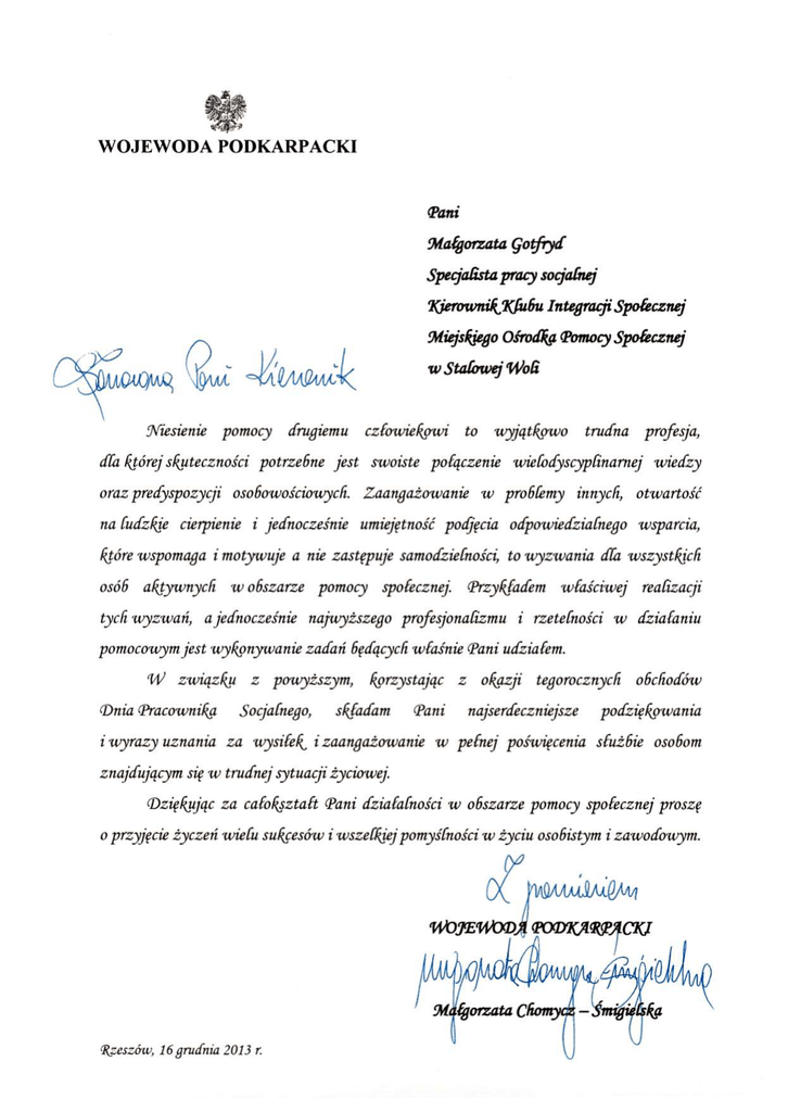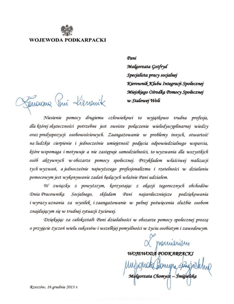 WOJEWODA PODKARPACKI (Pani Małgorzata gotfryd Specjalista pracy socjalnej 7ęjerownikJl(fu6u Integracji Społecznej Miejskjego Ośrodkg Pomocy Społecznej \|jwi w Stołowej 'Woli ^AIMAA^ %riesienie pomocy drugiemu człowiekowi to wyjątkowo trudna profesja, dła której skuteczności potrzebne jest swoiste połączenie wielodyscyplinarnej wiedzy oraz predyspozycji osobowościowych. Zaangażowanie w problemy innych, otwartość na Cudzkje cierpienie i jednocześnie umiejętność podjęcia odpowiedzialnego wsparcia, które wspomaga i motywuje a nie zastępuje samodzielności, to wyzwania dla wszystkich osób aktywnych w obszarze pomocy społecznej. Przykładem tych wyzwań, właściwej realizacji a jednocześnie najwyższego profesjonalizmu i rzetelności w działaniu pomocoitym jest wykonywanie zadań będących właśnie Pani udziałem. dU związku z powyższym, korzystając z Dnia Pracownika Socjalnego, składam i wyrazy uznania za wyńlef Pani okazji tegorocznych obchodów najserdeczniejsze podziękowania i zaangażowanie w pełnej poświęcenia służbie osobom znajdującym się w trudnej sytuacji życiowej. Dziękując za całokształt Pani działalności w obszarze pomocy społecznej proszę o przyjęcie życzeń wielu sukcesów i wszelkiej pomyślności w życiu osobistym i zawodowym. MAAMŚM^M 'WOJEWODĄ PODKAPPĄCKJ (Rzeszów, 16 grudnia 2013 r. CZŁOWIEK - NAJLEPSZA INWESTYCJA tX KAPITAŁ LUDZKI f""\ NARODOWA STRATEGIA SPÓJNOŚCI rSEOP!fi "^SSSSS! FUNDUSZ SPOŁECZNY B | ^ | PROJEKI WSPOlHNANSOWANT ZE SROOKOW UNII (UROPI|SKI[| W RAMACH EUROPEJSKIEGO rUNDUSZU SPOIECZNEGO (Podziękowanie za prelekcję i podzielenie się do6rymi praktykami realizacji projektu systemowego podczas (jrupowego Spotkania (Doradczego pt. „Metody iformy pracy z osobami zagrożonymi wykluczeniem społecznym" dla (Pani Małgorzaty gotfryd %ierownikjProjektu w Miejskim Ośrodku (Pomocy Społecznej w Stałowej Woli Mariol Zajdel-Ostrowska Rzeszów, 26 września 2012r. ,Nie w tym wart jest c z ł o w i e k co przemyślał i przeżył, ale co zrobił dobrego w świecie" Aleksander Kamiński z okazji Dnia Pracownika Socjalnego dla Pani Małgorzaty Gotfryd W tym wyjątkowym dniu składam Pani wyrazy uznania za szczególne zaangażowanie w niesienie pomocy osobom zagrożonym wykluczeniem społecznym, nowatorskie wdrażanie programów ukierunkowanych na rozwiązywanie trudnych problemów oraz ponadprzeciętną gotowość do współpracy z innymi osobami i podmiotami współdziałającymi w obszarze szeroko rozumianego dobra społecznego. Składam również serdeczne życzenia wszelkiej pomyślności, satysfakcji płynącej z wypełnianych zadań, społecznego uznania oraz spełnienia tak w życiu zawodowym jak i prywatnym. Niech Pani działania będą zawsze powodem do dumy oraz ludzkiej wdzięczności. R E KT Ośrodka Pomocy _iŁ.Staiow«) Woi' Piotr Stalowa Wola. 21 listopad 2014 r. Pierścionek STOWARZYSZENIE Ruch Pomocy Psychologicznej "INTŁCCAC JA" Stalowa Wola, dnia 08.08.2016r. ui Polna 18, 37-464 Stalowa Wola REGOM €90240630. NIP ?13-10-40-6*4 Opinia dotycząca działalności Miejskiego Ośrodka Pomocy Społecznej w Stalowej Woli Stowarzyszenie Ruch Pomocy Psychologicznej „INTEGRAGA" pozytywnie rekomenduje działalność Miejskiego Ośrodka Pomocy Społecznej w Stalowej Woli. Rekomendacja oparta jest o wieloletnią współpracę pomiędzy Stowarzyszeniem a Ośrodkiem dotyczącą działalności edukacyjnej, profilaktycznej, pomocowej oraz aktywizacyjnej. Jednym z przykładów wieloletniej współpracy jest współpraca na linii MOPS - SOWilK. Pracownicy Miejskiego Ośrodka Pomocy Społecznej w Stalowej Woli z pełnym zaangażowaniem i profesjonalizmem wspierają działania Stalowowolskiego Ośrodka Wsparcia i Interwencji Kryzysowej (SOWilK) - prowadzonego od 2008 roku przez Stowarzyszenie „INTEGRAGA". Miejski Ośrodek Pomocy Społecznej w Stalowej Woli jest inicjatorem wielu działań, programów oraz projektów skierowanych do mieszkańców Gminy. W 2014 roku jako Stowarzyszenie mieliśmy ogromną przyjemność realizować z Ośrodkiem projekt partnerski pn. Program Rewitalizacji Społecznej „Od rewitalizacji do integracji". Program w swych celach zakładał zwiększenie aktywności zawodowej i społecznej wśród młodych mieszkańców osiedla Śródmieście w Stalowej Woli w okresie od stycznia do listopada 2014 r. poprzez działalność Klubu Integracji Społecznej i Centrum Aktywnej Młodzieży. Wypracowane wspólnie standardy współpracy partnerskiej pomiędzy Ośrodkiem a Stowarzyszeniem pozwoliły w pełni zrealizować wszystkie założenia projektu. Osobiście uważam realizację w/w projektu partnerskiego jako dobrą praktykę i ogromny sukces. Działania podejmowane przez Stowarzyszenie na rzecz osób zagrożonych wykluczeniem społecznym w dalszym ciągu są kontynuowane - również we współpracy z Ośrodkiem i Klubem Integracji Społecznej. Nieoceniona jest również energia i otwarte podejście do każdego zadania oraz propozycji Dyrektora Miejskiego Ośrodka Pomocy Społecznej w Stalowej Woli - Pana Piotra Pierścionka, dzięki któremu możliwa jest realizacja różnorakich przedsięwzięć służących społeczności lokalnej. Na uznanie zasługuje również Pani Małgorzata Gotfryd i jej zaangażowanie w pracę na rzecz Klubu Integracji Społecznej działającego w ramach Ośrodka. Reasumując, Miejski Ośrodek Pomocy Społecznej w Stalowej Woli posiada doświadczenie i kadrę przygotowaną do pracy na rzecz osób potrzebujących wsparcia. Pracownicy wykazują się ogromną życzliwością, pomysłowością i kreatywnością w swojej działalności. Kompetencja, rzetelność i przyjemna atmosfera kontaktów podczas współpracy sprawia, że z przyjemnością rekomendujemy działalność Ośrodka jako partnera profesjonalnego, który zapewnia wysoki poziom świadczonych usług. PREZES Z A R Z Ą D U STOWARZYSZENIA Ruch Pomocy Psychologicznej Edy a