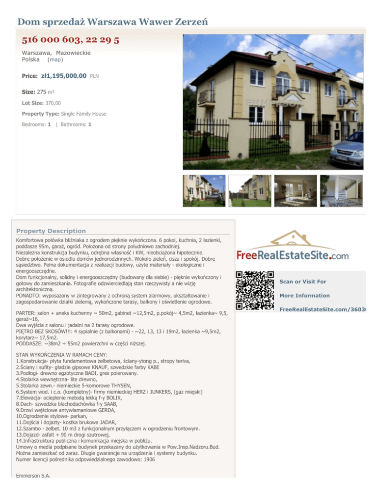 Dom sprzedaż Warszawa Wawer Zerzeń 516 000 603, 22 29 5 Warszawa, Mazowieckie Polska (map) Price: zł1,195,000.00 PLN Size: 275 m² Lot Size: 370,00 Property Type: Single Family House Bedrooms: 1 | Bathrooms: 1 Property Description Komfortowa połówka bliźniaka z ogrodem pięknie wykończona. 6 pokoi, kuchnia, 2 łazienki, poddasze 95m, garaż, ogród. Położona od strony południowo zachodniej. Niezależna konstrukcja budynku, odrębna własność i KW, nieobciążona hipotecznie. Dobre położenie w osiedlu domów jednorodzinnych. Wokoło zieleń, cisza i spokój. Dobre sąsiedztwo. Pełna dokumentacja z realizacji budowy, użyte materiały - ekologiczne i energooszczędne. Dom funkcjonalny, solidny i energooszczędny (budowany dla siebie) - pięknie wykończony i gotowy do zamieszkania. Fotografie odzwierciedlają stan rzeczywisty a nie wizję architektoniczną. PONADTO: wyposażony w zintegrowany z ochroną system alarmowy, ukształtowanie i zagospodarowanie działki zielenią, wykończone tarasy, balkony i oświetlenie ogrodowe. PARTER: salon + aneks kuchenny ~ 50m2, gabinet ~12,5m2, p.pokój~ 4,5m2, łazienka~ 9,5, garaż~16, Dwa wyjścia z salonu i jadalni na 2 tarasy ogrodowe. PIĘTRO BEZ SKOSÓW!!!: 4 sypialnie (z balkonami) - ~22, 13, 13 i 19m2, łazienka ~9,5m2, korytarz~ 17,5m2. PODDASZE: ~38m2 + 55m2 powierzchni w części niższej. STAN WYKOŃCZENIA W RAMACH CENY: 1.Konstrukcja- płyta fundamentowa żelbetowa, ściany-ytong p., stropy teriva, 2.Ściany i sufity- gładzie gipsowe KNAUF, szwedzkie farby KABE 3.Podłogi- drewno egzotyczne BADI, gres polerowany. 4.Stolarka wewnętrzna- lite drewno, 5.Stolarka zewn.- niemieckie 5-komorowe THYSEN, 6.System wod. i c.o. (kompletny)- firmy niemieckiej HERZ i JUNKERS, (gaz miejski) 7.Elewacja- ocieplenie metodą lekką f-y BOLIX, 8.Dach- szwedzka blachodachówka f-y SAAB, 9.Drzwi wejściowe antywłamaniowe GERDA, 10.Ogrodzenie stylowe- parkan, 11.Dojścia i dojazty- kostka brukowa JADAR, 12.Szambo - żelbet. 10 m3 z funkcjonalnym przyłączem w ogrodzeniu frontowym. 13.Dojazd- asfalt + 90 m drogi szutrowej, 14.Infrastruktura publiczna i komunikacja miejska w pobliżu. Umowy o media podpisane budynek przekazany do użytkowania w Pow.Insp.Nadzoru.Bud. Można zamieszkać od zaraz. Długie gwarancje na urządzenia i systemy budynku. Numer licencji pośrednika odpowiedzialnego zawodowo: 1906 Emmerson S.A. Scan or Visit For More Information FreeRealEstateSite.com/360306 Year Built: 2008 Garage Size: 1 Car