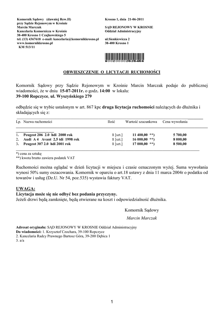 Komornik Sądowy (dawniej Rew.II) przy Sądzie Rejonowym w Krośnie Marcin Marczak Kancelaria Komornicza w Krośnie 38-400 Krosno 1 Czajkowskiego 5 tel. (13) 4367618 e-mail: [email protected] www.komornikkrosno.pl KM 513/11 Krosno 1, dnia 21-06-2011 SĄD REJONOWY W KROSNIE Oddział Administracyjny ul.Sienkiewicza 2 38-400 Krosno 1 *0020000262646* OBWIESZCZENIE O LICYTACJI RUCHOMOŚCI Komornik Sądowy przy Sądzie Rejonowym w Krośnie Marcin Marczak podaje do publicznej wiadomości, że w dniu 15-07-2011r. o godz. 14:00 w lokalu: 39-100 Ropczyce, ul. Wyszyńskiego 279 odbędzie się w trybie ustalonym w art. 867 kpc druga licytacja ruchomości należących do dłużnika i składających się z: _______________________________________________________________________________________________________________________ Lp. Nazwa ruchomości Ilość Wartość szacunkowa Cena wywołania _____________________________________________________________________________________________________ ____________________ 1. Peugeot 206 2.0 hdi 2000 rok 1 [szt.] 11 400,00 **) 5 700,00 2. Audi A 4 Avant 2,5 tdi 1998 rok 1 [szt.] 16 000,00 **) 8 000,00 3. Peugeot 307 2.0 hdi 2001 rok 1 [szt.] 17 000,00 **) 8 500,00 _______________________________________________________________________________________________________________________ *) cena za sztukę **) kwota brutto zawiera podatek VAT Ruchomości można oglądać w dzień licytacji w miejscu i czasie oznaczonym wyżej. Suma wywołania wynosi 50% sumy oszacowania. Komornik w oparciu o art.18 ustawy z dnia 11 marca 2004r o podatku od towarów i usług (Dz.U. Nr 54, poz.535) wystawia faktury VAT. UWAGA: Licytacja może się nie odbyć bez podania przyczyny. Jeżeli drzwi będą zamknięte, będą otwierane na koszt i odpowiedzialność dłużnika. Komornik Sądowy Marcin Marczak Adresat oryginału: SĄD REJONOWY W KROSNIE Oddział Administracyjny Do wiadomości: 1. Krzysztof Czochara, 39-100 Ropczyce 2. Kancelaria Radcy Prawnego Bartosz Góra, 39-200 Dębica 1 3. a/a 1