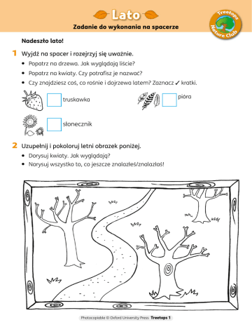 Zadanie do wykonania na spacerze Nadeszło lato! 1 Wyjdź na spacer i rozejrzyj się uważnie. • Popatrz na drzewa. Jak wyglądają liście? • Popatrz na kwiaty. Czy potrafisz je nazwać? • Czy znajdziesz coś, co rośnie i dojrzewa latem? Zaznacz ✓ kratki. truskawka słonecznik 2 Uzupełnij i pokoloruj letni obrazek poniżej. • Dorysuj kwiaty. Jak wyglądają? • Narysuj wszystko to, co jeszcze znalazłeś/znalazłaś! Photocopiable © Oxford University Press Treetops 1 pióra Zadanie do wykonania w domu lub w szkole Mamy lato! Latem w przyrodzie wiele się dzieje. Jeśli posłuchasz uważnie, usłyszysz brzęczenie owadów i odgłosy ptaków. Pszczoły są zajęte zbieraniem pyłku z kwiatów. Mrówki szukają na ziemi pożywienia. Młode ptaki uczą się latać. Gąsienice zmieniły się w motyle i można je zobaczyć w parkach, ogrodach i na wsi. 1 Popatrz na letni obrazek poniżej. Czy potrafisz odnaleźć… 6 pszczół 5 młodych ptaków 3 gąsienice 2 ścieżki mrówek Weź w kółko odnalezione stworzenia. Kiedy je znajdziesz, zaznacz znakiem ✓ odpowiednie kratki. 2 Następnym razem, kiedy wyjdziesz na spacer, spróbuj wypatrzyć zajęte pracą owady lub ptaki. Photocopiable © Oxford University Press Treetops 1