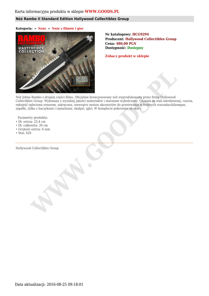 Karta informacyjna produktu w sklepie WWW.GOODS.PL Nóż Rambo II Standard Edition Hollywood Collectibles Group Kategoria: » Noże » Noże z filmów i gier Nr katalogowy: HCG9294 Producent: Hollywood Collectibles Group Cena: 480,00 PLN Dostępność: Dostępny S. PL Zobacz produkt w sklepie Parametry produktu: • Dł. ostrza: 25,4 cm • Dł. całkowita: 39 cm • Grubość ostrza: 6 mm • Stal: 420 W W W .G Hollywood Collectibles Group O O D Nóż Johna Rambo z drugiej części filmu. Oficjalnie licencjonowany nóż wyprodukowany przez firmę Hollywood Collectibles Group. Wykonany z wysokiej jakości materiałów i starannie wykończony. Głownia ze stali nierdzewnej, czarna, rękojeść opleciona sznurem, zakręcana, wewnątrz zestaw akcesoriów do przetrwania w trudnych warunkach(kompas, zapałki, żyłka z haczykami i ciężarkami, skalpel, igły). W komplecie pokrowiec ze skóry. Data aktualizacji: 2016-08-25 09:18:01