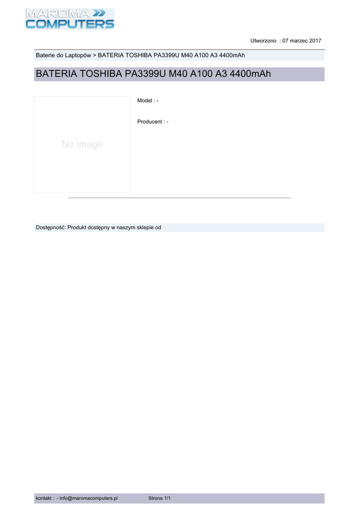 Utworzono : 07 marzec 2017 Baterie do Laptopów > BATERIA TOSHIBA PA3399U M40 A100 A3 4400mAh BATERIA TOSHIBA PA3399U M40 A100 A3 4400mAh Model : - s r te Producent : - No image C a Dostępność: Produkt dostępny w naszym sklepie od m ro a M kontakt : - [email protected] Strona 1/1 m o u p