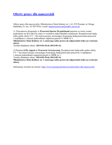 Oferty pracy dla nauczycieli Oferty pracy dla nauczyciela: Młodzieżowy Dom Kultury nr 1, 61-555 Poznań, ul. Droga Dębińska 21; tel.: 61 8337910; e-mail: [email protected] 1) Pracodawca dysponuje w Pracowni Sportu 20 godzinami pensum co może zostać podzielone na dwa lub trzy etaty w wymiarze indywidualnie ustalonym. Rozpatrywane będą tylko pełne oferty CV + list motywacyjny zawierający koncepcję funkcjonowania pracowni i współpracy z innymi jednostkami organizacyjnymi w MDK nr 1. Młodzieżowy Dom Kultury nr 1 zastrzega sobie prawo do odpowiedzi tylko na wybrane oferty. Termin składania oferty: 2014-04-18 do 2014-05-16. 2) Pensum 6/18; zajęcia w Pracowni Artystycznej. Rozpatrywane będą tylko pełne oferty CV + list motywacyjny zawierający koncepcję funkcjonowania pracowni i współpracy z innymi jednostkami organizacyjnymi w MDK nr 1. Termin składania oferty: 2014-04-18 do 2014-05-16. Młodzieżowy Dom Kultury nr 1 zastrzega sobie prawo do odpowiedzi tylko na wybrane oferty. Informacje również na stronie: http://www.poznan.pl/mim/oswiata/oferty-dla-nauczycieli/