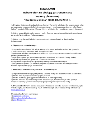 REGULAMIN naboru ofert na obsługę gastronomiczną imprezy plenerowej "Dni Gminy Solina" 30.04-03.05 2016 r. 1. Dyrektor Gminnego Ośrodka Kultury, Sportu i Turystyki w Polańczyku ogłasza nabór ofert na przyznanie wyłączności obsługi gastronomicznej - catering podczas imprezy „Dni Gminy Solina” w dniach 30 kwietnia -03 maja 2016 r. w Polańczyku – Amfiteatr przy ul. Zdrojowej 2. Oferty mogą składać osoby prawne i osoby fizyczne prowadzące działalność gospodarczą na terenie Województwa Podkarpackiego. 3. Opłata za wyłączność obsługi gastronomicznej ustalona będzie w formie opłaty jednorazowej. 4. Wymagania zamawiającego: 1) zapewnienia minimum 300 miejsc siedzących, w tym pod zadaszeniem 200 (parasole + stoły i ławy) oraz namiotu o pow. minimum 100 m2 2) przygotowanie i sprzedaż potraw z grilla oraz z przyczep gastronomicznych – minimum 2 punkty gastronomiczne, 3) dystrybucji piwa (po uprzednim uzyskaniu zezwolenia w Urzędzie Gminy Solina) w kubkach plastikowych, puszkach - minimum 2 rolbary, 4) zapewnienie sprzedaży art. spożywczych i napojów bezalkoholowych, 5) utrzymanie czystości (na wskazanym przez organizatora terenie dla usługi) w trakcie trwania imprezy oraz po jej zakończeniu. 5. Informacje o charakterze prawnym i ekonomicznym: 1) Wykonawca może złożyć jedną ofertę. Złożonej oferty nie można wycofać, ani zmieniać. 2) Oferta musi być sporządzona w języku polskim. 3) Ofertę składa się, pod rygorem nieważności, w formie pisemnej. 4) Oferta powinna być napisana pismem maszynowym, komputerowym albo ręcznym w sposób czytelny (pismem czytelnym) i podpisana przez uprawnioną osobę. 6. Dokumenty ofertowe można otrzymać w Gminnym Ośrodku Kultury, Sportu i Turystyki w Polańczyku, ul. Bieszczadzkiej 18; 38-610 Polańczyk lub pobrać ze strony internetowej www.goksolina.pl Dokumenty ofertowe zawierają: 1) regulamin konkursu; 2) formularz oferty konkursowej 3) projekt umowy; 7. Oferta powinna zawierać: 1) nazwę firmy, adres, NIP, telefon, 2) dla osób prawnych – aktualny wypis z rejestru KRS lub dla osób fizycznych zaświadczenie o wpisie do ewidencji działalności gospodarczej, 3) rodzaj asortymentu, 4) ilość punktów dystrybucji piwa, 5) ilość punktów gastronomicznych, 6) ilość zabezpieczonych miejsc siedzących, w tym pod zadaszeniem dla uczestników imprezy, 7) oświadczenia o: - posiadaniu przez oferenta stosownych uprawnień do prowadzenia działalności handlowogastronomicznej, - posiadaniu niezbędnej wiedzy i doświadczenia oraz dysponowaniu przez oferenta potencjału technicznego i osobowego zdolnego do obsługi gastronomicznej. 8. Termin składania ofert: ofertę należy złożyć w terminie do dnia 01.04.2016 do godz.15.30 w nieprzejrzystej, zamkniętej kopercie/opakowaniu w sposób gwarantujący zachowanie poufności jej treści oraz zabezpieczającej jej nienaruszalność do terminu otwarcia ofert. Koperta/opakowanie zawierające ofertę winno być zaadresowane do Zamawiającego na adres podany na stronie tytułowej Regulaminu opatrzona nazwą, dokładnym adresem wykonawcy oraz oznaczone w sposób następujący: OFERTA NA PRZYZNANIE WYŁĄCZNOŚCI OBSŁUGI GASTRONOMICZNEJ - KATERING PODCZAS IMPREZ „DNI GMINY SOLINA” W DNIACH 30.04-03.05. 2016 R. 9. Miejsce składania ofert: Gminny Ośrodek Kultury, Sportu i Turystyki w Polańczyku , ul. Bieszczadzka 18; 38-610 Polańczyk lub można przesłać za pośrednictwem poczty (decyduje data wpływu). Wykonawca na prośbę otrzyma pisemne potwierdzenie złożenia oferty. 10. Oferty złożone po terminie nie będą brane pod uwagę. 11. Rozstrzygnięcie konkursu ofert i negocjacje w wypadku identycznych ofert odbędzie się w dniu 08.04.2016 r. o godz.12.00 w Gminnym Ośrodku Kultury, Sportu i Turystyki w Polańczyku, ul. Bieszczadzka 18 12. O wyborze oferty zadecyduje komisja powołana przez Dyrektora GOKSiT Polańczyk, biorąc po uwagę zaoferowaną kwotę oraz przedstawiony w ofercie zakres świadczonych usług. 13. Z postępowania zostanie sporządzony protokół. 14. W przypadku równoważności ofert pod względem cenowym, Zamawiający przeprowadzi dodatkową ustną rozmowę z tymi Wykonawcami, którzy je złożyli, oni zaś nie mogą zaproponować ceny niższej niż w złożonej ofercie. Ceny te zostaną odnotowane w protokole. 15. Wykonawca, którego oferta zostanie uznana za najkorzystniejszą zobowiązany jest do zawarcia umowy w terminie i miejscu wskazanym przez organizatora (informacja zostanie przekazana telefonicznie, pisemnie, fax-em lub e-mailem). W przypadku odmowy lub uchylania się od zawarcia umowy we wskazanym terminie, organizator wezwie do zawarcia umowy kolejnego Wykonawcę, który zaproponował najwyższą cenę za wyłączność obsługi, bez powtarzania procedury wyboru Wykonawcy usługi. 16. Dyrektor GOKSiT Polańczyk zastrzega sobie możliwość odwołania konkursu bez podania przyczyny. 17. Osoba upoważniona do kontaktów z Wykonawcami w zakresie opisanym w Regulaminie konkursu jest - Dyrektor GOKSiT Polańczyk Pan Krzysztof Pecka , tel. 13 469 24 95.