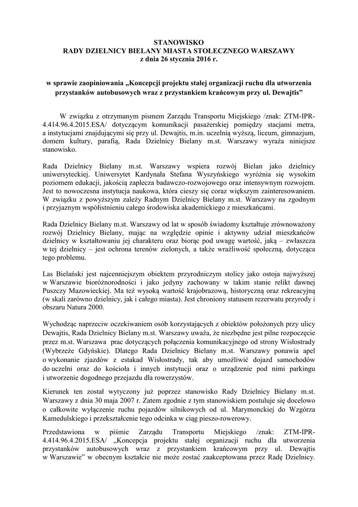 STANOWISKO RADY DZIELNICY BIELANY MIASTA STOŁECZNEGO WARSZAWY z dnia 26 stycznia 2016 r. w sprawie zaopiniowania „Koncepcji projektu stałej organizacji ruchu dla utworzenia przystanków autobusowych wraz z przystankiem krańcowym przy ul. Dewajtis” W związku z otrzymanym pismem Zarządu Transportu Miejskiego /znak: ZTM-IPR4.414.96.4.2015.ESA/ dotyczącym komunikacji pasażerskiej pomiędzy stacjami metra, a instytucjami znajdującymi się przy ul. Dewajtis, m.in. uczelnią wyższą, liceum, gimnazjum, domem kultury, parafią, Rada Dzielnicy Bielany m.st. Warszawy wyraża niniejsze stanowisko. Rada Dzielnicy Bielany m.st. Warszawy wspiera rozwój Bielan jako dzielnicy uniwersyteckiej. Uniwersytet Kardynała Stefana Wyszyńskiego wyróżnia się wysokim poziomem edukacji, jakością zaplecza badawczo-rozwojowego oraz intensywnym rozwojem. Jest to nowoczesna instytucja naukowa, która cieszy się coraz większym zainteresowaniem. W związku z powyższym zależy Radnym Dzielnicy Bielany m.st. Warszawy na zgodnym i przyjaznym współistnieniu całego środowiska akademickiego z mieszkańcami. Rada Dzielnicy Bielany m.st. Warszawy od lat w sposób świadomy kształtuje zrównoważony rozwój Dzielnicy Bielany, mając na względzie opinie i aktywny udział mieszkańców dzielnicy w kształtowaniu jej charakteru oraz biorąc pod uwagę wartość, jaką – zwłaszcza w tej dzielnicy – jest ochrona terenów zielonych, a także wrażliwość społeczną, dotycząca tego problemu. Las Bielański jest najcenniejszym obiektem przyrodniczym stolicy jako ostoja najwyższej w Warszawie bioróżnorodności i jako jedyny zachowany w takim stanie relikt dawnej Puszczy Mazowieckiej. Ma też wysoką wartość krajobrazową, historyczną oraz rekreacyjną (w skali zarówno dzielnicy, jak i całego miasta). Jest chroniony statusem rezerwatu przyrody i obszaru Natura 2000. Wychodząc naprzeciw oczekiwaniem osób korzystających z obiektów położonych przy ulicy Dewajtis, Rada Dzielnicy Bielany m.st. Warszawy uważa, że niezbędne jest pilne rozpoczęcie przez m.st. Warszawa prac dotyczących połączenia komunikacyjnego od strony Wisłostrady (Wybrzeże Gdyńskie). Dlatego Rada Dzielnicy Bielany m.st. Warszawy ponawia apel o wykonanie zjazdów z estakad Wisłostrady, tak aby umożliwić dojazd samochodów do uczelni oraz do kościoła i innych instytucji oraz o urządzenie pod nimi parkingu i utworzenie dogodnego przejazdu dla rowerzystów. Kierunek ten został wytyczony już poprzez stanowisko Rady Dzielnicy Bielany m.st. Warszawy z dnia 30 maja 2007 r. Zatem zgodnie z tym stanowiskiem postuluje się docelowo o całkowite wyłączenie ruchu pojazdów silnikowych od ul. Marymonckiej do Wzgórza Kamedulskiego i przekształcenie tego odcinka w ciąg pieszo-rowerowy. Przedstawiona w piśmie Zarządu Transportu Miejskiego /znak: ZTM-IPR4.414.96.4.2015.ESA/ „Koncepcja projektu stałej organizacji ruchu dla utworzenia przystanków autobusowych wraz z przystankiem krańcowym przy ul. Dewajtis w Warszawie” w obecnym kształcie nie może zostać zaakceptowana przez Radę Dzielnicy. Nie mniej jednak Rada Dzielnicy Bielany m.st. Warszawy chce rozwiązać problem komunikacji ulicą Dewajtis. Docelowo jedyne satysfakcjonujące rozwiązanie, to umożliwienie dojazdu od strony ul. Wybrzeże Gdyńskie oraz całkowite zamknięcie ulicy Dewajtis dla ruchu samochodowego. Rada Dzielnicy Bielany m.st. Warszawa jest skłonna rozpatrzyć i zaopiniować rozwiązanie dopuszczające na czas realizacji inwestycji, ruch wahadłowy autobusu elektrycznego na ulicy Dewajtis. Ruch ten nie może jednak odbywać się na zasadach przedstawionych w przygotowanej przez Zarząd Transportu Miejskiego koncepcji, którą Rada Dzielnicy Bielany opiniuje negatywnie. Rada Dzielnicy Bielany m.st. Warszawy wnosi do Zarządu Transportu Miejskiego o przygotowanie nowej koncepcji, która uwzględni postulaty wymienione w dalszej części stanowiska. Dlatego Rada Dzielnicy Bielany oczekuje od Zarządu Transportu Miejskiego przedstawienia nowej, kompleksowej i uzgodnionej z odpowiednimi podmiotami oraz instytucjami koncepcji projektu stałej organizacji ruchu na ulicy Dewajtis, która spełni następujące postulaty mieszkańców: Autobus elektryczny Niedopuszczalne jest użycie przez ZTM oraz jego podwykonawców, nawet w sytuacjach awaryjnych autobusów innego typu, m.in. z silnikiem benzynowym lub diesla, do kursowania po ulicy Dewajtis, a także autobusów hybrydowych, co wprost przewiduje przedstawiona Radzie koncepcja. Zimowe utrzymanie drogi Wyklucza się całkowicie używanie na ul. Dewajtis środków chemicznych, a w szczególności soli. Trasa autobusu Tymczasowa trasa autobusu powinna łączyć zabudowania przy ul. Dewajtis albo z węzłem komunikacyjnym Młociny (metro, autobusy, tramwaje) poprzez ul. Marymoncką i ul. Przy Agorze, albo z węzłem komunikacyjnym Marymont (metro, autobusy, tramwaje) poprzez ul. Marymoncką. Nie do przyjęcia jest trasa autobusu wytyczona przez ul. Lindego, która spowoduje zwiększone natężenie ruchu na tym odcinku, będącym prostym przedłużeniem bardzo ruchliwej Alei Reymonta. Rondo Hutników Warszawskich nie jest przystosowane do zawracania na nim autobusów, a w ostatnim czasie odnotowano w tym miejscu wypadki śmiertelne, a Lasek Lindego to również jeden z chronionych zielonych obszarów Bielan. Nawierzchnia ulicy Dewajtis Niedopuszczalna jest jakakolwiek ingerencja w nawierzchnię jezdni ulicy Dewajtis (poszerzanie, zatoki przystankowe, modyfikacja nawierzchni), jedynie możliwa jest modyfikacja ograniczników ruchu i przystosowanie ich do potrzeb komunikacji autobusowej. Rada Dzielnicy Bielany nie może zaopiniować pozytywnie żadnej przedstawionej przez ZTM koncepcji bez opinii Zarządu Dróg Miejskich, dotyczącej kwestii parametrów w zakresie wytrzymałości nawierzchni i szerokości jezdni, których wymaga konkretny model autobusu. Pętla autobusowa i przystanki Wykonanie miejsca sł