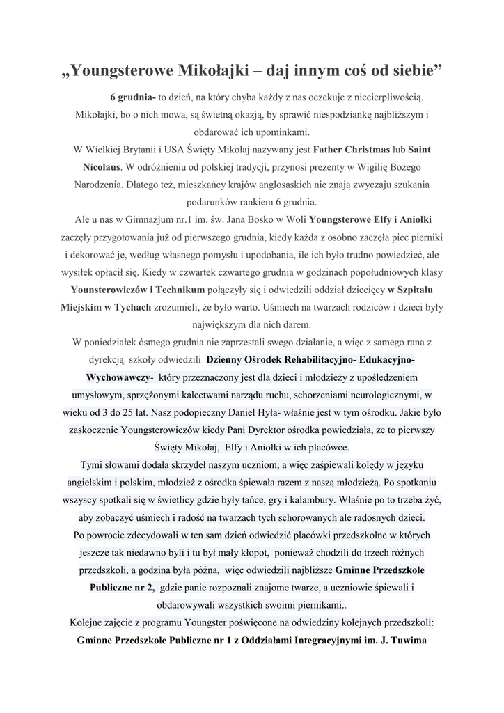 „Youngsterowe Mikołajki – daj innym coś od siebie” 6 grudnia- to dzień, na który chyba każdy z nas oczekuje z niecierpliwością. Mikołajki, bo o nich mowa, są świetną okazją, by sprawić niespodziankę najbliższym i obdarować ich upominkami. W Wielkiej Brytanii i USA Święty Mikołaj nazywany jest Father Christmas lub Saint Nicolaus. W odróżnieniu od polskiej tradycji, przynosi prezenty w Wigilię Bożego Narodzenia. Dlatego też, mieszkańcy krajów anglosaskich nie znają zwyczaju szukania podarunków rankiem 6 grudnia. Ale u nas w Gimnazjum nr.1 im. św. Jana Bosko w Woli Youngsterowe Elfy i Aniołki zaczęły przygotowania już od pierwszego grudnia, kiedy każda z osobno zaczęła piec pierniki i dekorować je, według własnego pomysłu i upodobania, ile ich było trudno powiedzieć, ale wysiłek opłacił się. Kiedy w czwartek czwartego grudnia w godzinach popołudniowych klasy Younsterowiczów i Technikum połączyły się i odwiedzili oddział dziecięcy w Szpitalu Miejskim w Tychach zrozumieli, że było warto. Uśmiech na twarzach rodziców i dzieci były największym dla nich darem. W poniedziałek ósmego grudnia nie zaprzestali swego działanie, a więc z samego rana z dyrekcją szkoły odwiedzili Dzienny Ośrodek Rehabilitacyjno- EdukacyjnoWychowawczy- który przeznaczony jest dla dzieci i młodzieży z upośledzeniem umysłowym, sprzężonymi kalectwami narządu ruchu, schorzeniami neurologicznymi, w wieku od 3 do 25 lat. Nasz podopieczny Daniel Hyła- właśnie jest w tym ośrodku. Jakie było zaskoczenie Youngsterowiczów kiedy Pani Dyrektor ośrodka powiedziała, ze to pierwszy Święty Mikołaj, Elfy i Aniołki w ich placówce. Tymi słowami dodała skrzydeł naszym uczniom, a więc zaśpiewali kolędy w języku angielskim i polskim, młodzież z ośrodka śpiewała razem z naszą młodzieżą. Po spotkaniu wszyscy spotkali się w świetlicy gdzie były tańce, gry i kalambury. Właśnie po to trzeba żyć, aby zobaczyć uśmiech i radość na twarzach tych schorowanych ale radosnych dzieci. Po powrocie zdecydowali w ten sam dzień odwiedzić placówki przedszkolne w których jeszcze tak niedawno byli i tu był mały kłopot, ponieważ chodzili do trzech różnych przedszkoli, a godzina była późna, więc odwiedzili najbliższe Gminne Przedszkole Publiczne nr 2, gdzie panie rozpoznali znajome twarze, a uczniowie śpiewali i obdarowywali wszystkich swoimi piernikami.. Kolejne zajęcie z programu Youngster poświęcone na odwiedziny kolejnych przedszkoli: Gminne Przedszkole Publiczne nr 1 z Oddziałami Integracyjnymi im. J. Tuwima w Woli, gdzie czekali na uczniów od samego rana, ale niespodzianka, znowu zostali rozpoznani, a w Gminnym Przedszkolu Publicznym nr 3 im. Kubusia Puchatka w Woli Pani Dyrektor również z trudem rozpoznała swoich wychowanków, ale broda, poważny głos zrobiły swoje :- ) Wspólne zdjęcie ze Św. Mikołajem, aniołkami i elfami to było cos niesamowitego. A pod koniec wyprawy odwiedziły najmłodszych ze Szkoły Podstawowej nr 1 im B. Malinowskiego. Jestem bardzo dumna ze swoich podopiecznych, ponieważ motto pod którym działali prawie przez dwa tygodnie: „Youngsterowe Mikołajki – daj innym coś od siebie” w przypadku moich uczniów sprawdziło się, zachowanie, postawa, chęć dzielenia się z innymi w te świąteczne dni – to właśnie wszystko to co chcieliśmy osiągnąć. A oto moja grupa Święty Mikołaj - Dawid Doniecki Pomocnik Mikołaja- Michał Hurnik (grał na gitarze) Elfy: - Patrycja Faruga - Martyna Kempny - Gabriela Fuks - Magdalena Norek Aniołki: - Weronika Głąb - Emilia Stawowy - Katarzyna Sojka - Daria Czop - Ksenia Sporysz - Paulina Pałka Nauczyciel języka angielskiego Łarisa Doniecka