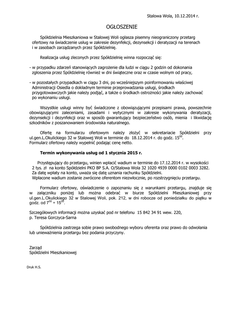 Stalowa Wola, 10.12.2014 r. OGŁOSZENIE Spółdzielnia Mieszkaniowa w Stalowej Woli ogłasza pisemny nieograniczony przetarg ofertowy na świadczenie usług w zakresie dezynfekcji, dezynsekcji i deratyzacji na terenach i w zasobach zarządzanych przez Spółdzielnię. Realizacja usług zleconych przez Spółdzielnię winna rozpocząć się: - w przypadku zdarzeń stanowiących zagrożenie dla ludzi w ciągu 2 godzin od dokonania zgłoszenia przez Spółdzielnię również w dni świąteczne oraz w czasie wolnym od pracy, - w pozostałych przypadkach w ciągu 3 dni, po wcześniejszym poinformowaniu właściwej Administracji Osiedla o dokładnym terminie przeprowadzania usługi, środkach przygotowawczych jakie należy podjąć, a także o środkach ostrożności jakie należy zachować po wykonaniu usługi. Wszystkie usługi winny być świadczone z obowiązującymi przepisami prawa, powszechnie obowiązującymi zaleceniami, zasadami i wytycznymi w zakresie wykonywania deratyzacji, dezynsekcji i dezynfekcji oraz w sposób gwarantujący bezpieczeństwo osób, mienia i likwidację szkodników z poszanowaniem środowiska naturalnego. Ofertę na formularzu ofertowym należy złożyć w sekretariacie Spółdzielni ul.gen.L.Okulickiego 32 w Stalowej Woli w terminie do 18.12.2014 r. do godz. 1500. Formularz ofertowy należy wypełnić podając cenę netto. przy Termin wykonywania usług od 1 stycznia 2015 r. Przystępujący do przetargu, winien wpłacić wadium w terminie do 17.12.2014 r. w wysokości 2 tys. zł na konto Spółdzielni PKO BP S.A. O/Stalowa Wola 32 1020 4939 0000 0102 0003 3282. Za datę wpłaty na konto, uważa się datę uznania rachunku Spółdzielni. Wpłacone wadium zostanie zwrócone oferentom niezwłocznie, po rozstrzygnięciu przetargu. Formularz ofertowy, oświadczenie o zapoznaniu się z warunkami przetargu, znajduje się w załączniku poniżej lub można odebrać w biurze Spółdzielni Mieszkaniowej przy ul.gen.L.Okulickiego 32 w Stalowej Woli, pok. 212, w dni robocze od poniedziałku do piątku w godz. od 700 ÷ 1500. Szczegółowych informacji można uzyskać pod nr telefonu 15 842 34 91 wew. 220, p. Teresa Gorczyca-Sarna Spółdzielnia zastrzega sobie prawo swobodnego wyboru oferenta oraz prawo do odwołania lub unieważnienia przetargu bez podania przyczyny. Zarząd Spółdzielni Mieszkaniowej Druk H.S. Formularz ofertowy na usługi w zakresie dezynfekcji, dezynsekcji i deratyzacji w zasobach Spółdzielni Mieszkaniowej w Stalowej Woli 1. Nazwa i adres usługodawcy: ……………………………………………………………………………………………………………………………. ……………………………………………………………………………………………………………………………. …………………………………………………………………………………………………………………………….. ……………………………………………………………………………………………………………………………. Nr telefonu: …………………………………… nr faksu: …………………………………………… adres e-mail: ……………………………………………………………………………………………………….. 2. Wartość zaoferowanych prac do wykonania w budynkach mieszkalnych: 1) deratyzacja korytarzy piwnicznych w budynkach, a/ niskich i wysokich ………. zł za korytarz w jednej klatce b/ typu „punktowiec” ……….. zł za klatkę; 2) dezynsekcja korytarzy piwnicznych w budynkach: a/ niskich i wysokich ………. zł za korytarz w jednej klatce b/ typu „punktowiec” .…….. zł za klatkę; 3) dezynsekcja klatek schodowych, korytarzy piwnicznych, zsypów w budynkach: a/ niskich ………. zł za klatkę i korytarz b/ wysokich ………. zł za klatkę, korytarz i zsyp c/ typu „punktowiec” ………. zł za klatkę, korytarz; 4) dezynsekcja odboju przy budynku - ………. zł za 1 mb; 5) deratyzacja – likwidacja gniazd gryzoni: a/ na trenie otwartym przy budynku ………. zł za 1 gniazdo b/ w budynku ………. zł za 1 gniazdo; 6) dezynfekcja i dezynsekcja rury zsypowej, szuflad zsypowych oraz pomieszczeń zsypowych na półpiętrze - ………. zł za klatkę; 7) dezynfekcja i dezynsekcja pomieszczeń zsypu znajdujących się na zewnątrz budynku - ………. zł za pomieszczenie; 8) deratyzacja pomieszczeń zsypu znajdujących się na zewnątrz budynku - ………. zł za pomieszczenie; 9) dezynsekcja – likwidacja gniazd os i szerszeni - ………. zł za 1 gniazdo; 10) dezynsekcja i deratyzacja altanek śmietnikowych - ………. zł za 1 altankę, 11) dezynsekcja mieszkań: a/ do 40 m2 pow.użytk. b/ do 65 m2 pow.użytk. c/ powyżej 65 m2 pow.użytk. - ……… zł za mieszkanie ……… zł za mieszkanie ……… zł za mieszkanie; 12) kompleksowa dezynsekcja budynku mieszkalnego (korytarze piwniczne, klatki schodowe i wszystkie lokale mieszkalne) ………. zł za mieszkanie; 13) dezynfekcja w mieszkaniu, w którym nastąpił zgon ……… zł za mieszkanie. 3. Prace wymienione w pkt 2 ust. 1 ÷ 13, wykonywane będą każdorazowo tylko na zlecenie Administracji Osiedla. 4. Oświadczam, że: 1/ jestem uprawniony do występowania w obrocie prawnym, 2/ posiadam niezbędną wiedzę, doświadczenie , zaplecze techniczne, sprzętowe, materiałowe oraz pracowników zdolnych do wykonania zamówienia, 3/ materiały użyte do wykonania przedmiotu zamówienia posiadają aktualne atesty i karty charakterystyki substancji chemicznych, szkodliwych lub niebezpiecznych oraz winny być dopuszczone przez Państwowy Zakład Higieny, 4/ opakowania po zużytych preparatach służących do wykonania usługi zutylizuje we własnym zakresie i na własny koszt, 5/ uważam się za związanym niniejszą ofertą na okres 30 dni, od terminu składania ofert, 6/ wyrażam zgodę na przetwarza